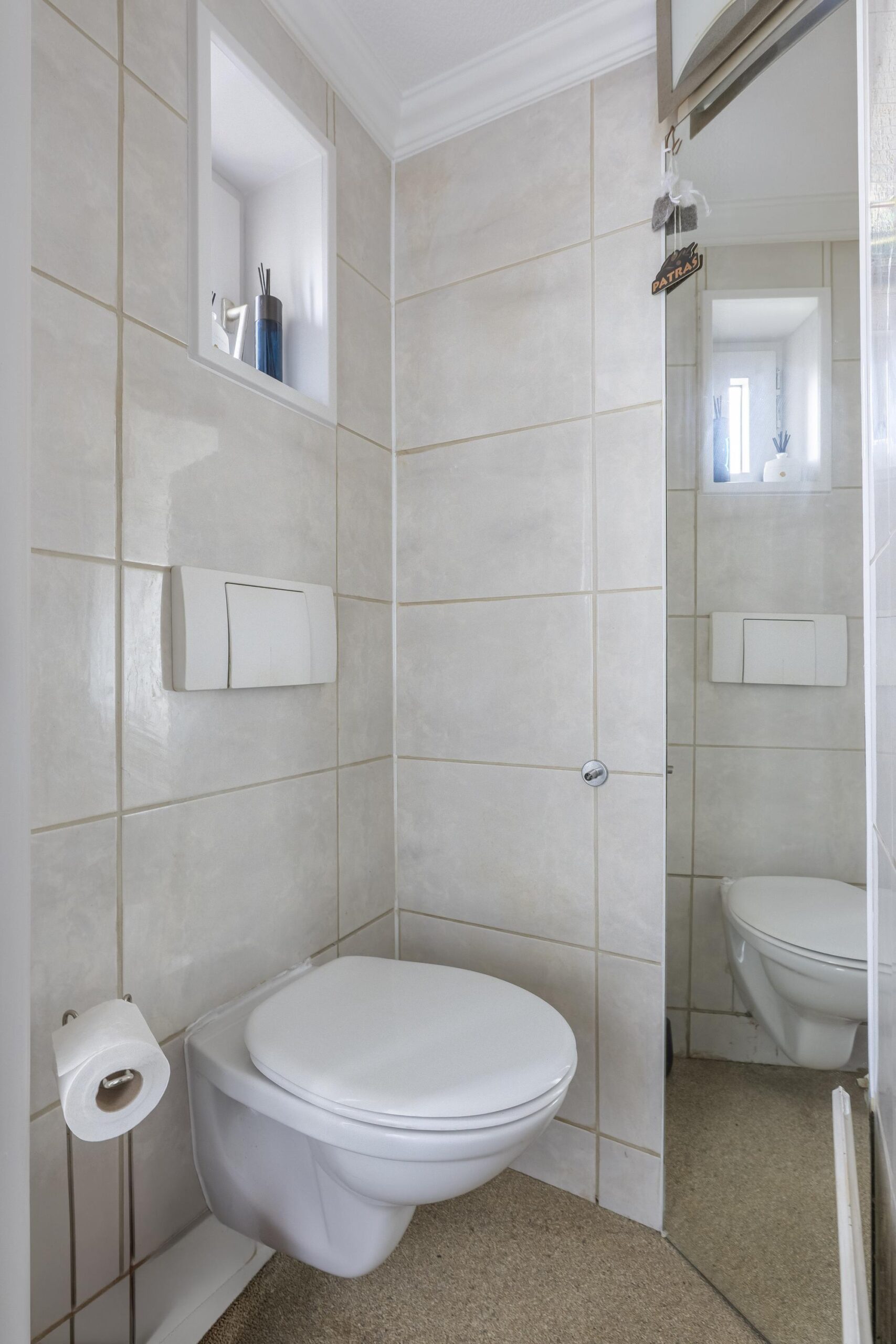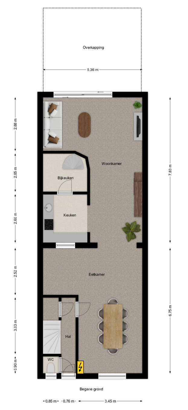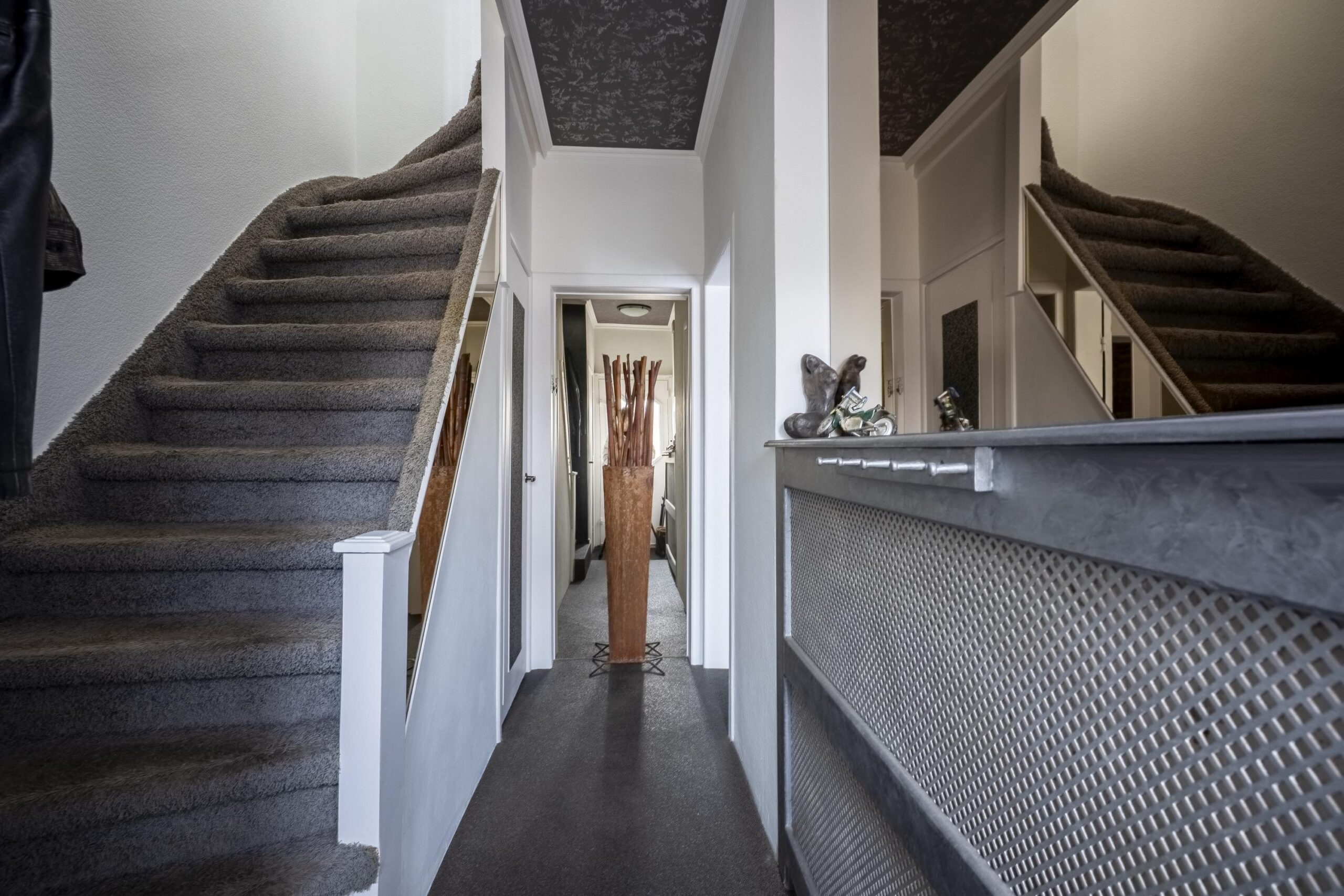 De hal met meterkast, trapopgang en gastentoilet met zwevend toilet biedt toegang tot de ruime woonkamer/eetkamer.