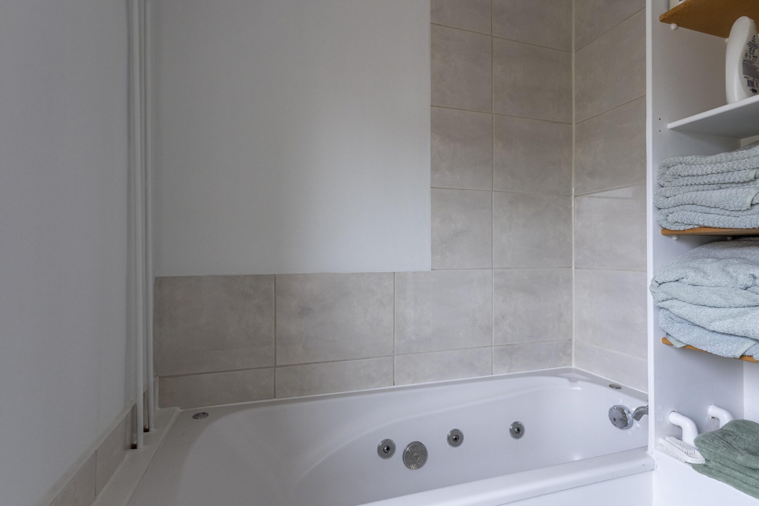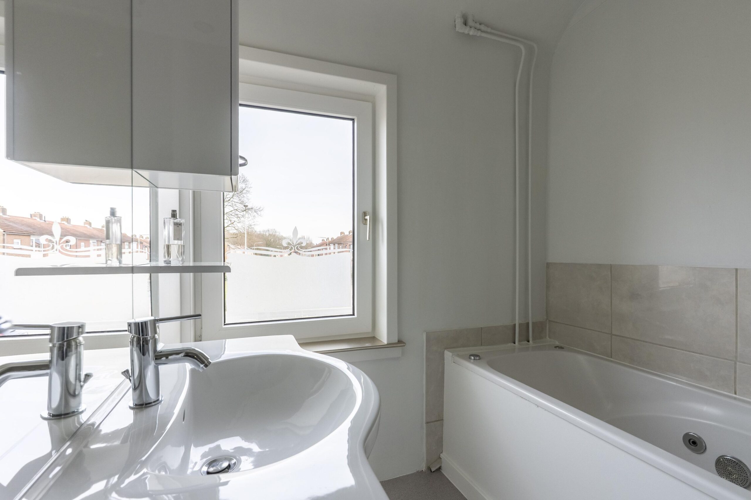 De deels betegelde badkamer is groot ca. 3 m² en voorzien van een ligbad en wastafelmeubel.