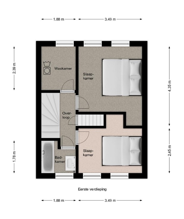 De overloop biedt toegang tot 2 slaapkamers, een waskamer en de badkamer.