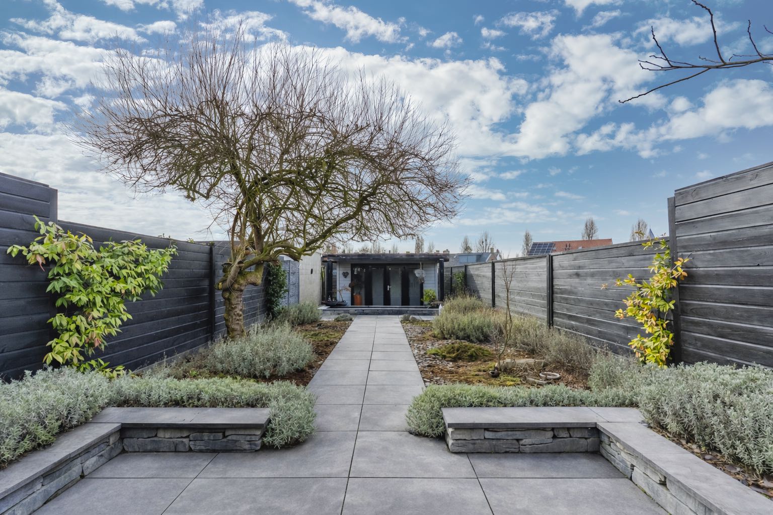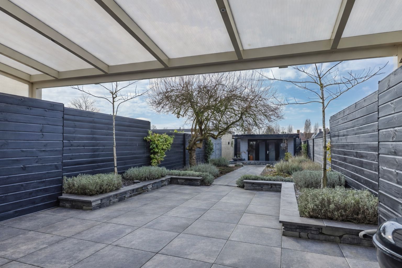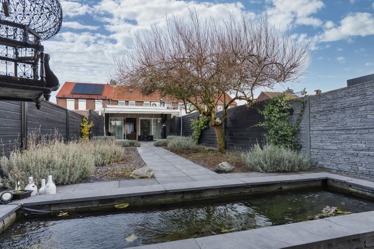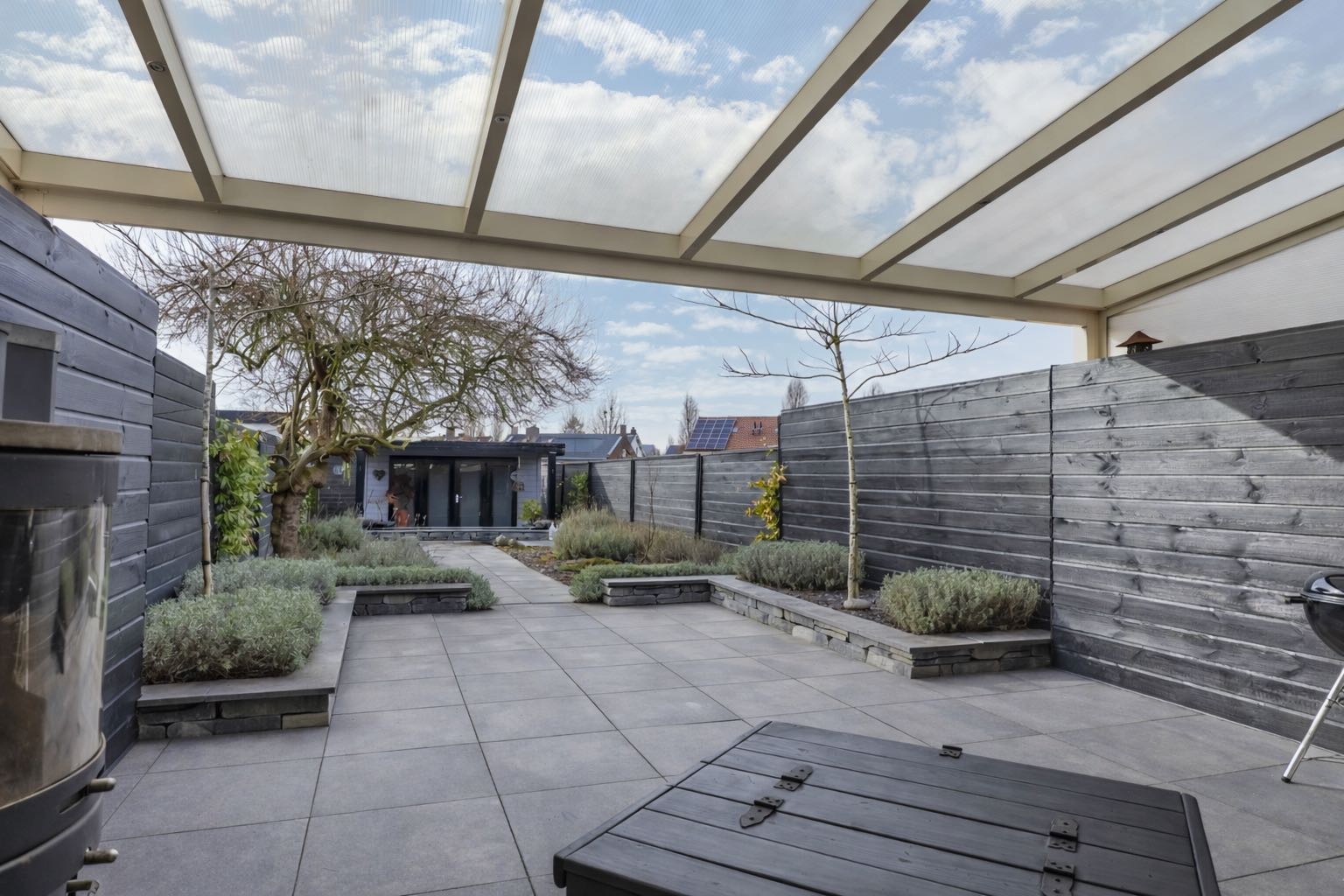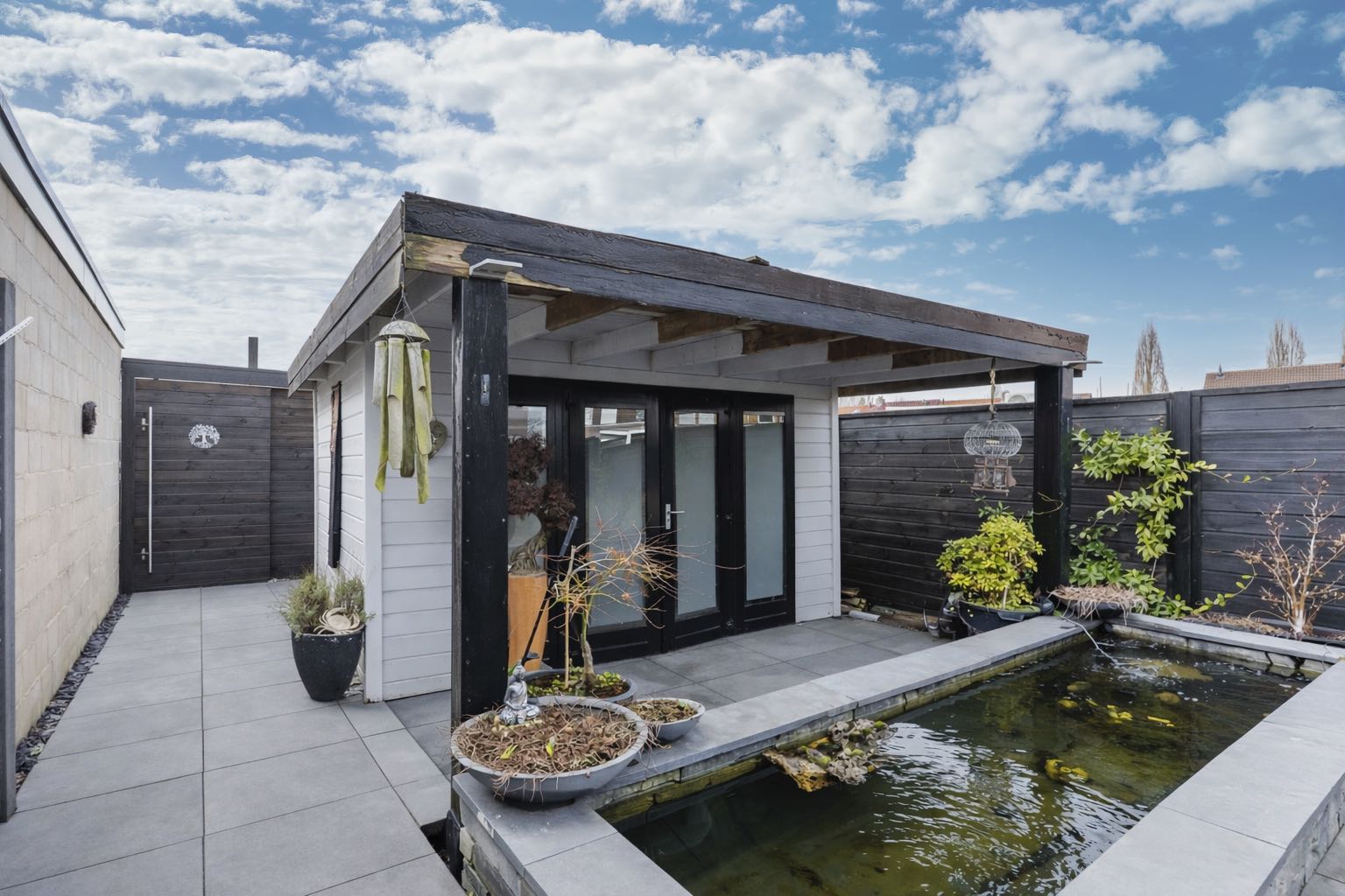 Vanuit de woonkamer is de diepe achtertuin te bereiken. De fraai aangelegde achtertuin is gelegen op het noordoosten en is voorzien van een ruim overdekt terras, strakke borders, een moderne vijver en houten tuinhuis.