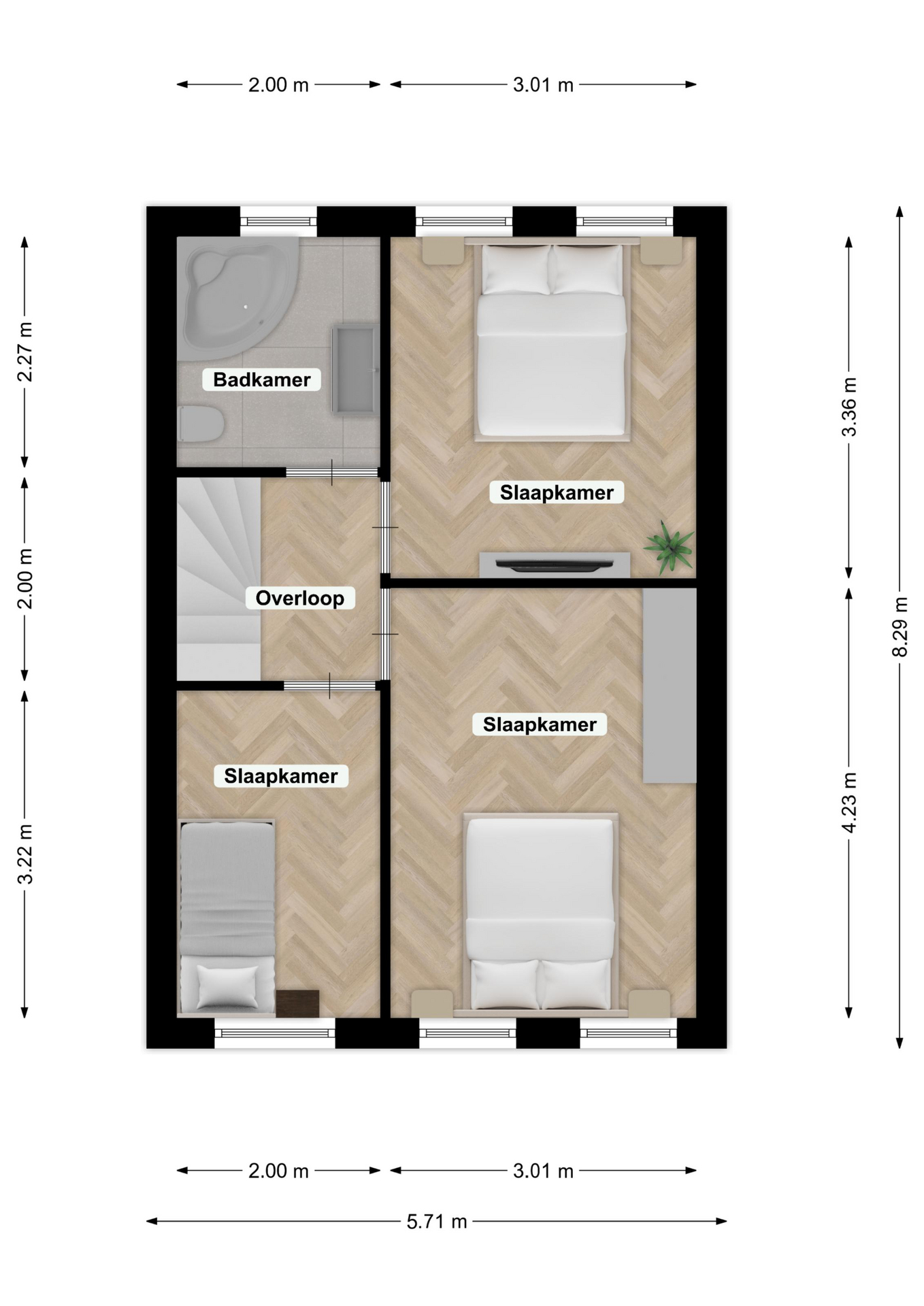Overloop met toegang tot drie nette slaapkamers, allen voorzien van een moderne, lichte laminaatvloer en welke respectievelijk groot zijn: