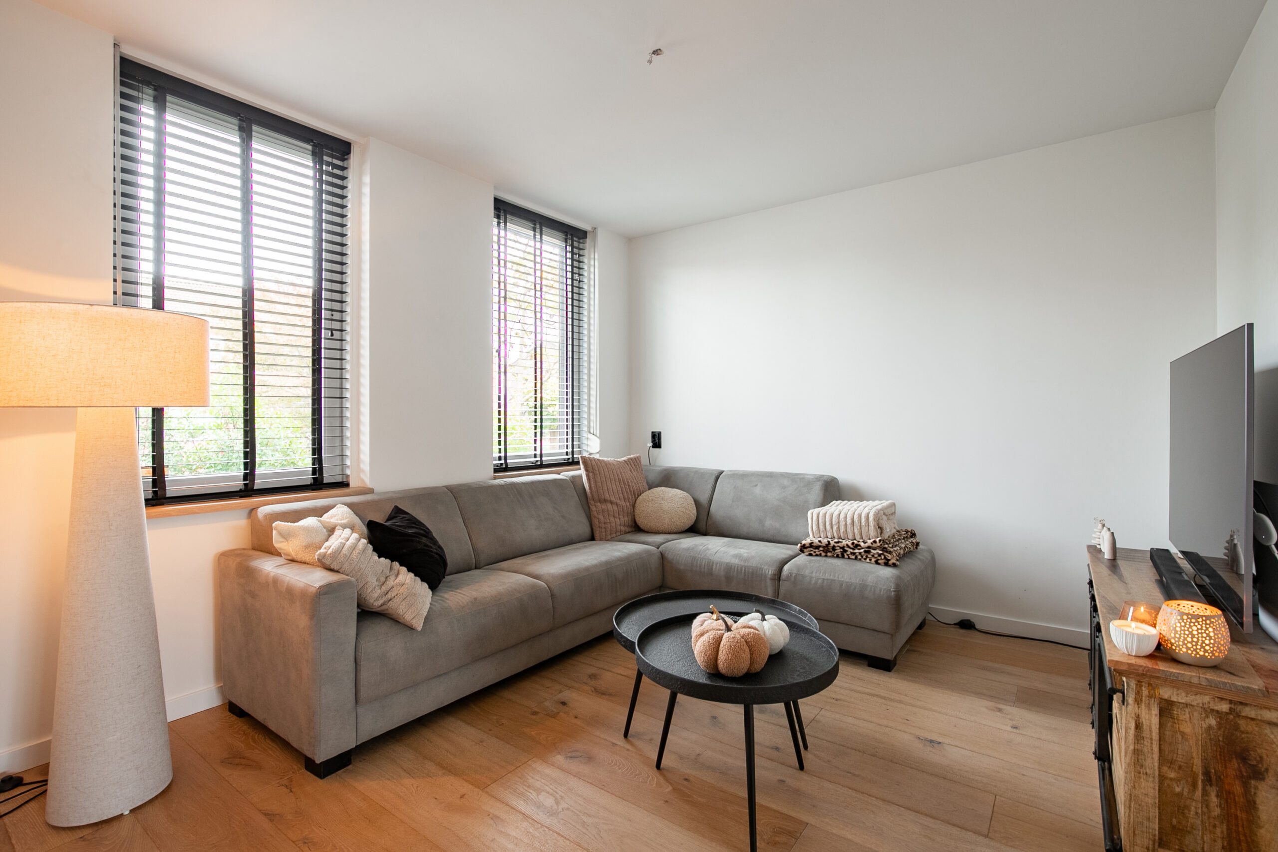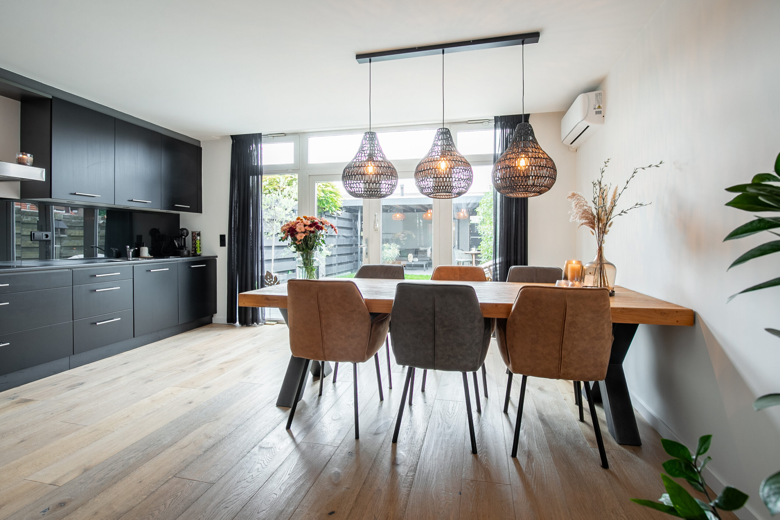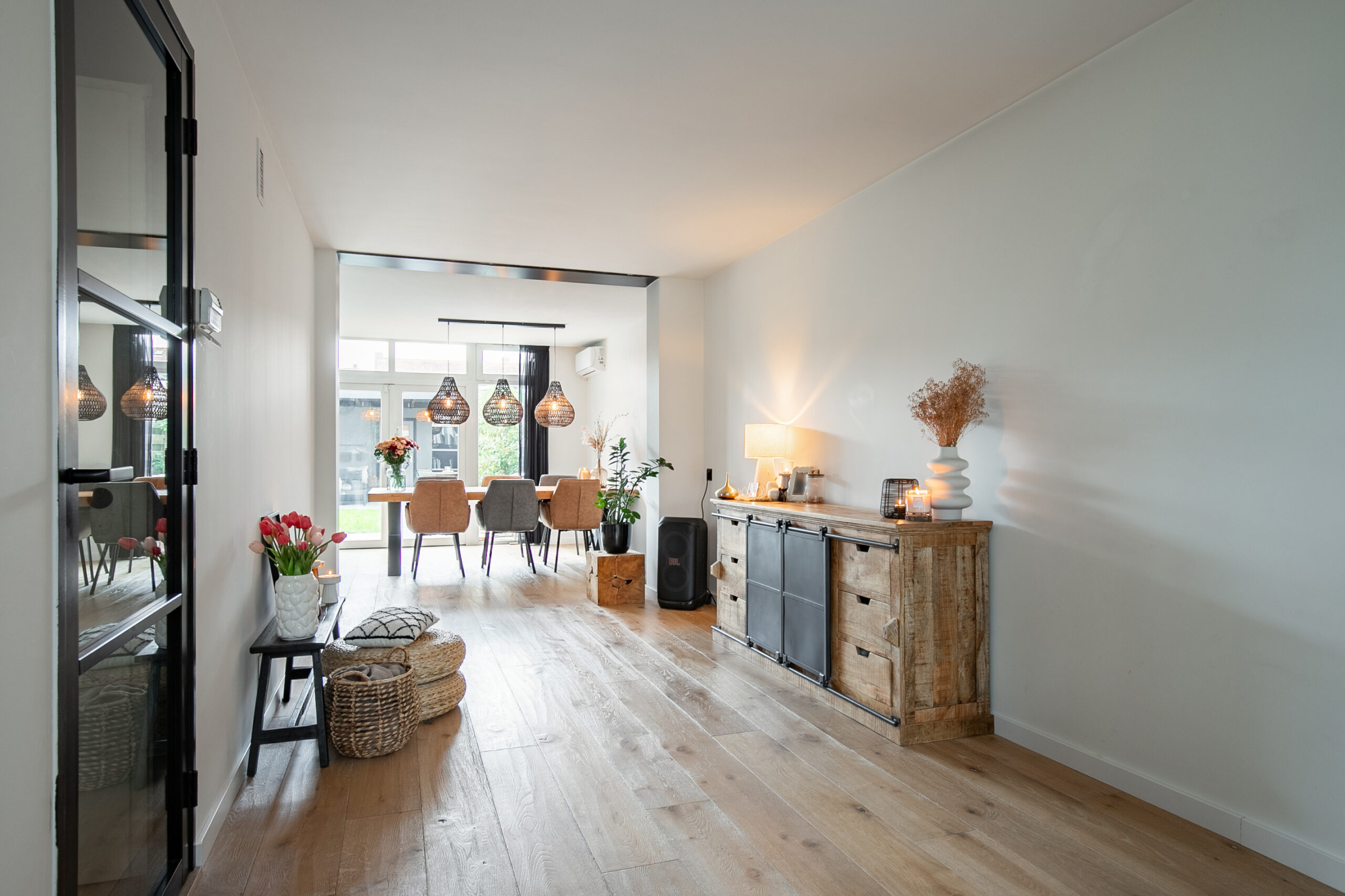 Via de onderhoudsvriendelijke voortuin bereikt u de entree/hal. De hal is voorzien van een garderobenis en een gemoderniseerde meterkast. Vanuit de hal betreedt u de sfeervolle, aangebouwde woonkamer, afgewerkt met een massief eiken parketvloer en strak gestucte wanden. Aan de voorzijde bevindt zich het gezellige tv-gedeelte; in de aanbouw is ruimte gecreëerd voor het eetgedeelte en de open keuken. De woonkamer beschikt over een airco-unit (Maxicool, eigendom), die zowel kan koelen als verwarmen, ideaal in zomer én winter. De keuken is uitgerust met een inductiekookplaat, afzuigkap (schouwmodel), oven en vaatwasser. Aangrenzend vindt u de bijkeuken/wasruimte met witgoedaansluitingen en een praktische bergkast. Voordat u de trap naar de eerste verdieping bereikt, bevindt zich de moderne toiletruimte, voorzien van een zwevend closet en fontein.