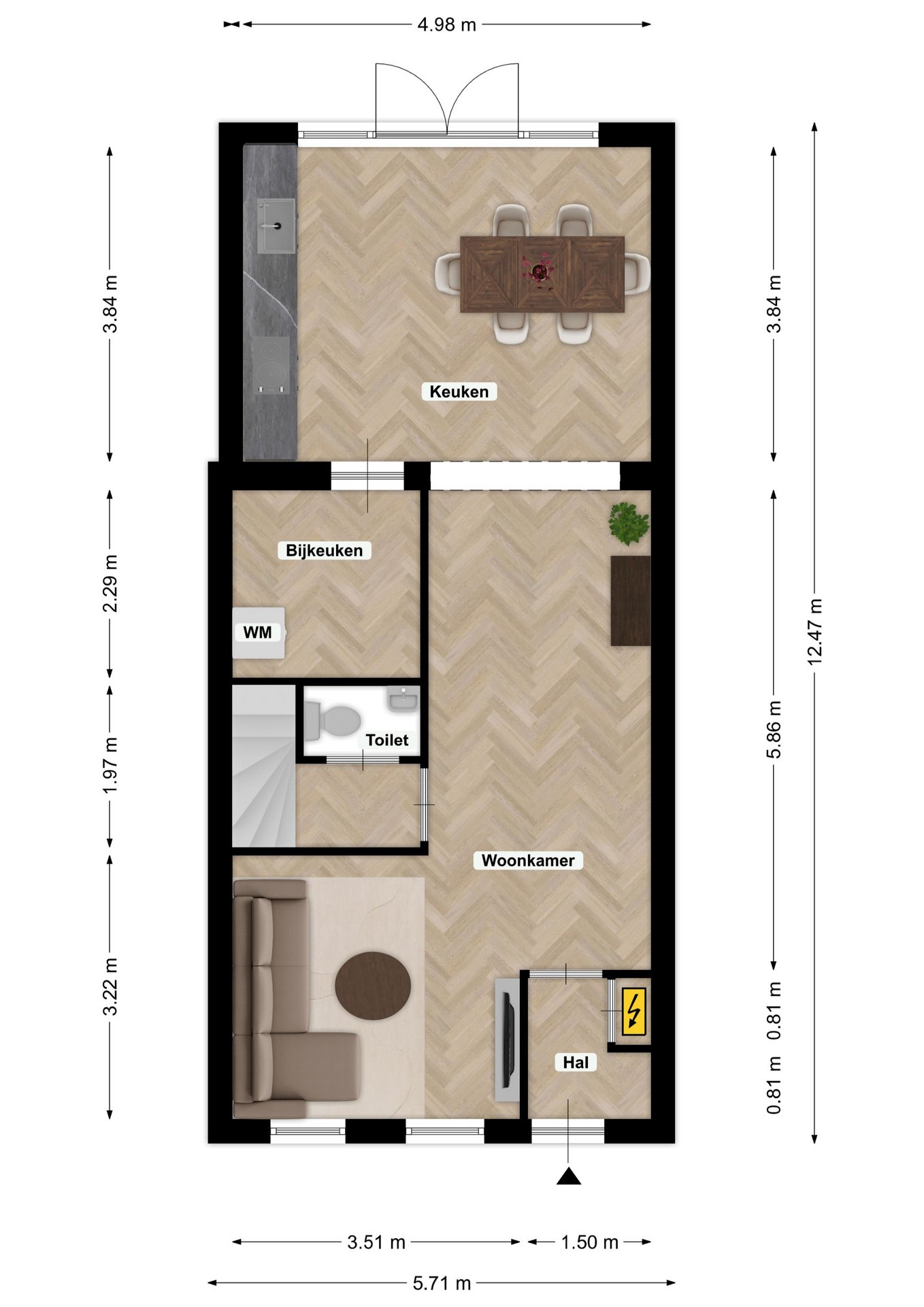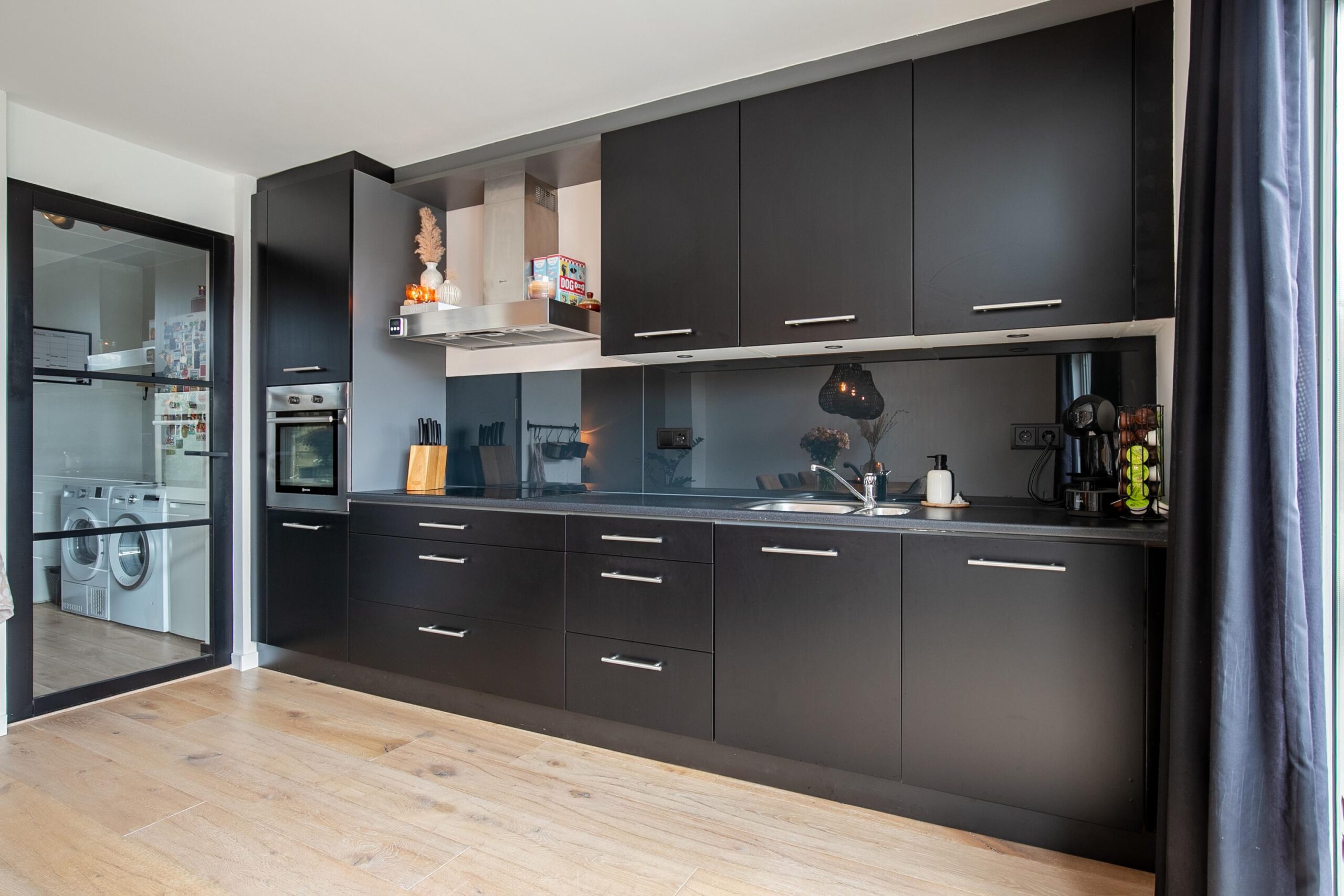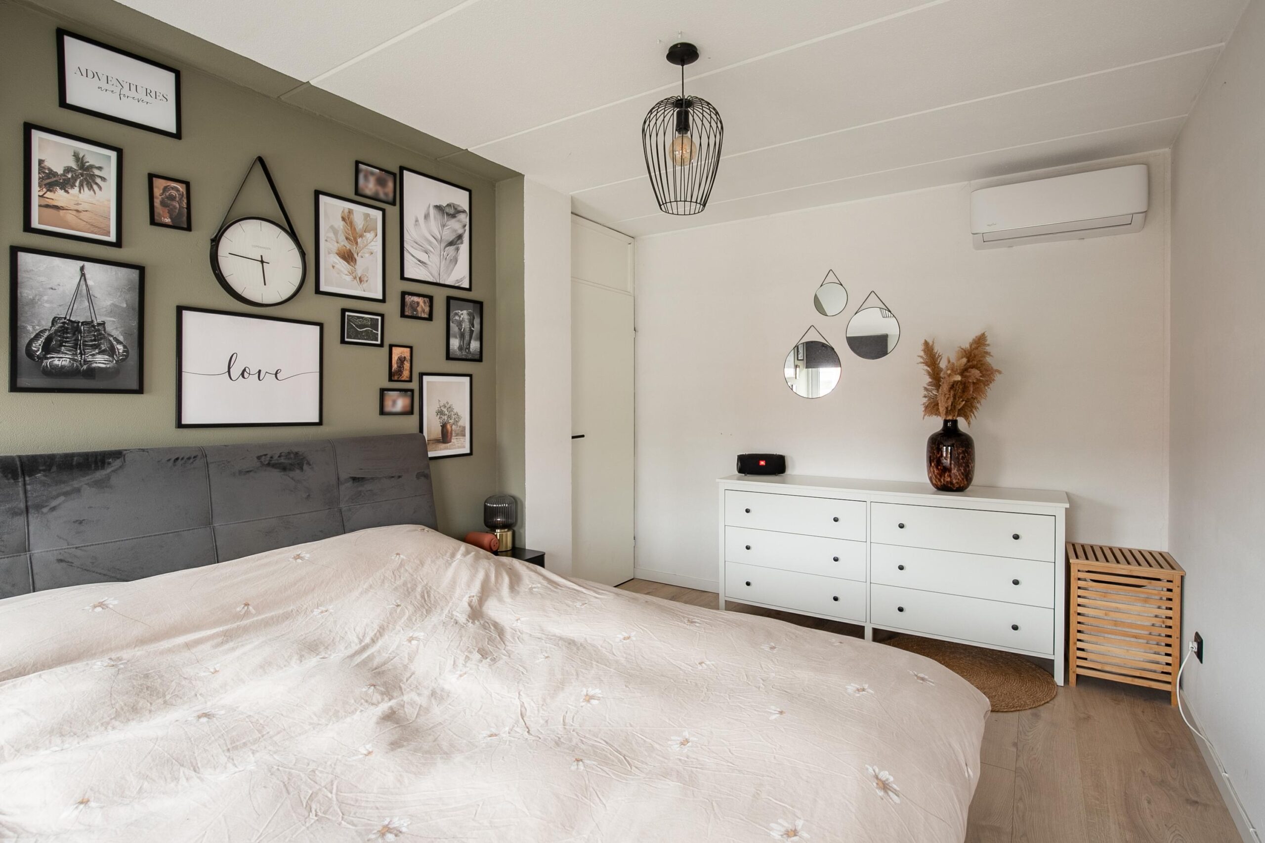 Via de onderhoudsvriendelijke voortuin bereikt u de entree/hal. De hal is voorzien van een garderobenis en een gemoderniseerde meterkast. Vanuit de hal betreedt u de sfeervolle, aangebouwde woonkamer, afgewerkt met een massief eiken parketvloer en strak gestucte wanden. Aan de voorzijde bevindt zich het gezellige tv-gedeelte; in de aanbouw is ruimte gecreëerd voor het eetgedeelte en de open keuken. De woonkamer beschikt over een airco-unit (Maxicool, eigendom), die zowel kan koelen als verwarmen, ideaal in zomer én winter. De keuken is uitgerust met een inductiekookplaat, afzuigkap (schouwmodel), oven en vaatwasser. Aangrenzend vindt u de bijkeuken/wasruimte met witgoedaansluitingen en een praktische bergkast. Voordat u de trap naar de eerste verdieping bereikt, bevindt zich de moderne toiletruimte, voorzien van een zwevend closet en fontein.