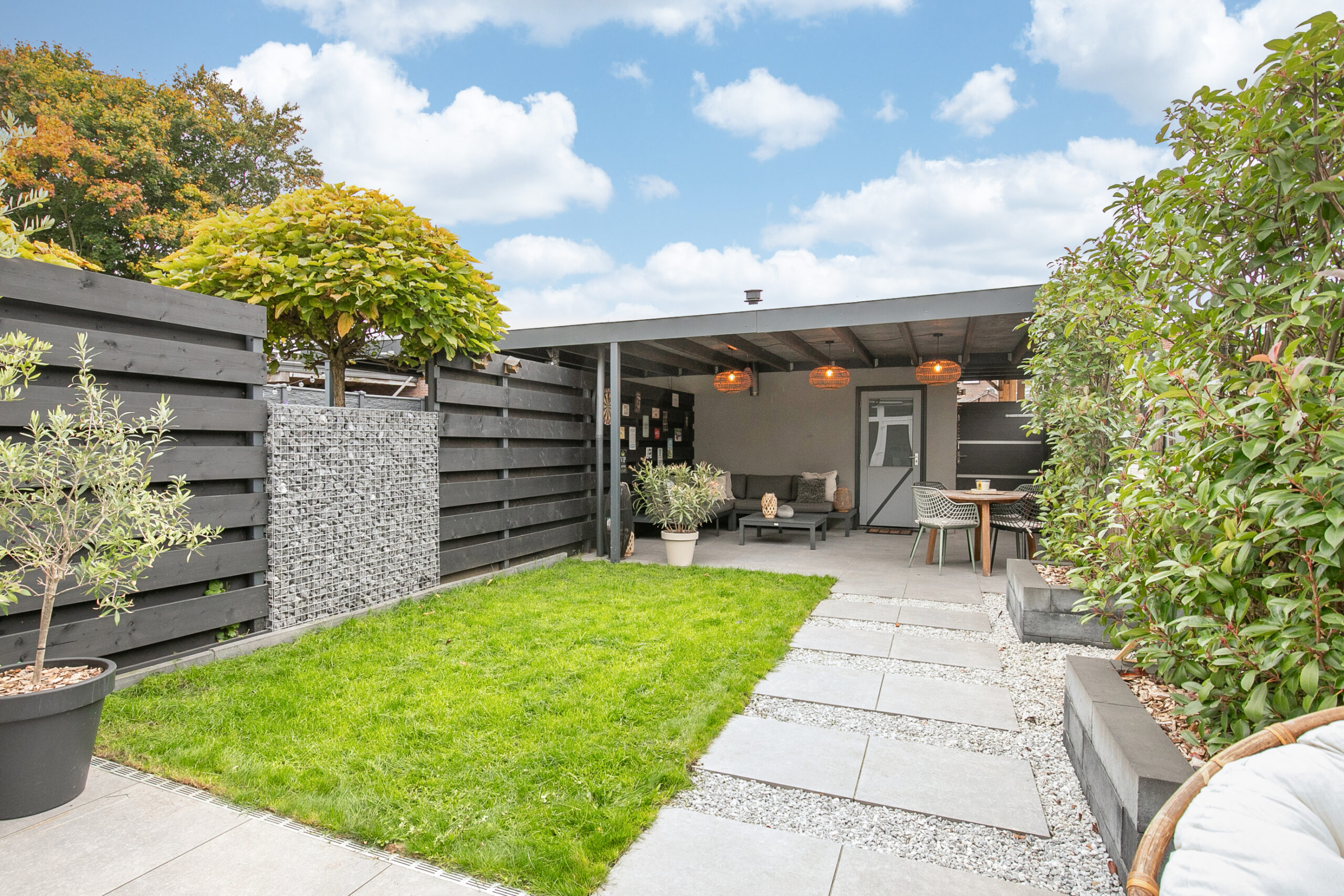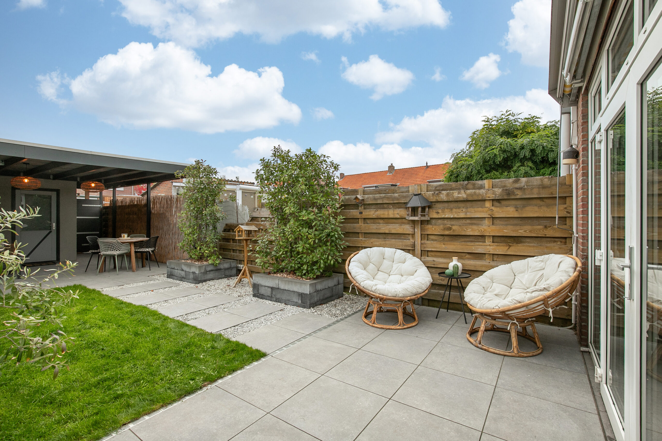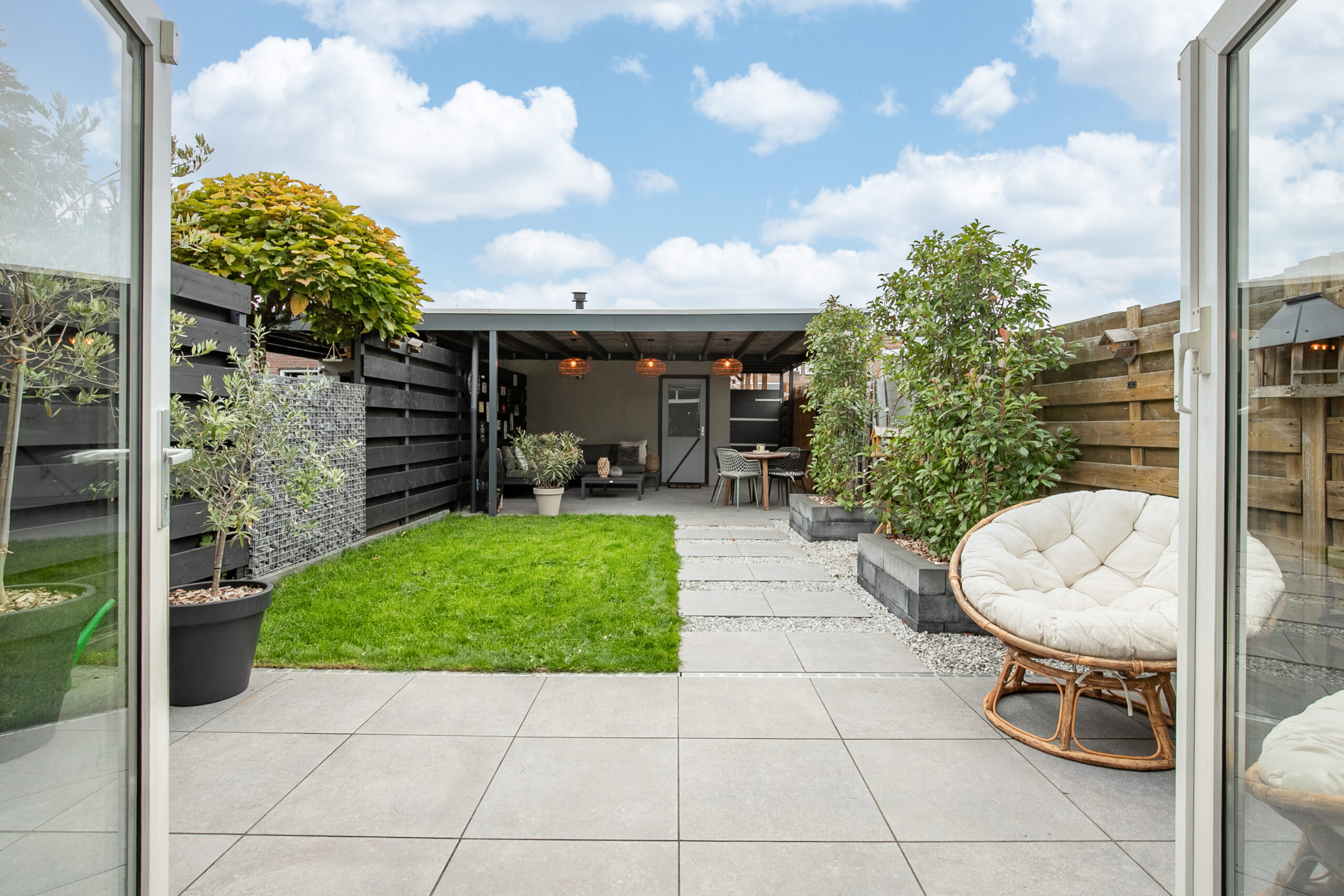 De in 2023 opnieuw aangelegde achtertuin is via de achteringang én via openslaande deuren in de woonkamer bereikbaar. De tuin is zonnig, onderhoudsvriendelijk en volledig omsloten, een fijne plek voor jonge gezinnen of mensen die graag buiten ontspannen. Er zijn twee terrassen aanwezig: één overdekt terras en één terras met knikarm zonnescherm. Daarnaast beschikt de tuin over groene borders, kiezelafwerking en een stukje gazon. Achterin de tuin bevindt zich een degelijk gebouwde stenen berging met ingebouwde afzuigkap, handig voor bijvoorbeeld een friteuse of airfryer, zodat kookgeuren niet in huis komen. Achter de berging ligt een dubbele, overdekte parkeerplaats (carport), bereikbaar via een gezamenlijke achteringang (erfdienstbaarheid). Deze parkeerplaatsen zijn later aangekocht en vormen een waardevolle uitbreiding van het perceel. Gezien de hoogte van de overkapping boven de parkeerplaatsen biedt dit tevens de mogelijkheid om u caravan of camper te stallen.