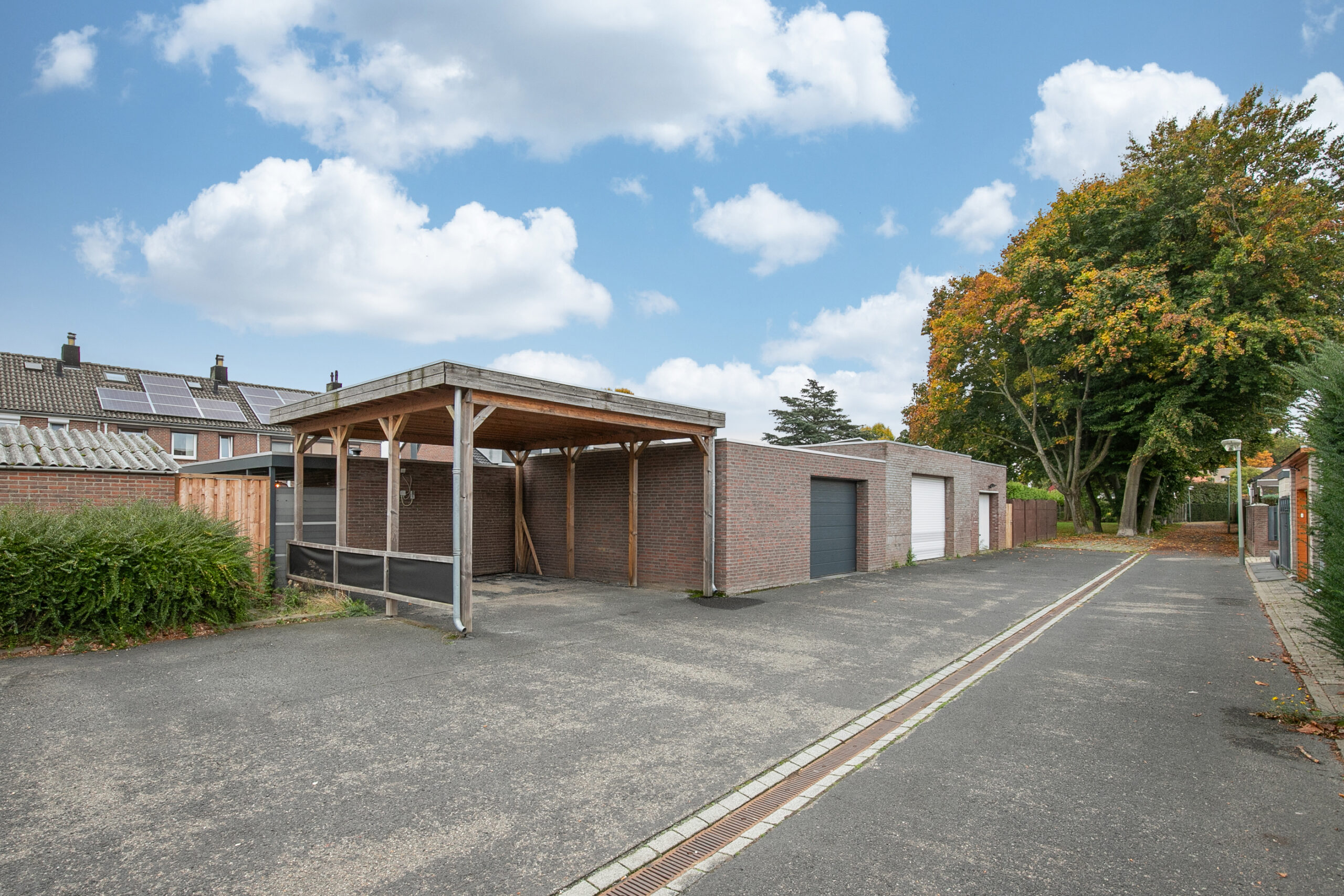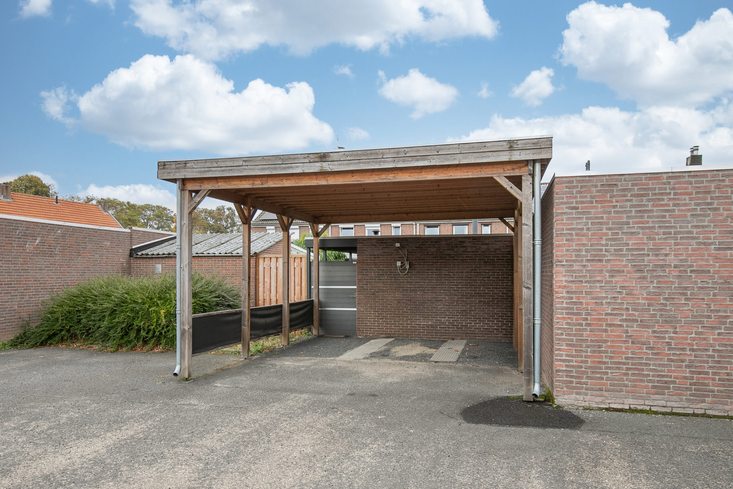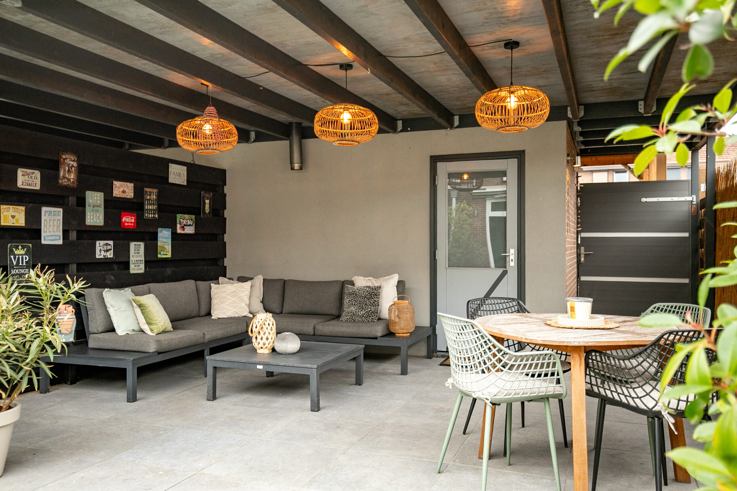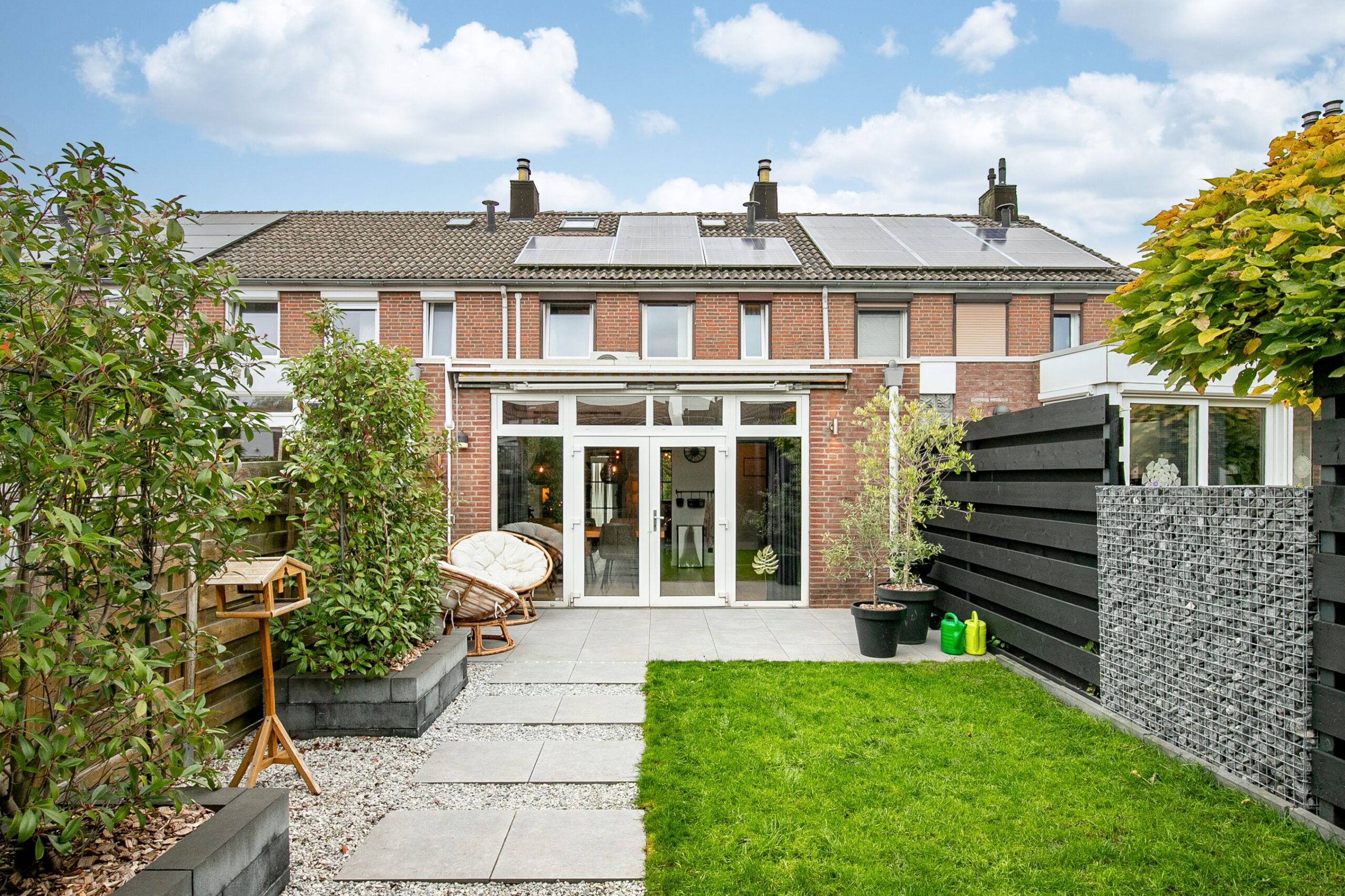 De in 2023 opnieuw aangelegde achtertuin is via de achteringang én via openslaande deuren in de woonkamer bereikbaar. De tuin is zonnig, onderhoudsvriendelijk en volledig omsloten, een fijne plek voor jonge gezinnen of mensen die graag buiten ontspannen. Er zijn twee terrassen aanwezig: één overdekt terras en één terras met knikarm zonnescherm. Daarnaast beschikt de tuin over groene borders, kiezelafwerking en een stukje gazon. Achterin de tuin bevindt zich een degelijk gebouwde stenen berging met ingebouwde afzuigkap, handig voor bijvoorbeeld een friteuse of airfryer, zodat kookgeuren niet in huis komen. Achter de berging ligt een dubbele, overdekte parkeerplaats (carport), bereikbaar via een gezamenlijke achteringang (erfdienstbaarheid). Deze parkeerplaatsen zijn later aangekocht en vormen een waardevolle uitbreiding van het perceel. Gezien de hoogte van de overkapping boven de parkeerplaatsen biedt dit tevens de mogelijkheid om u caravan of camper te stallen.