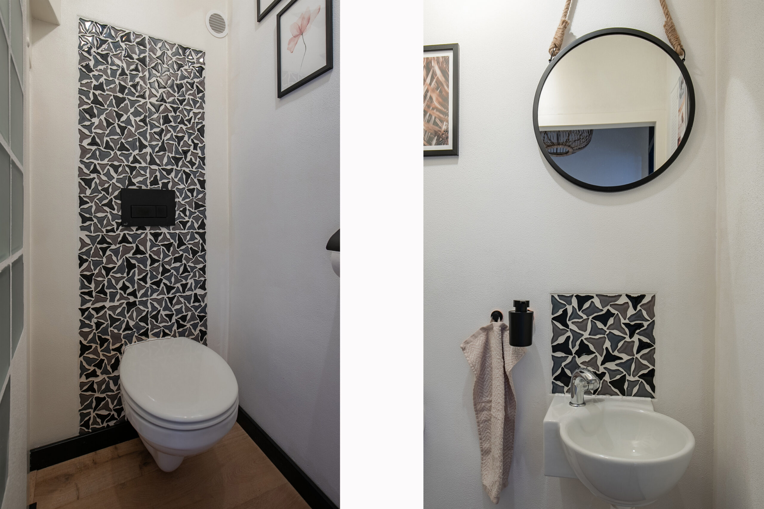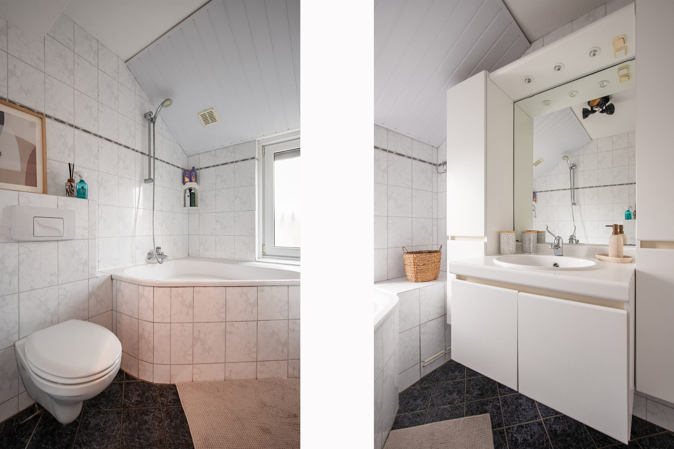 De badkamer is volledig betegeld en voorzien van een hoekligbad met whirlpoolfunctie, een tweede zwevend toilet, wastafelmeubel en mechanische ventilatie. De ruimte is degelijk en functioneel, maar kan desgewenst naar eigen smaak worden gemoderniseerd.