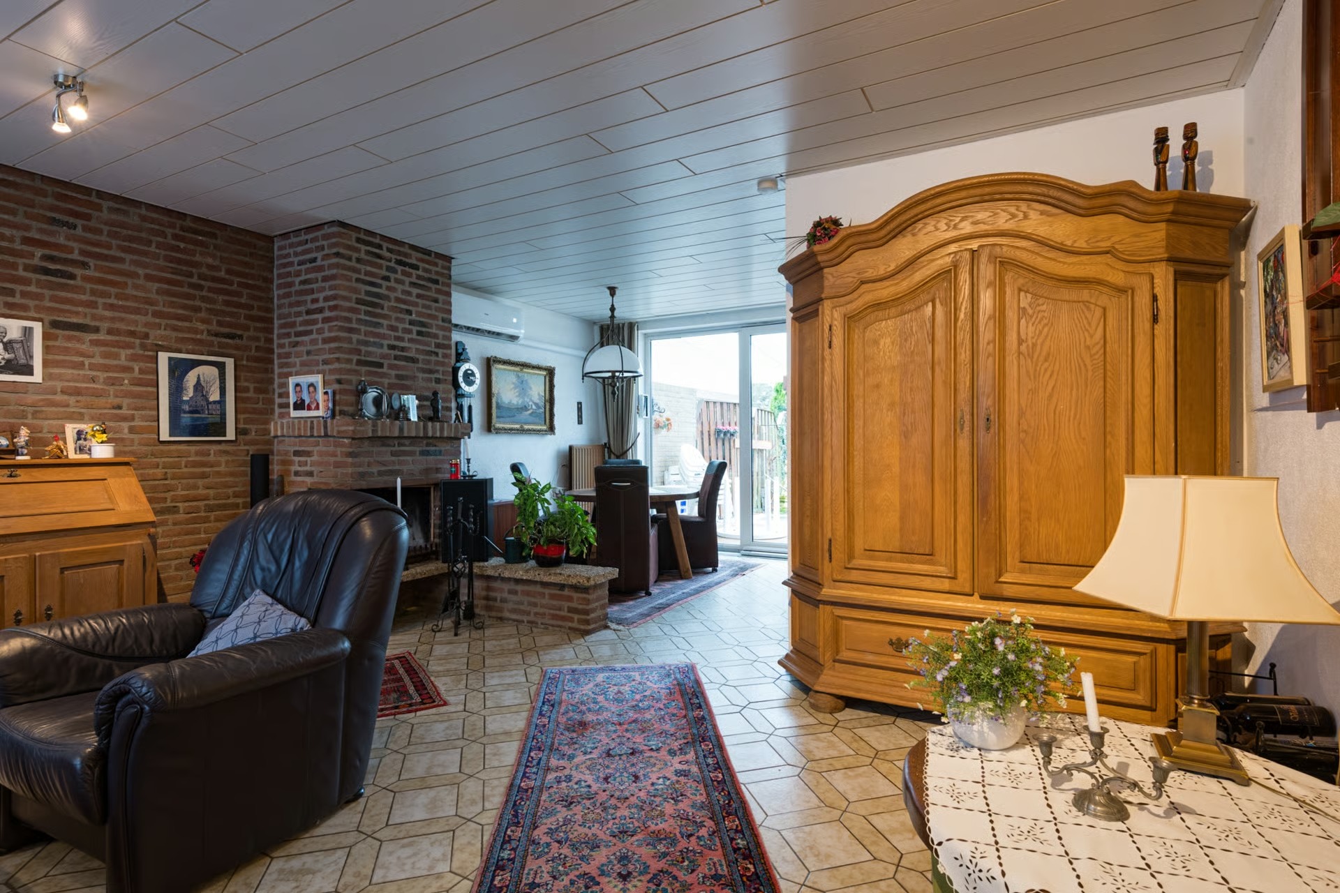 De ruime woonkamer beschikt over een sfeervolle open haardpartij, airconditioning en een plavuizenvloer.