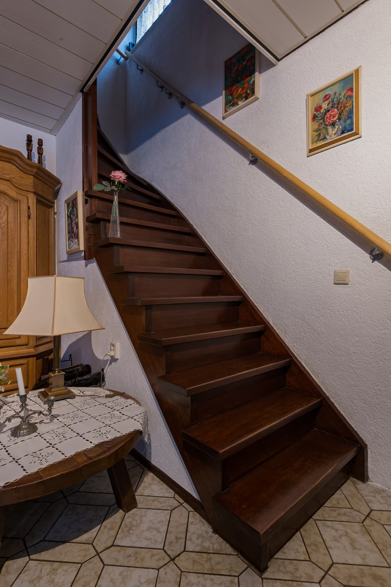 Via de verzorgde voortuin met oprit bereikt u de overdekte entree. De hal is voorzien van een plavuizenvloer, meterkast, trapopgang naar de verdieping en een geheel betegelde toiletruimte met fonteintje.