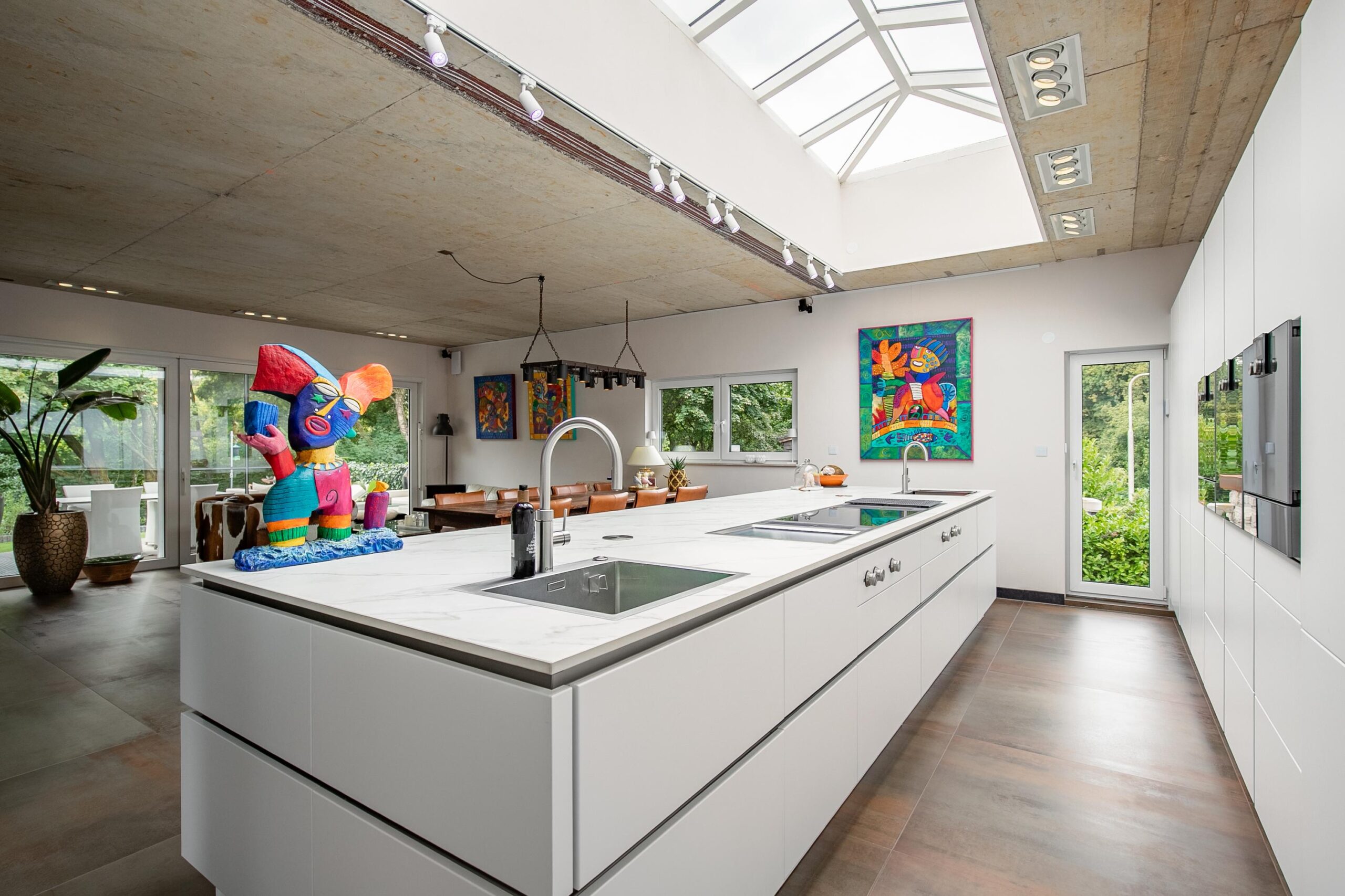 De keuken is een waar hoogtepunt en wordt rijkelijk verlicht door een grote lichtstraat. Het kookeiland van 4,70 x 1,40 m is uitgerust met twee spoelbakken, waarvan één met Quooker. De koelkast en diepvries zijn van Liebherr, de rest van de apparatuur is van het merk Gaggenau, waaronder een teppanyaki- en inductieplaat, grill, afzuigkap, wijnklimaatkast, wijnkoeling, vaatwasser, koelkast, bewaarkast, drie ovens (hetelucht-, stoom- en combi-oven), vacumeerlade en warmhoudlade. Het eiland is afgewerkt met een keramisch blad, voorzien van inbouwverlichting en inbouwstopcontacten, en biedt veel bergruimte.