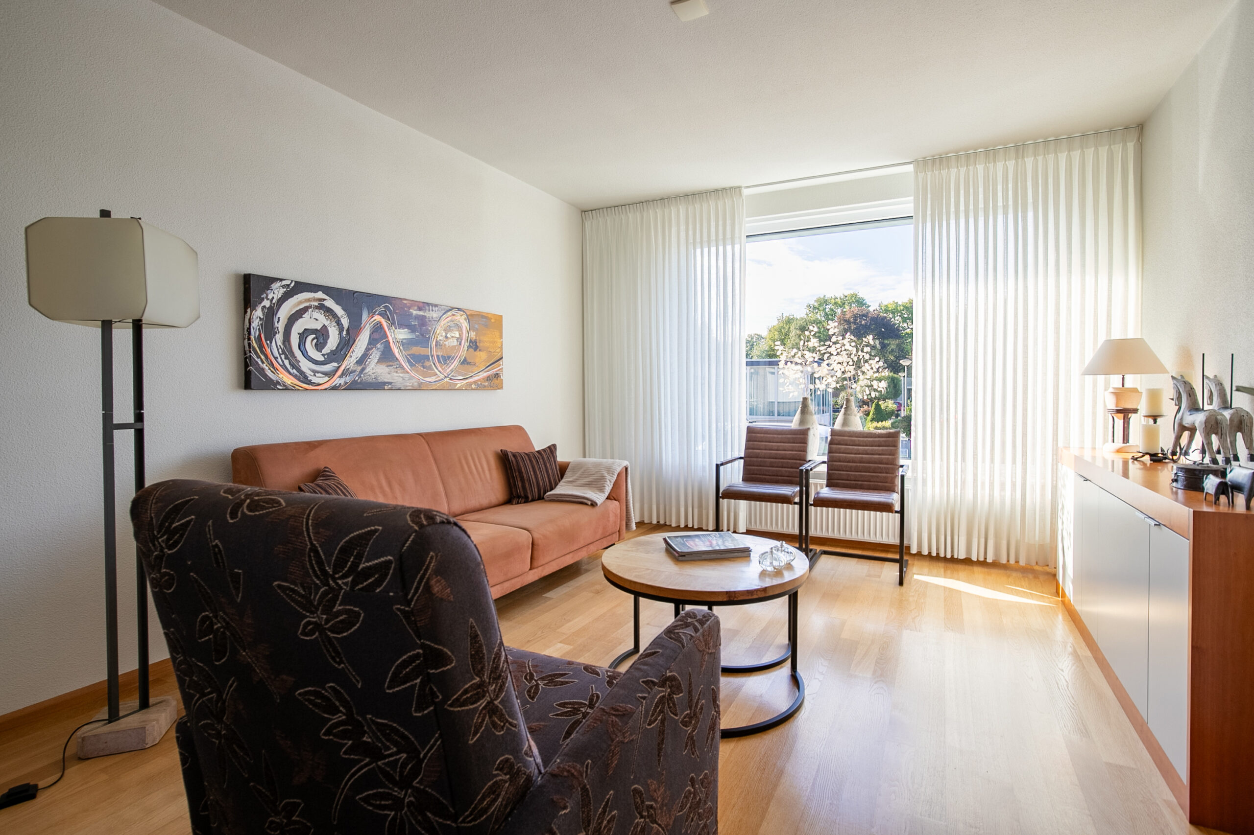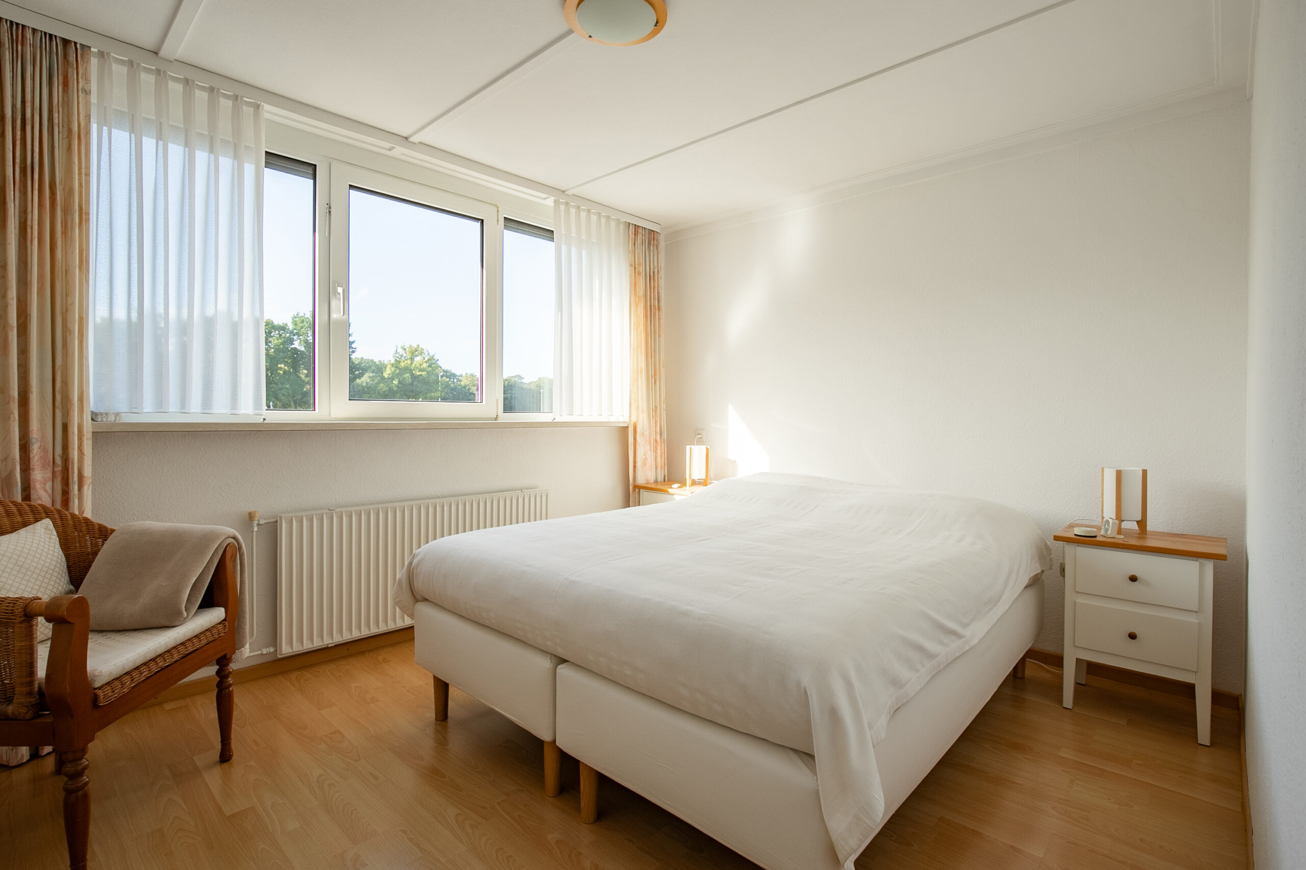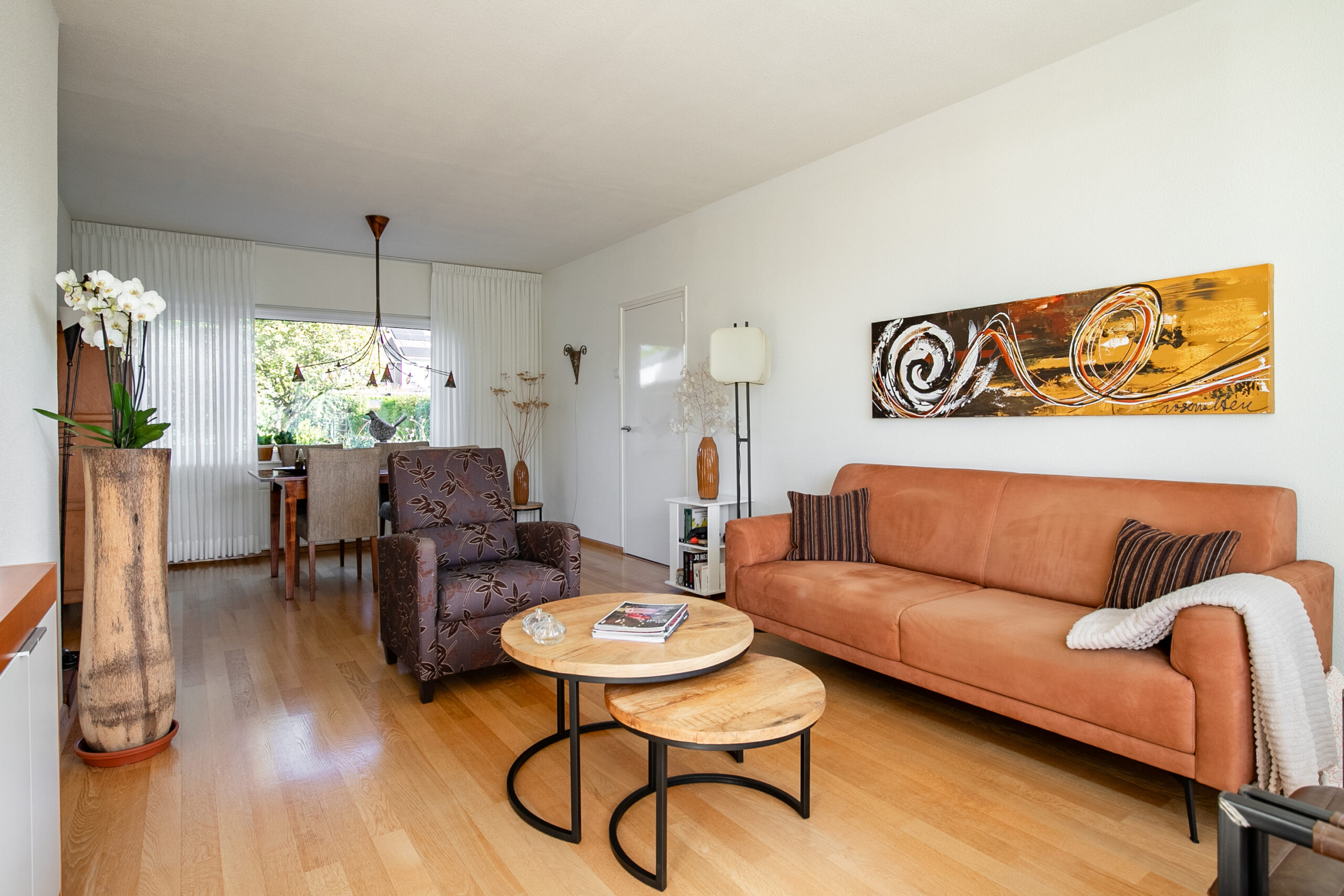 Sfeervolle woonkamer met parketvloer, veel lichtinval en elektrisch bedienbare screens.