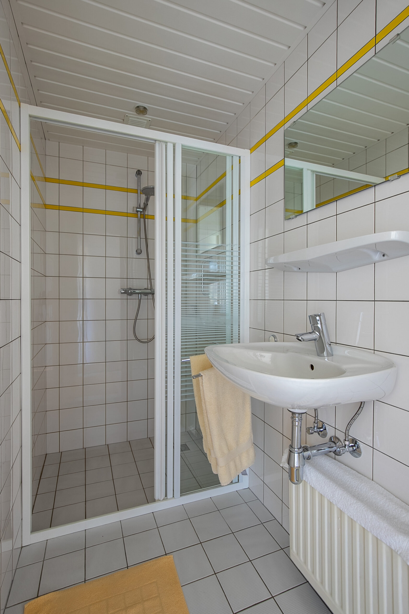 Geheel betegelde badkamer met vaste wastafel en inloopdouche met glasscherm en thermosstaatkraan.