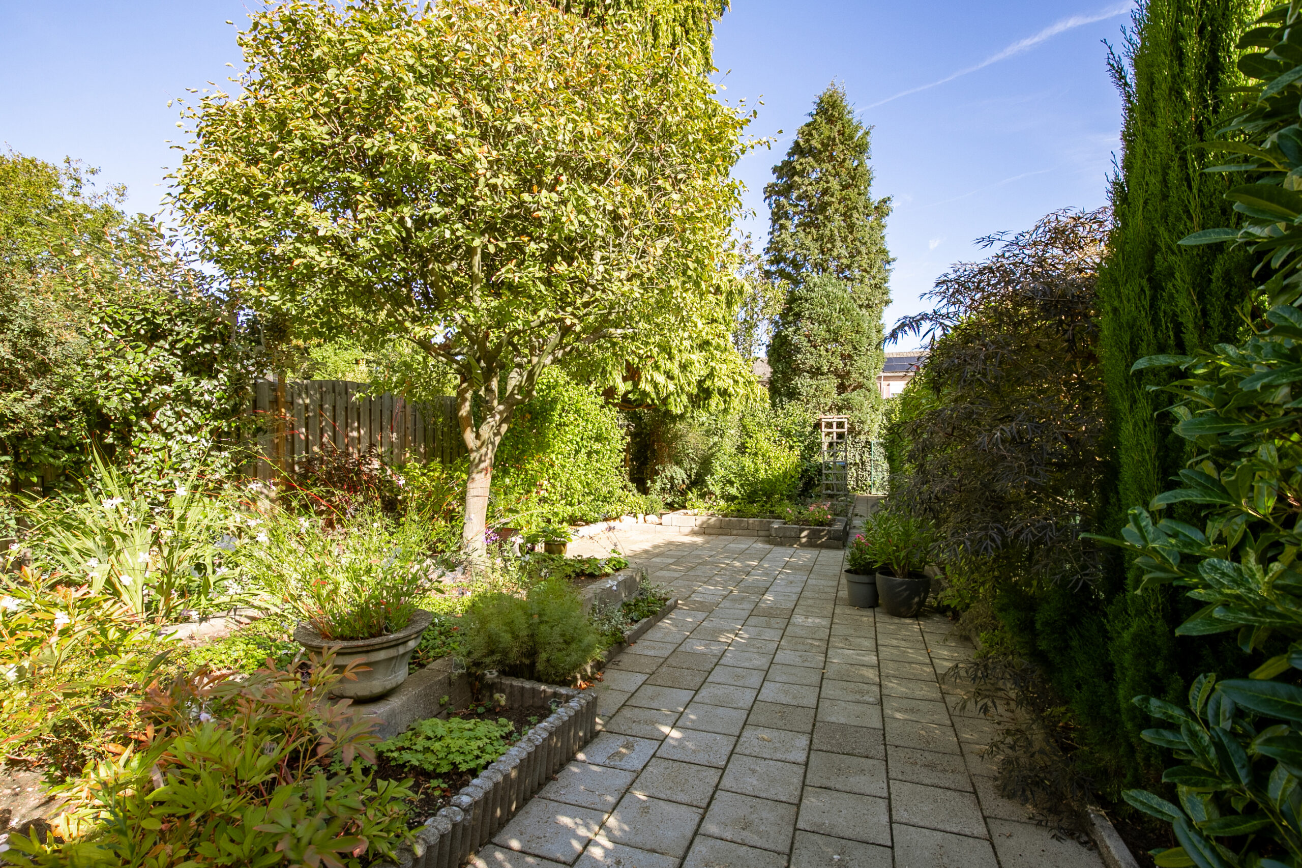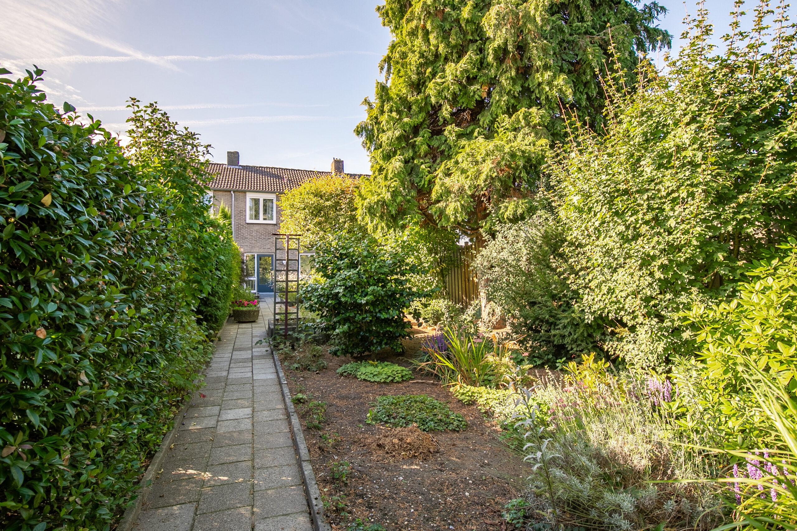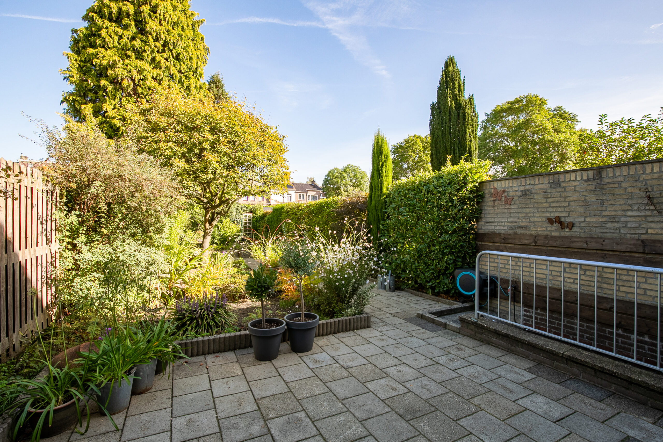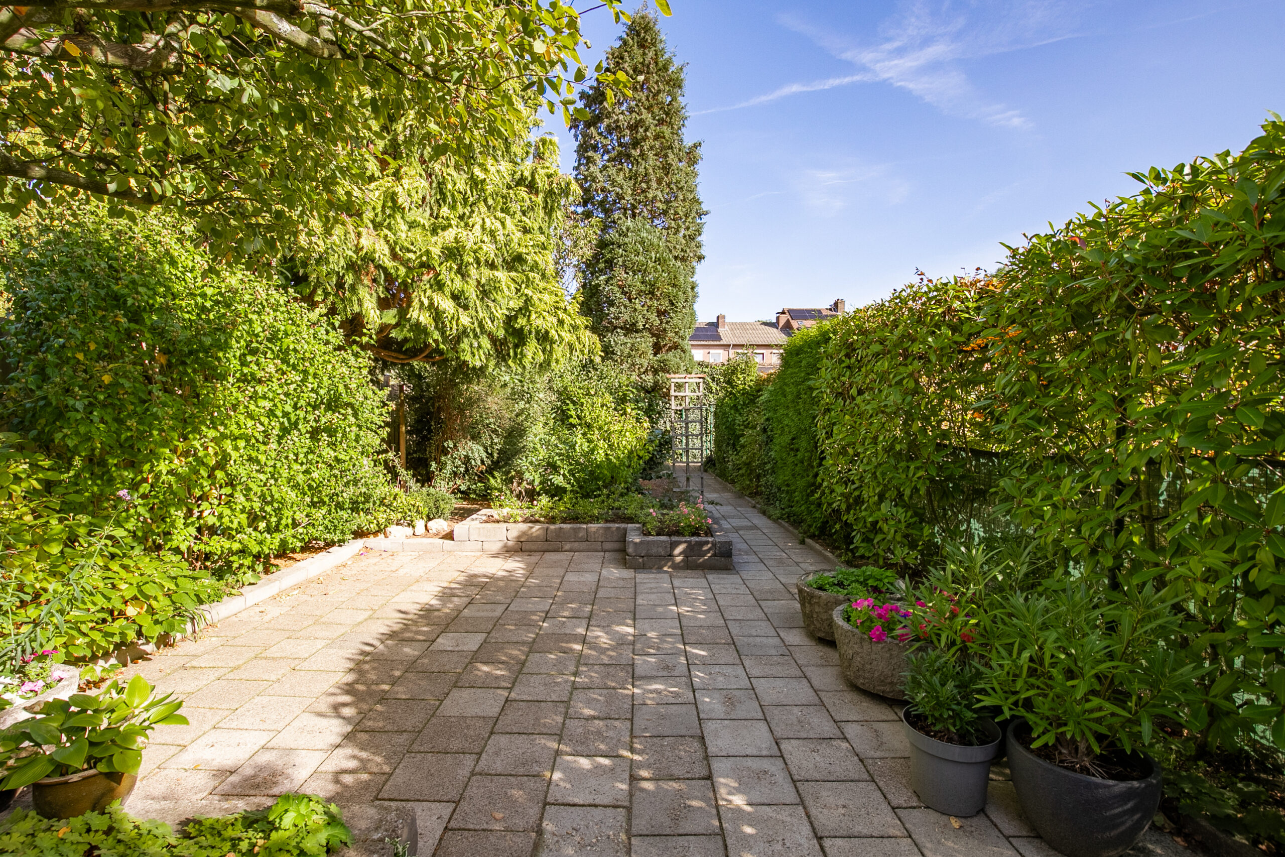 Prachtige ruime aangelegde tuin met diverse terrassen, toegang naar de kelder, achteringang met afsluitbare poort