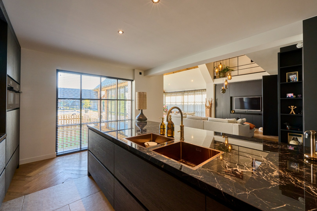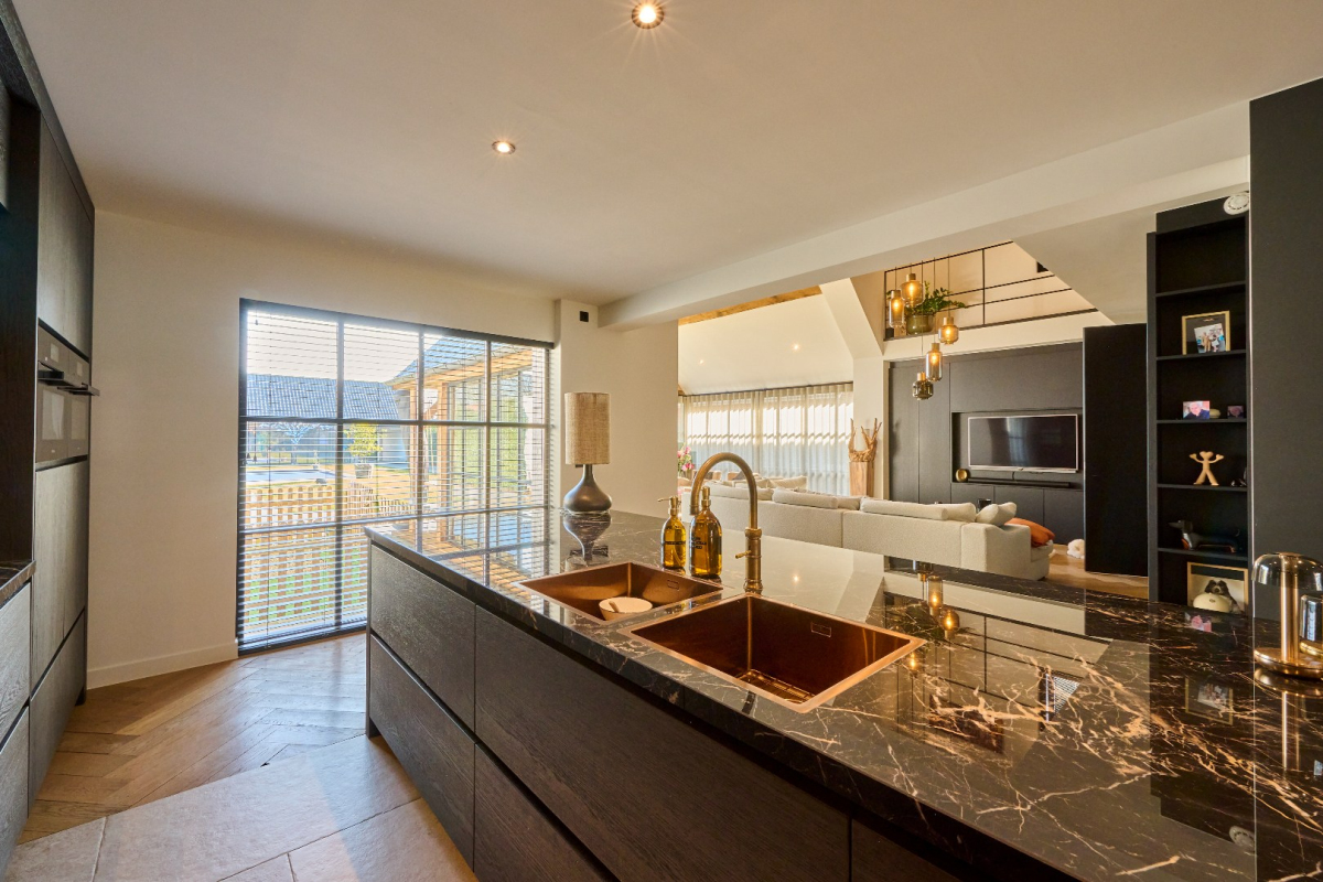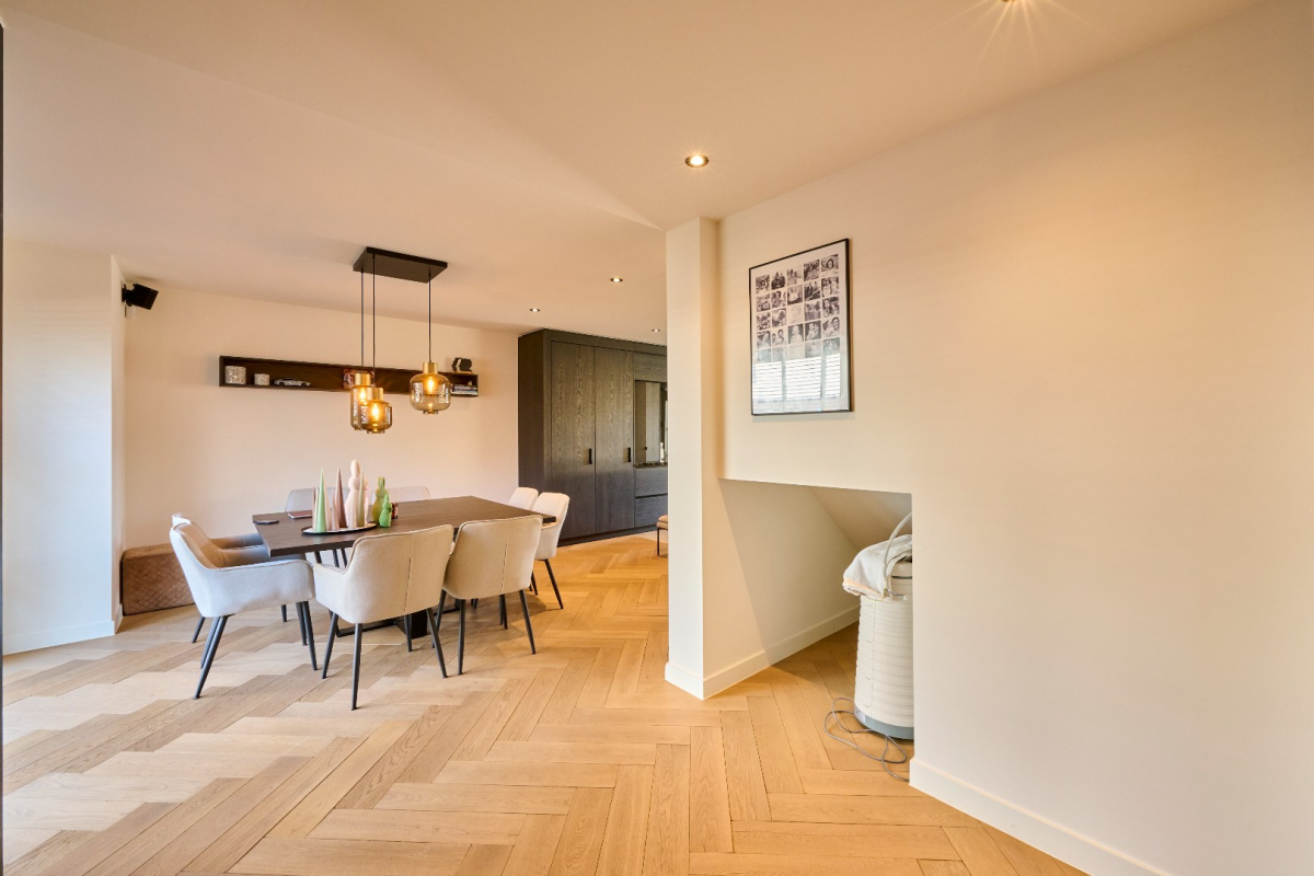 – De keuken staat in directe verbinding met de open leefruimte met hoge plafonds en visgraatparket