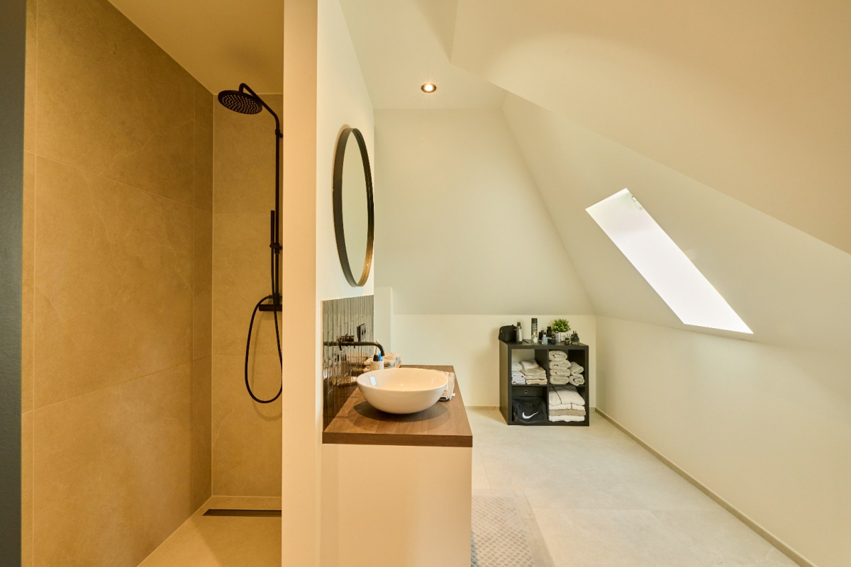 – Tweede badkamer uitgerust met inloopdouche, toilet en enkele lavabo in badkamermeubel