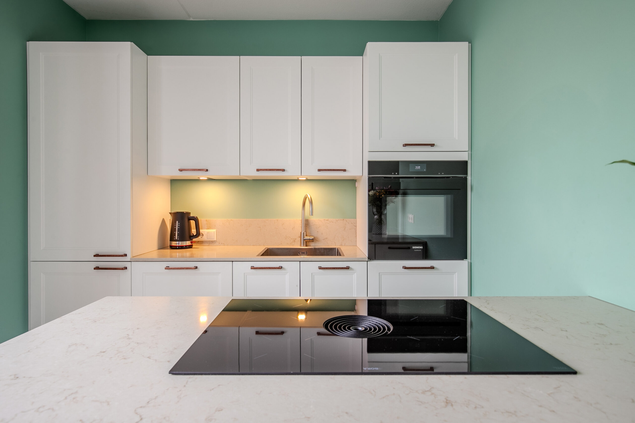 De open keuken is praktisch ingericht voorzien van diverse inbouwapparatuur, waaronder een inductiekookplaat met geïntegreerde afzuiging (BORA), koelkast, vaatwasser en een combi-oven.