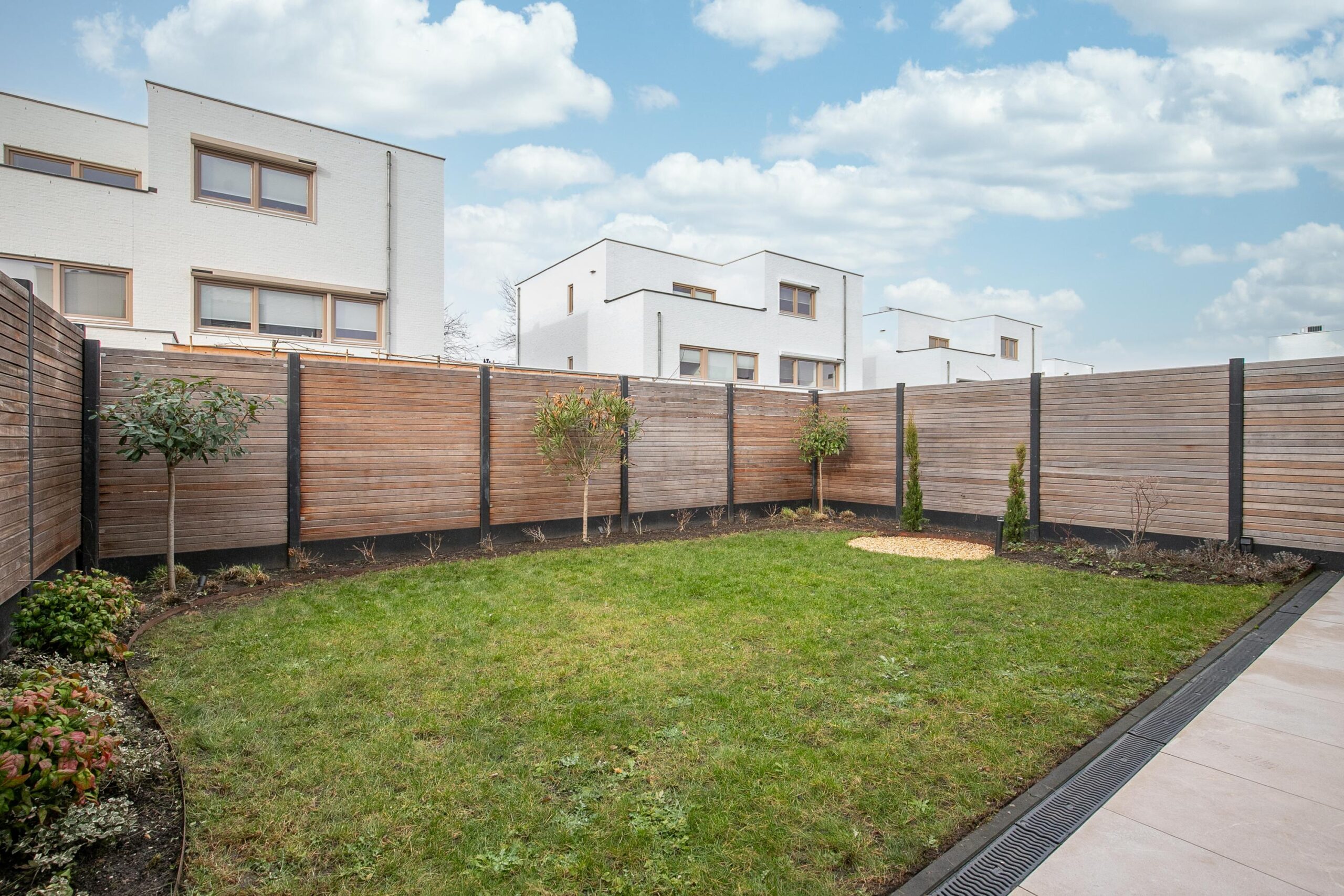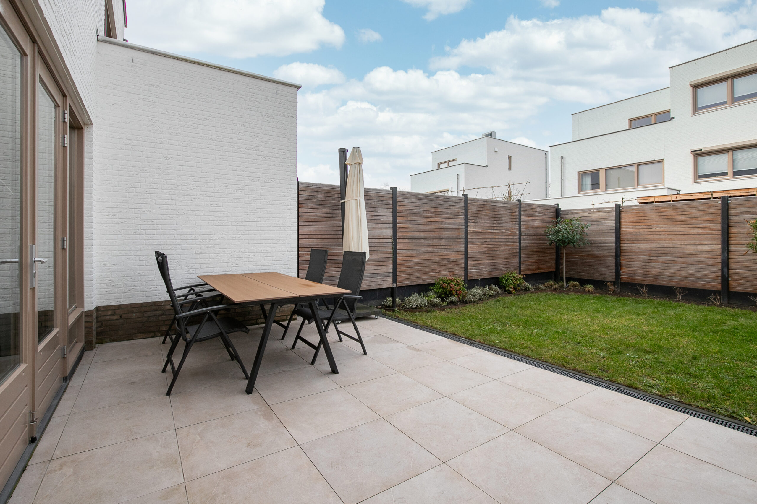 De tuin is bereikbaar via de openslaande deuren in de woonkamer én via de garage. Hij is volledig omsloten en onderhoudsvriendelijk aangelegd met graszoden, keramische bestrating en schemerverlichting.
