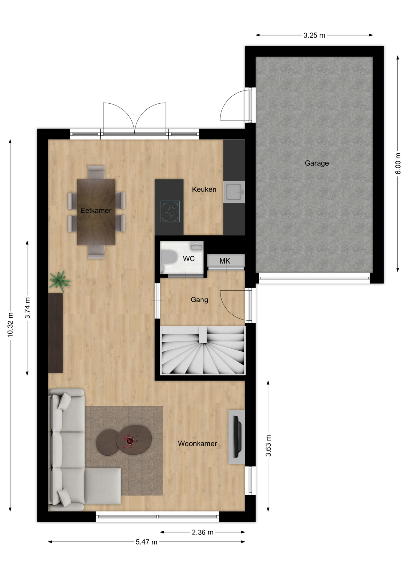 Via de entree kom je in de hal, die toegang biedt tot de meterkast, het toilet met fonteintje en de woonkamer. De woonkamer is ruim opgezet en dankzij de grote raampartijen heerlijk licht. Aansluitend bevindt zich de eetkamer, die via dubbele tuindeuren direct in verbinding staat met de sfeervolle achtertuin.