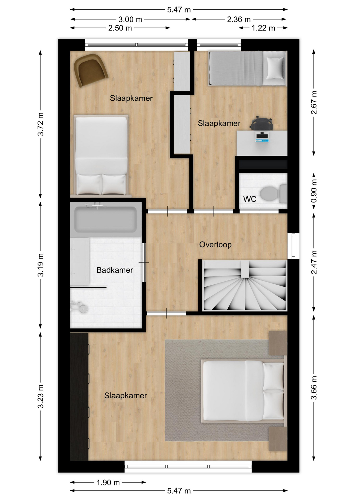 De ruime overloop biedt toegang tot drie slaapkamers en de badkamer. De grootste slaapkamer (ca. 19 m²) bevindt zich aan de voorzijde van de woning en beschikt over veel lichtinval dankzij de grote ramen. De tweede slaapkamer (ca. 11 m²) en derde slaapkamer (ca. 8 m²) zijn gelegen aan de achterzijde en bieden voldoende ruimte voor bijvoorbeeld een werk- of kinderkamer. De moderne badkamer is praktisch ingericht en beschikt over een inloopdouche, ligbad en dubbele wastafel met meubel. Daarnaast is er nog een separaat toilet.