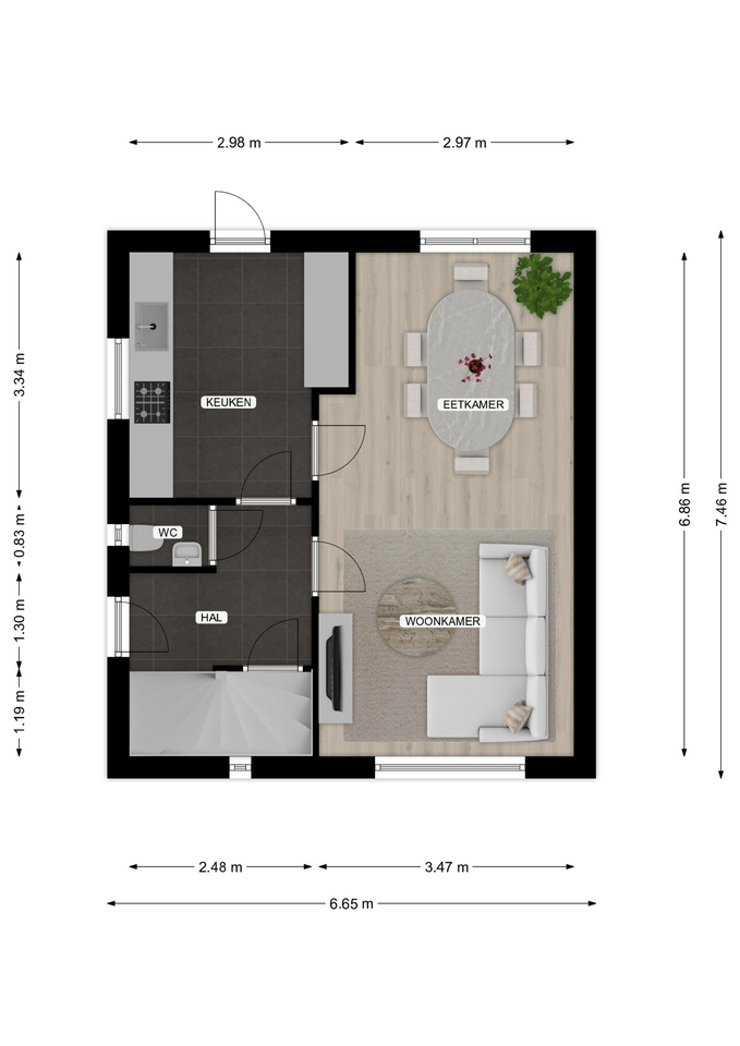 Entree via de voordeur naar een ruime hal met garderobe, vernieuwde meterkast en modern betegeld toilet met fontein. De hal is voorzien van lambrisering en een strakke plavuizenvloer.