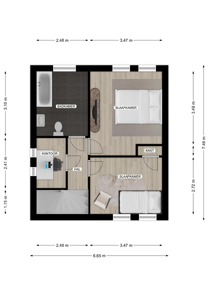 Overloop met toegang tot twee slaapkamers, beide voorzien van een laminaatvloer. Eén slaapkamer beschikt over een praktische inbouwkast. De ruime, betegelde badkamer is ingericht met wastafel, ligbad en tweede toilet.