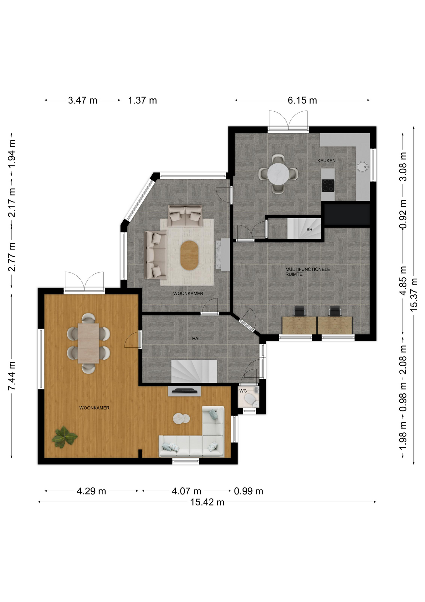 De royale hal met trapopgang en gastentoilet met staand toilet en fonteintje biedt toegang tot de 2 woonkamers en de werkkamer/multifunctionele ruimte.