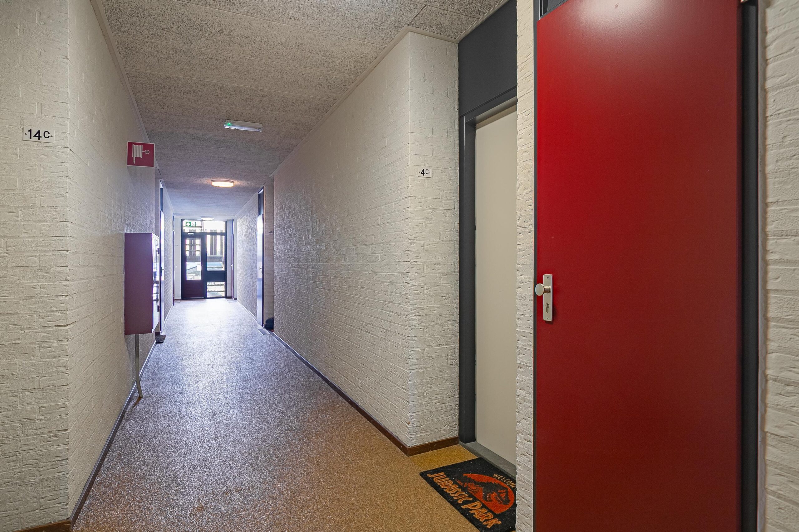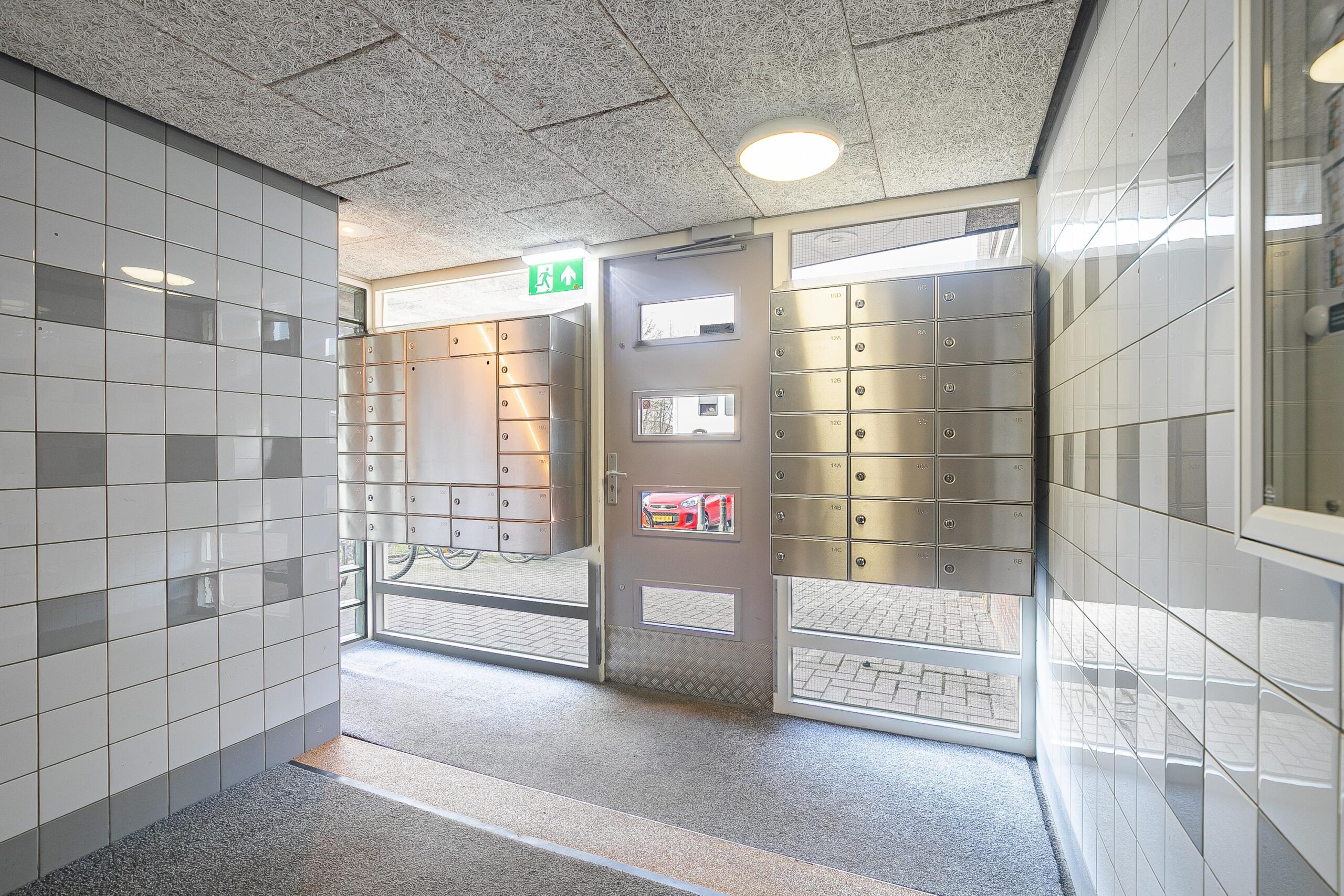 Centrale entree met brievenbussen, bellentableau en toegang tot het trappenhuis en lift.