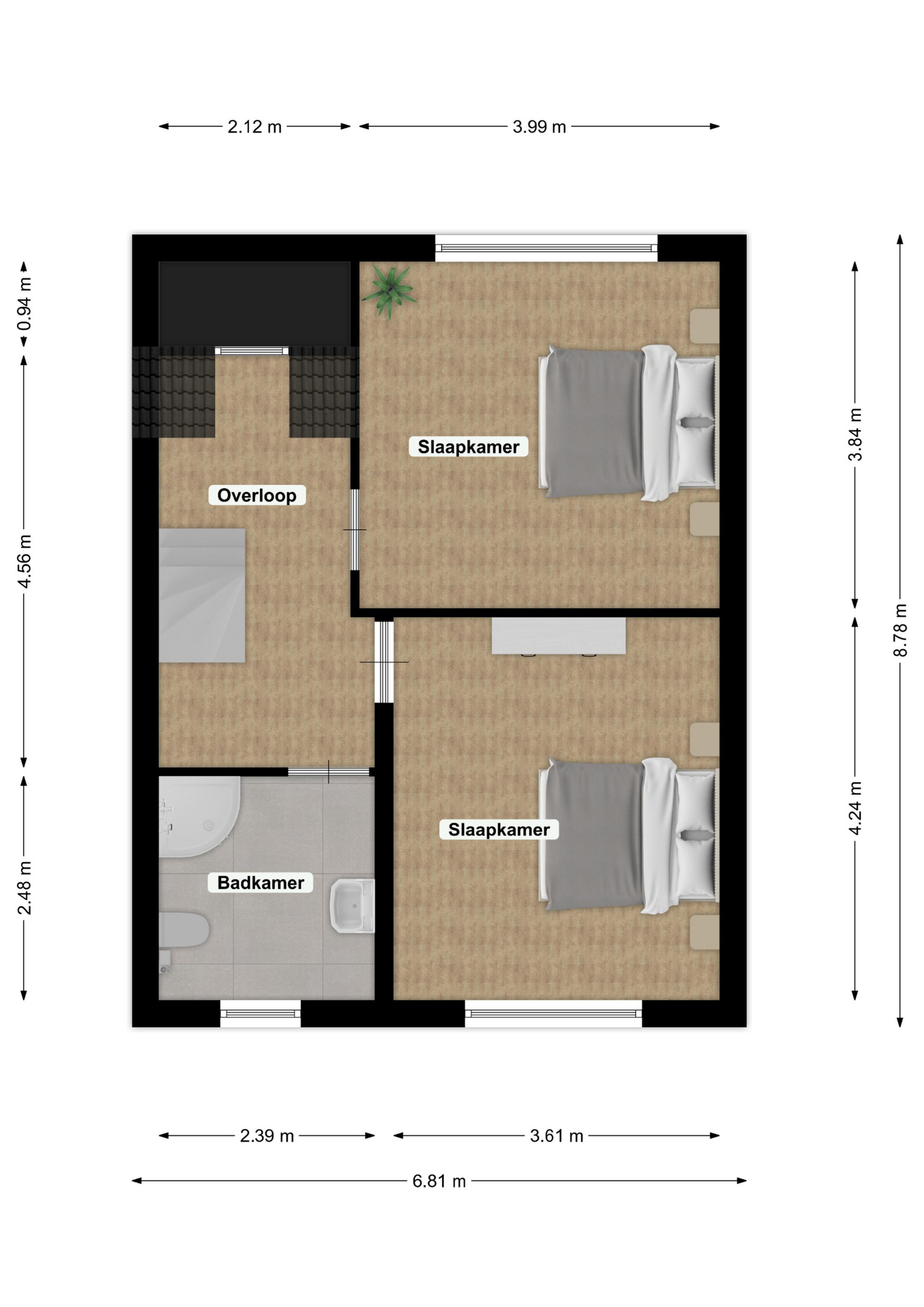 De overloop biedt toegang tot twee ruime slaapkamers van respectievelijk: