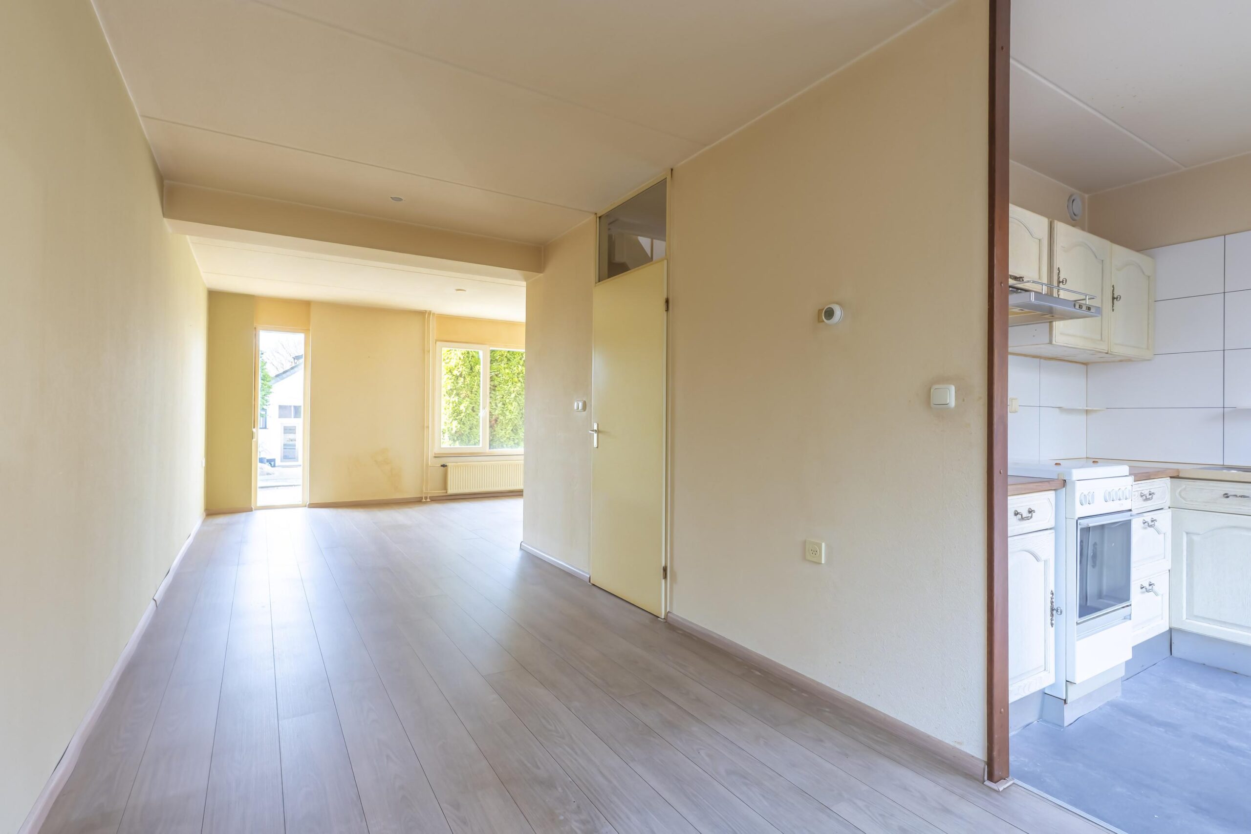 Begane grond: oprit, voortuin, entree, hal met meterkast en trappenhuis, toilet met fonteintje, L-vormige woonkamer met laminaatvloer en een open keuken met eenvoudige keuken-installatie in hoekopstelling met losse apparatuur zoals koelkast, gasfornuis en oven. Vanuit hier toegang tot de tuin ingericht met terras, grond en omsloten foor een groene haag. De aangebouwde stenen garage met kantelpoort is ook via de tuin bereikbaar.