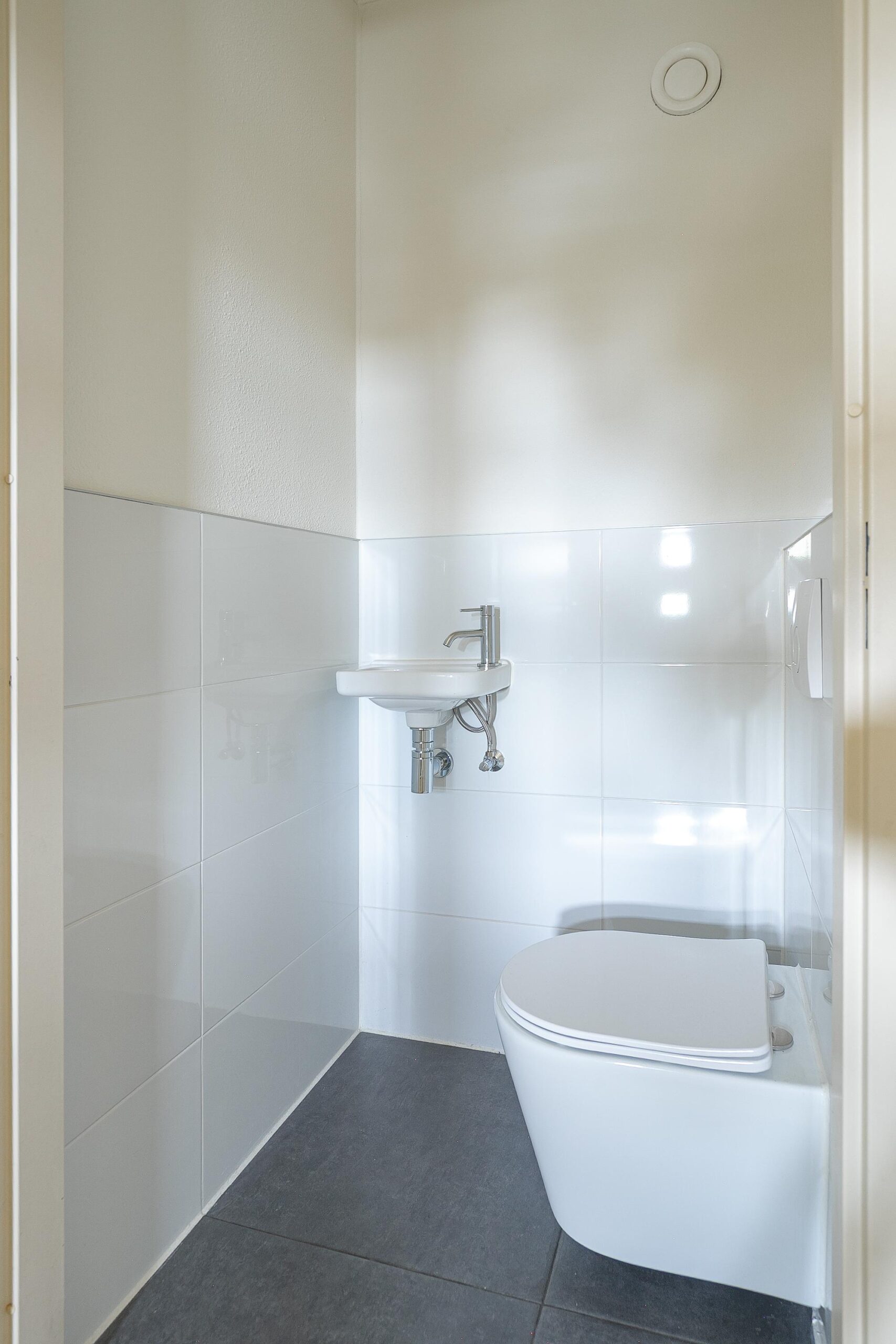 De moderne, ruime badkamer is volledig betegeld en voorzien van een douche, vaste wastafel en 2e toilet.