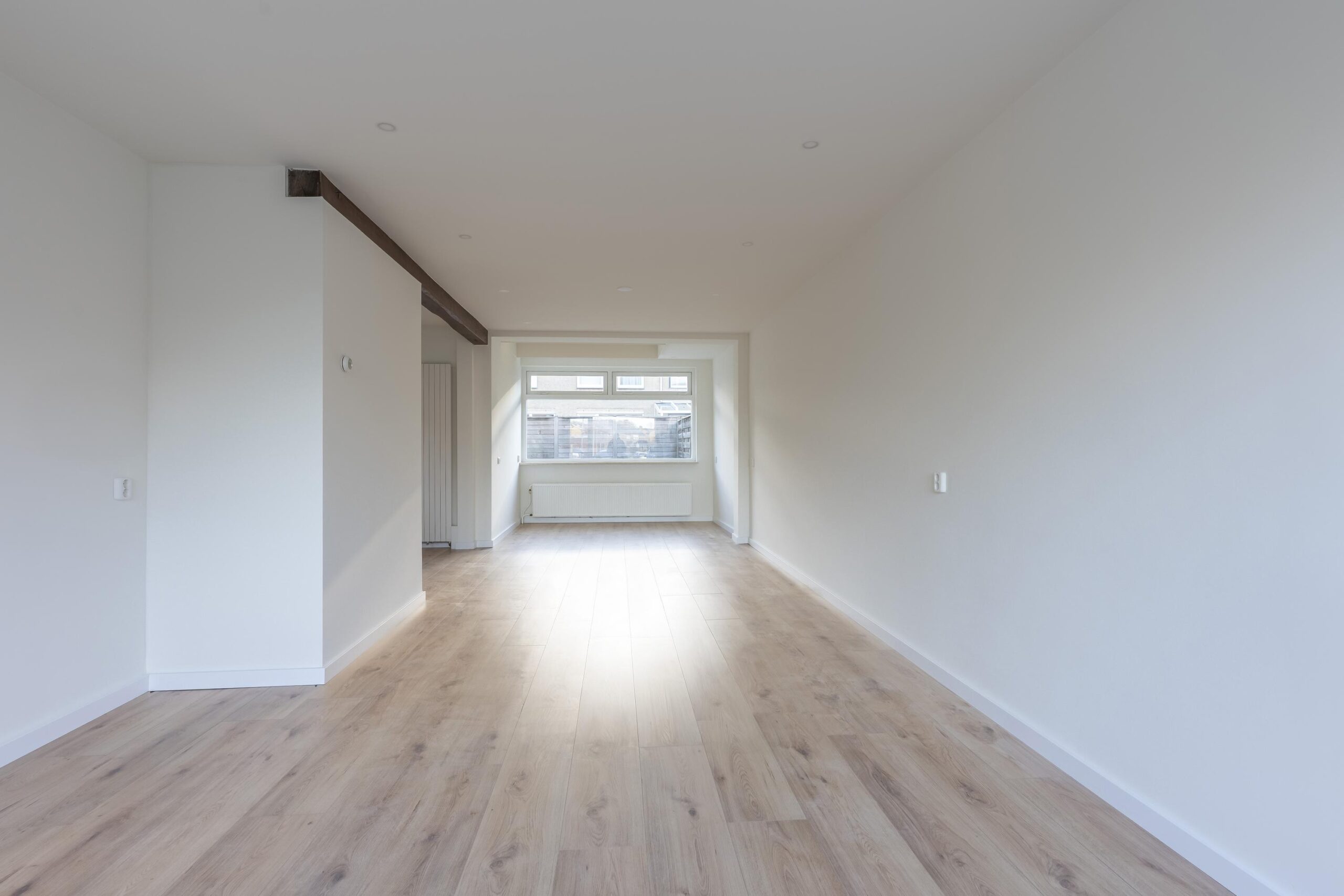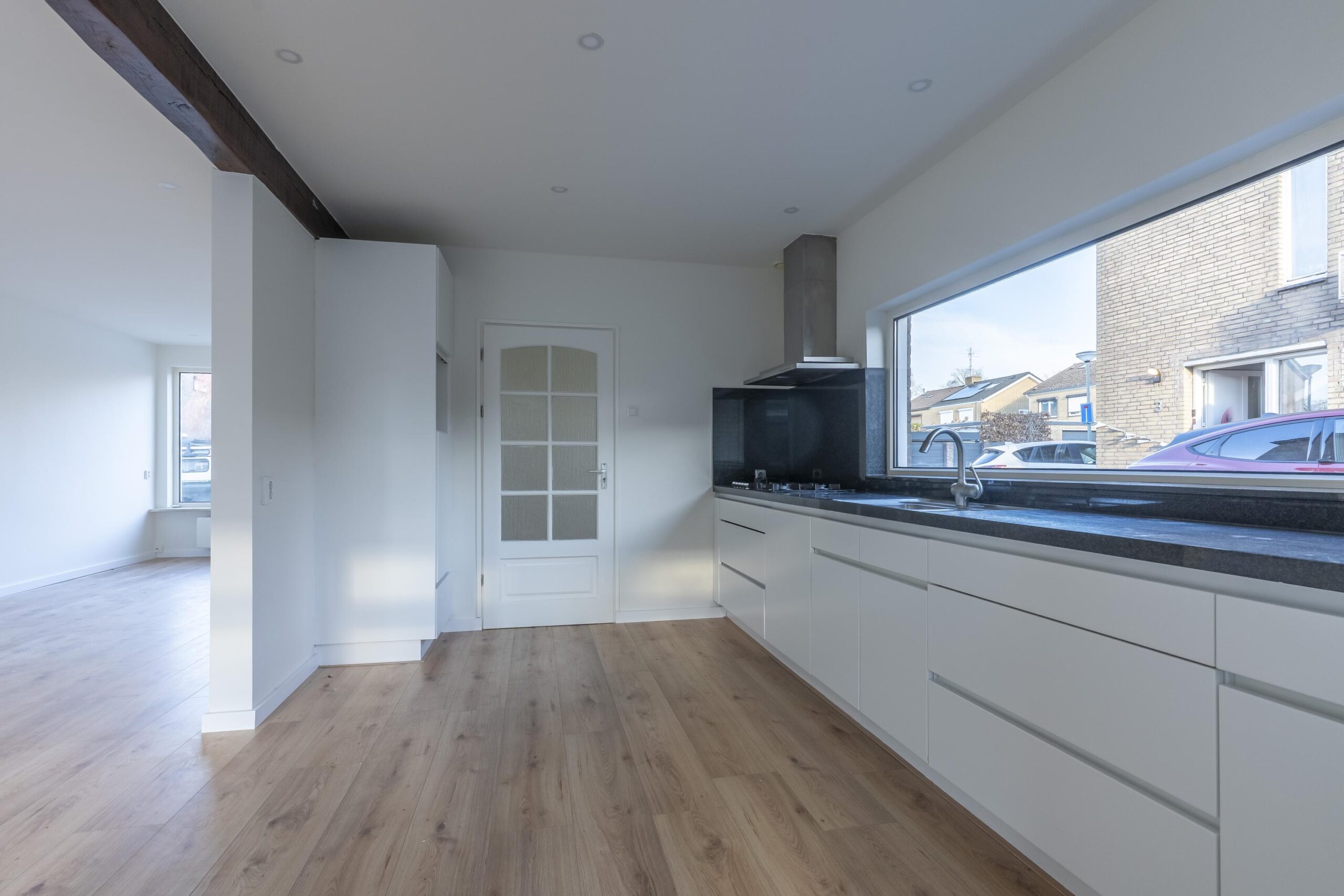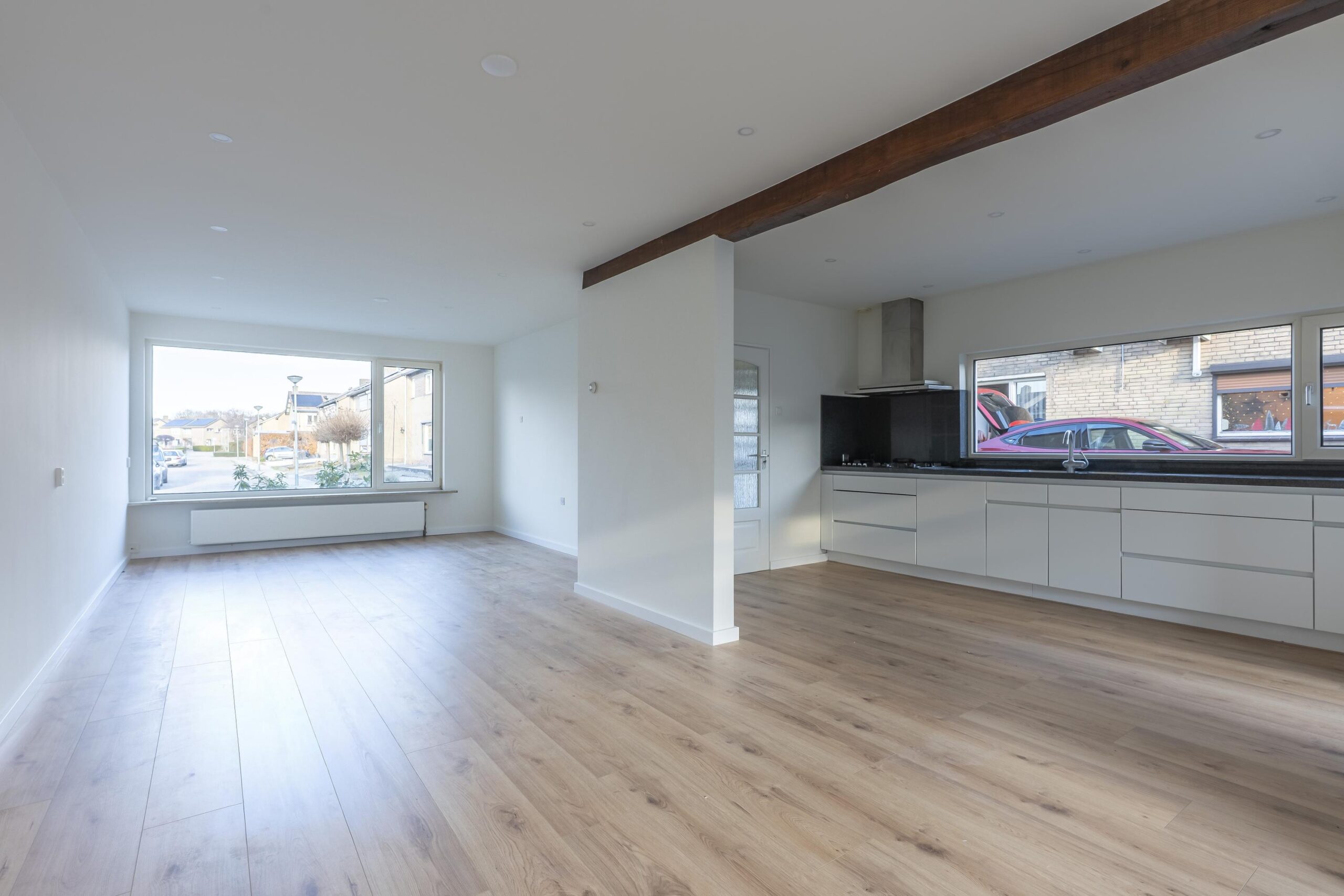 De doorzon woonkamer met open keuken is groot ca. 47 m² en is voorzien van een laminaatvloer.