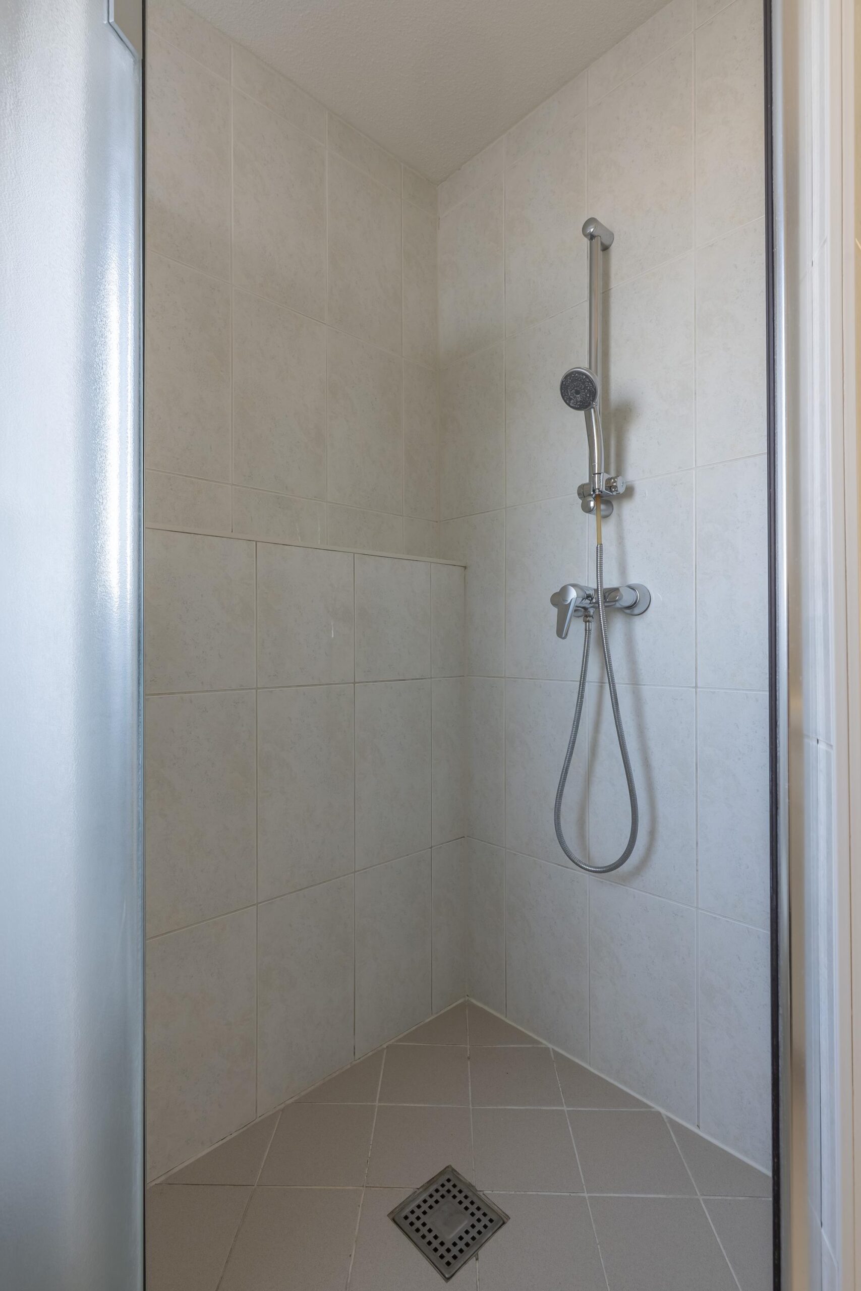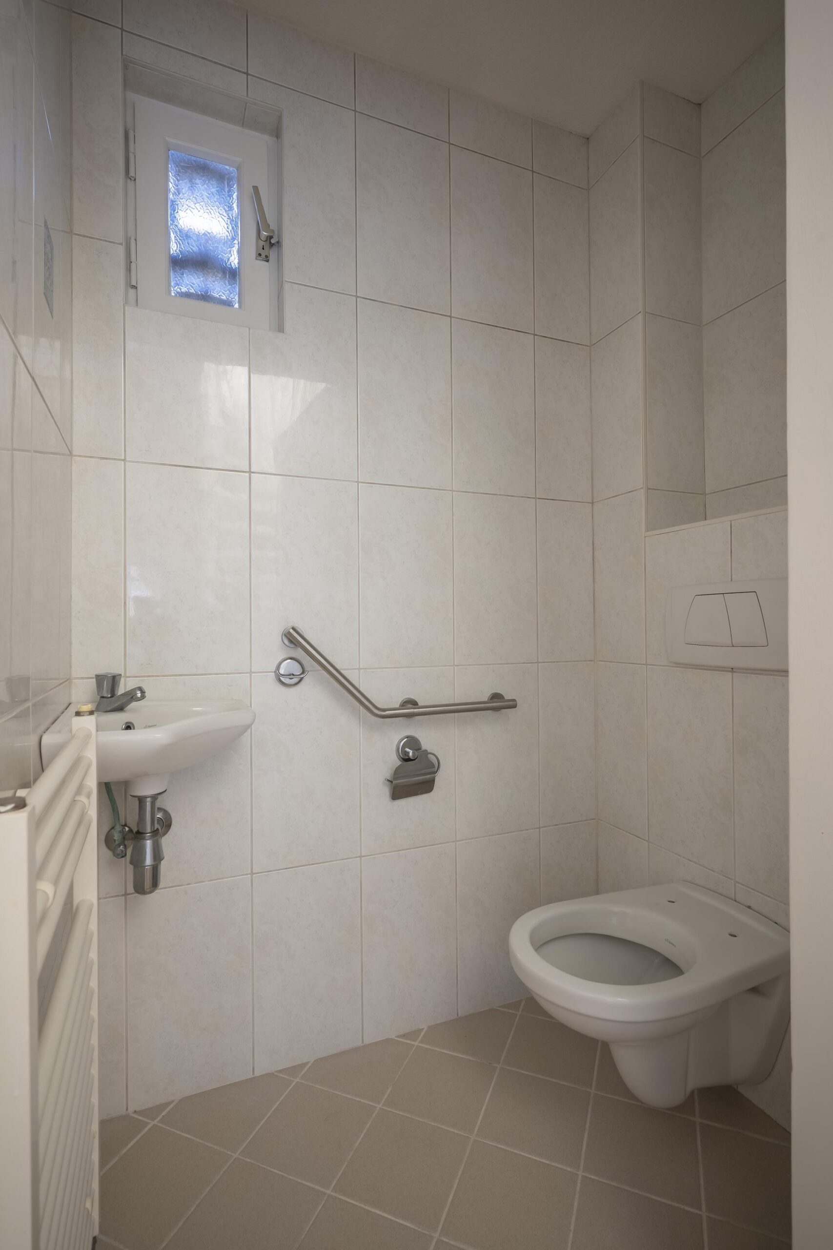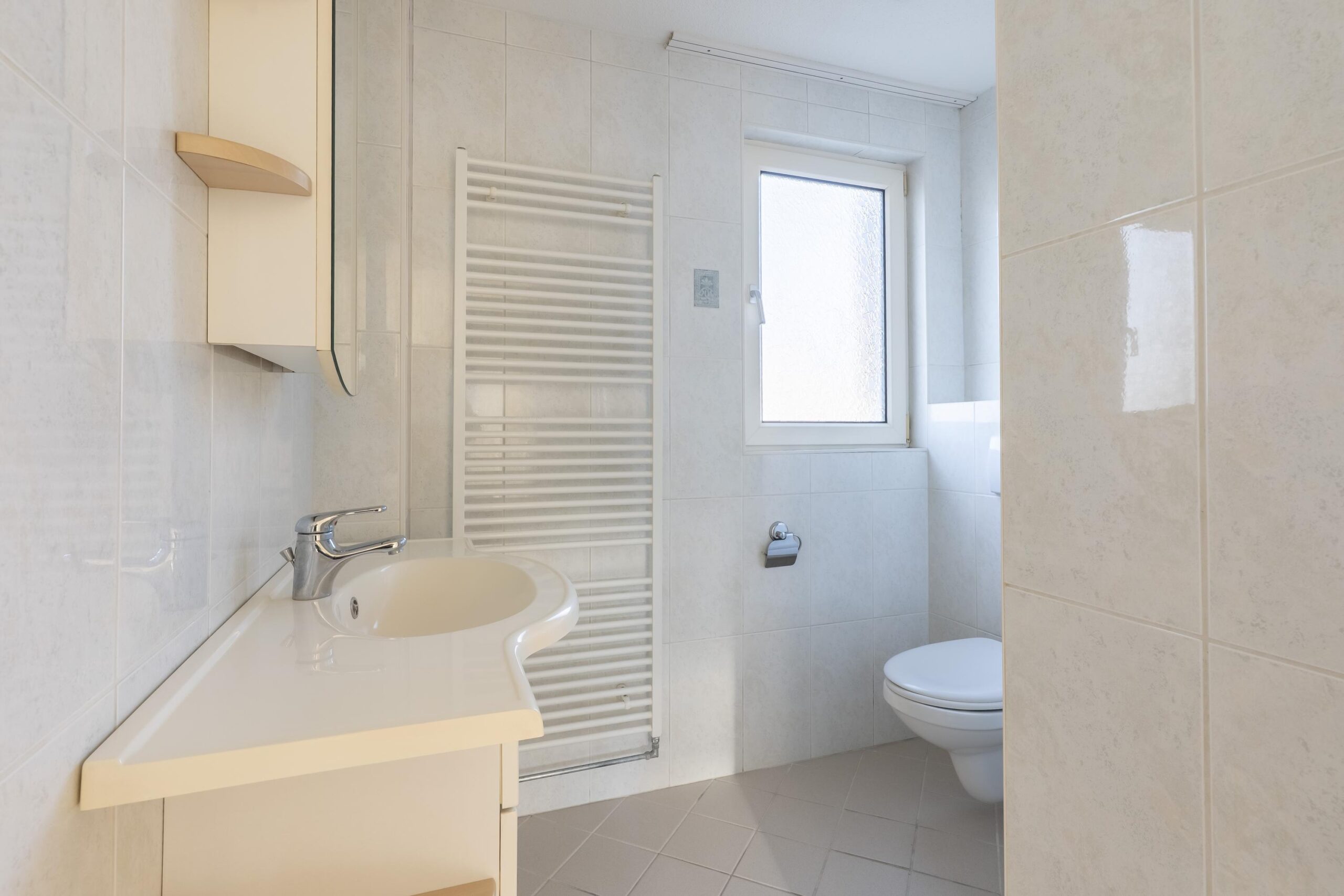 De geheel betegelde badkamer is groot ca. 4 m² en voorzien van een douche, zwevend toilet en vaste wastafel met meubel.
