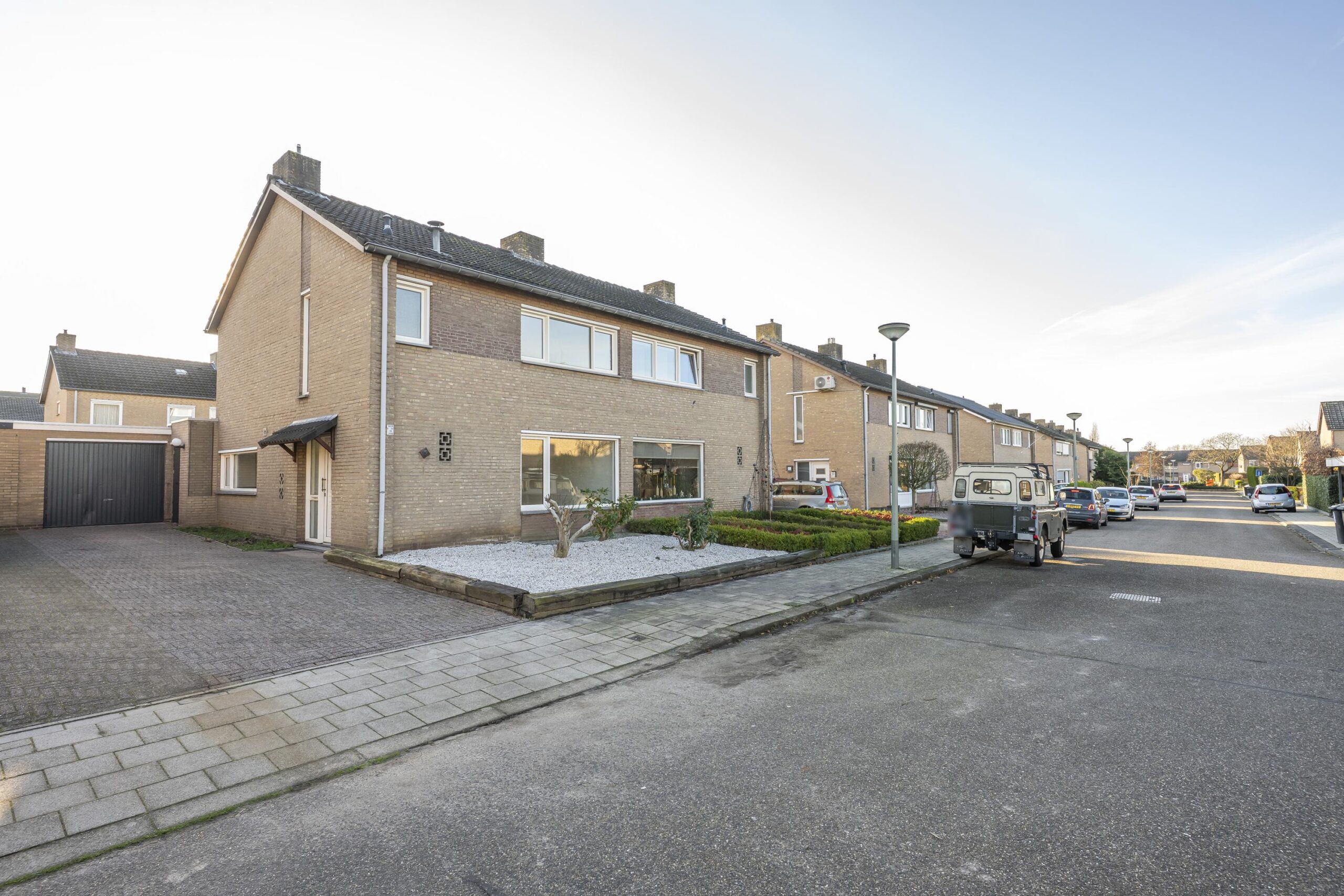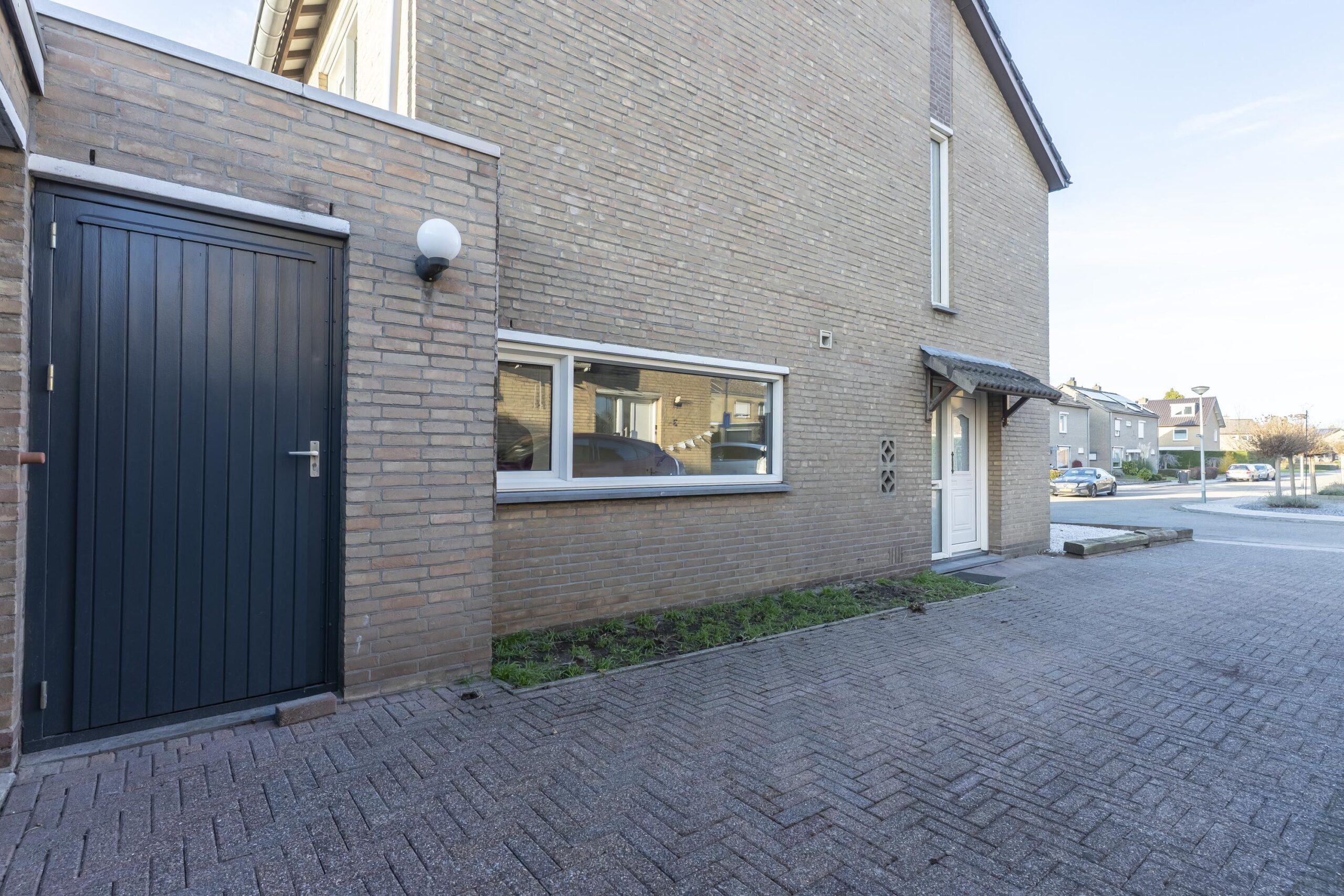 Onderhoudsvriendelijke voortuin met royale oprit en overdekte entree.
