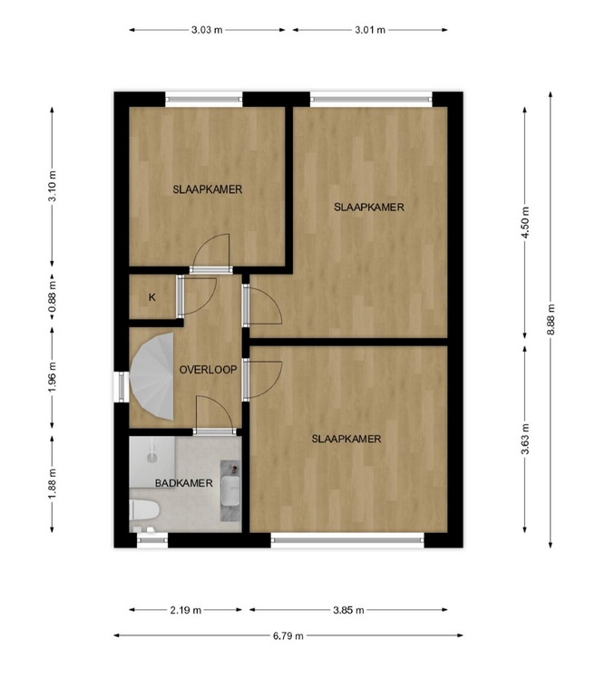 De slaapkamers zijn respectievelijk groot ca. 15 m², 14 m² en 9 m² en zijn allen voorzien van een laminaatvloer.