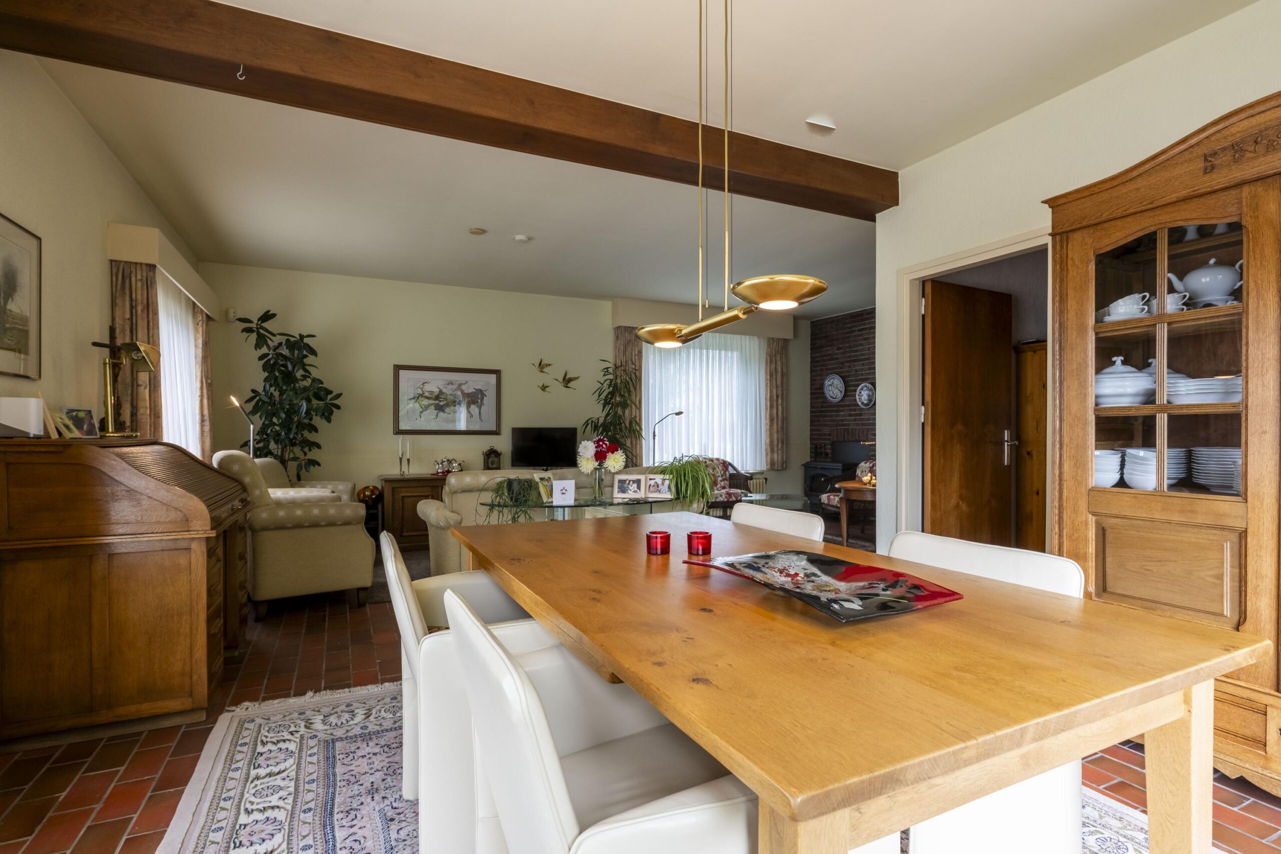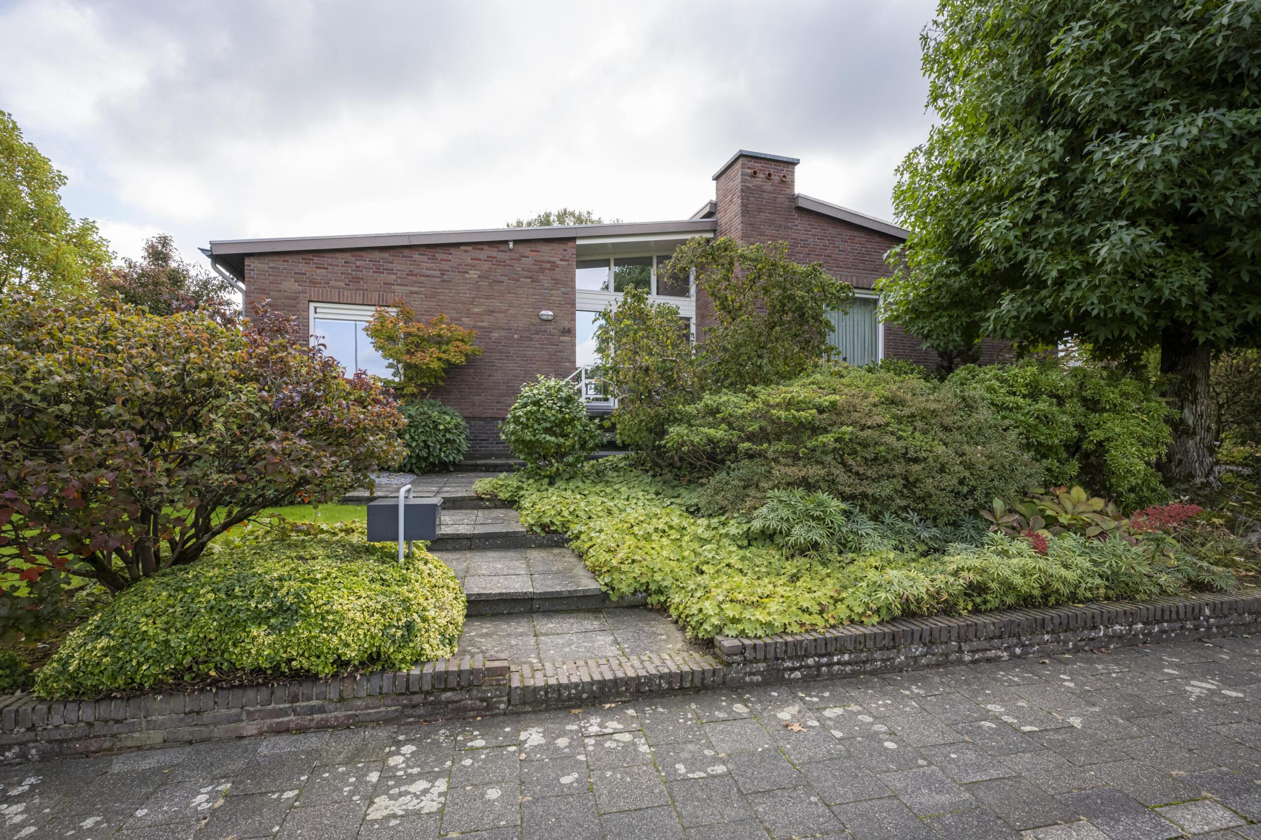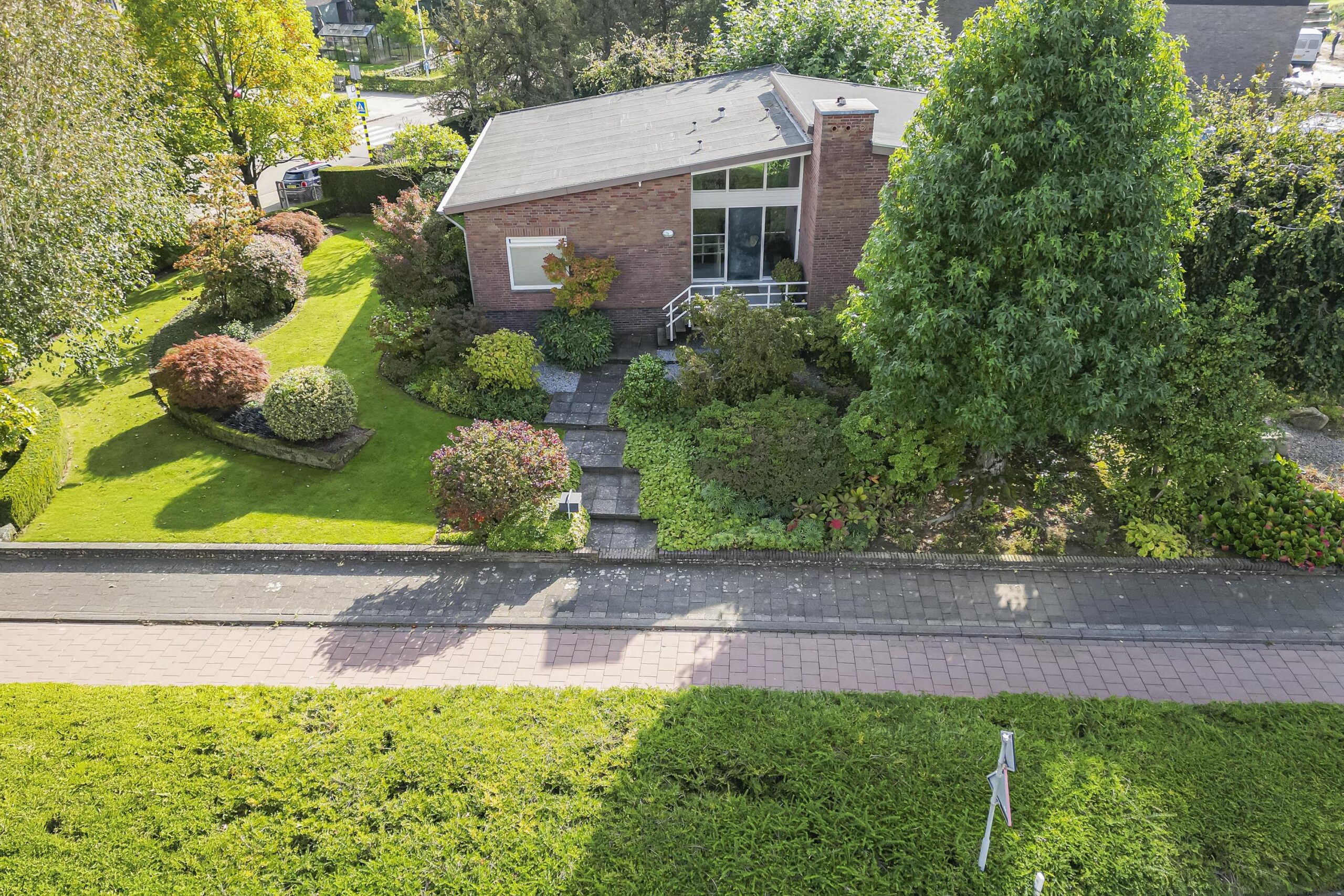 Weelderig en groen aangelegde voor-/zijtuin met pad leidend naar de fraaie overdekte entree via trappartij en bordes met koperen voordeur (ontworpen door Jos Hermans). Ruime ontvangsthal met plavuizen vloer, granolstucwerk, garderobe, trap naar souterrain en toegang tot de woon- en slaapvleugel. Geheel betegelde moderne toiletruimte met hangcloset, fontein en automatisch geschakelde led inbouwspots (vernieuwd in 2014). Ruime en lichte L-vormige woonkamer (ca. 45 m2) voorzien van plavuizen vloer, fraaie houtkachel en schuifpui naar het aan de achterzijde gelegen terras met uitzicht op de tuin. Aangrenzend de ruime woonkeuken (ca. 30 m2) met plavuizen vloer, granolstucwerk en houten schrootjes plafond. Momenteel is de leefkeuken onderverdeeld in een kantoorgedeelte met tuintoegang, het eetgedeelte en een keukengedeelte met U-vormige keukeninstallatie v.v. voldoende opbergruimte, afzuigkap (1999), 4-pits keramische kookplaat (2018), vaatwasser (2022), combioven (2022), koelkast met vriesvak (1999) en werkblad met spoelbak en afdruiprek. Vanuit de hal bereikbare gang richting slaapkamers en badkamer. Slaapkamer 1 (ca. 12 m2) aan voorzijde met vloerbedekking, sierpleister, strak plafond en wastafel. Slaapkamer 2 (ca. 14 m2) in het midden met vergelijkbare afwerking, zonder wastafel maar met inbouwkast. Slaapkamer 3 (ca. 9 m2) aan achterzijde eveneens met vloerbedekking, sierpleister en strak plafond. Tot slot de volledig betegelde moderne badkamer (ca. 4 m2) voorzien van ligbad met douchemogelijkheid en wegklapbaar spatscherm, dubbele wastafel in meubel met spiegelkast en designradiator (vernieuwd in 2014). Aansluitend aan de woonkamer en keuken ligt een gezellig terras (ca. 29 m2) over twee niveaus met verlichting, fraaie plataan en trappartij naar de achtertuin/oprit.