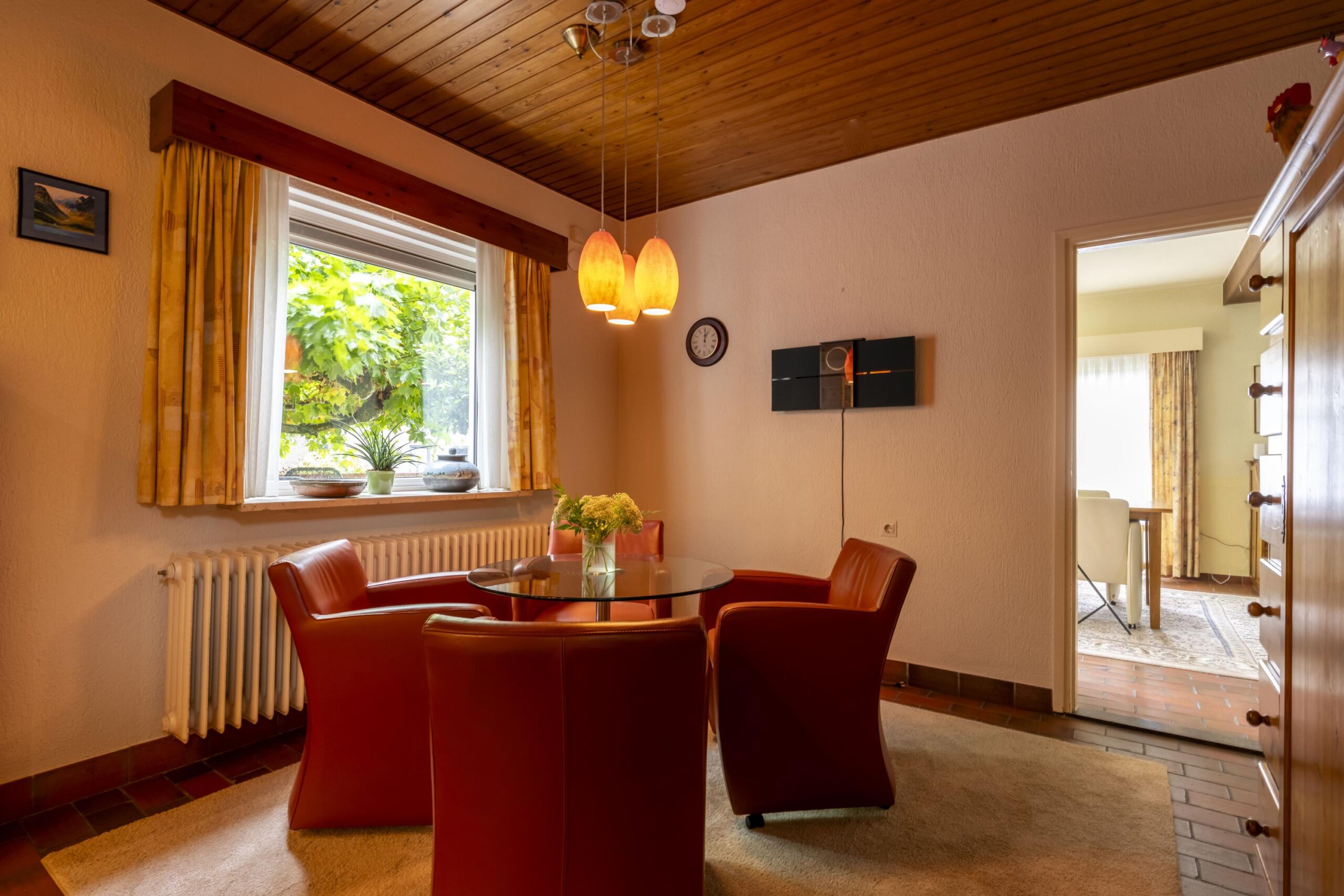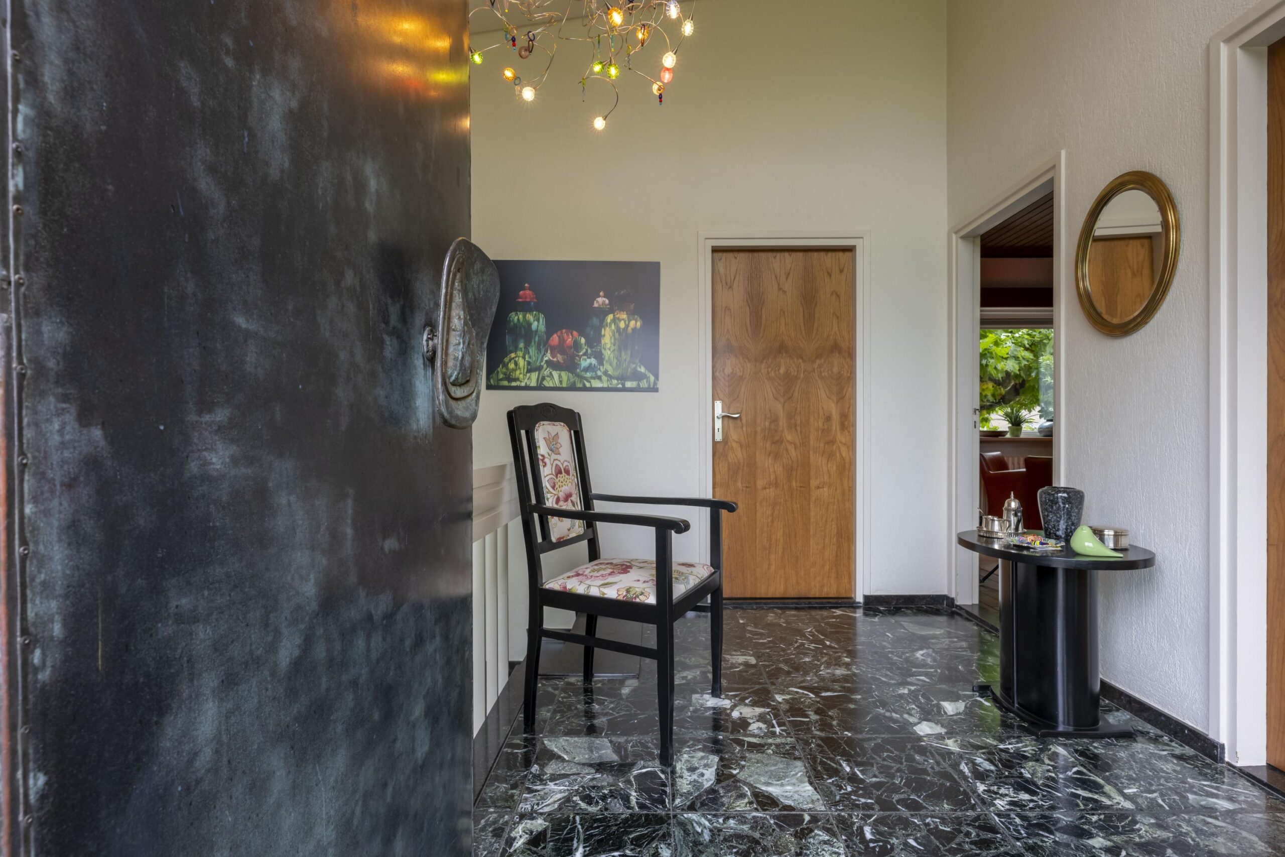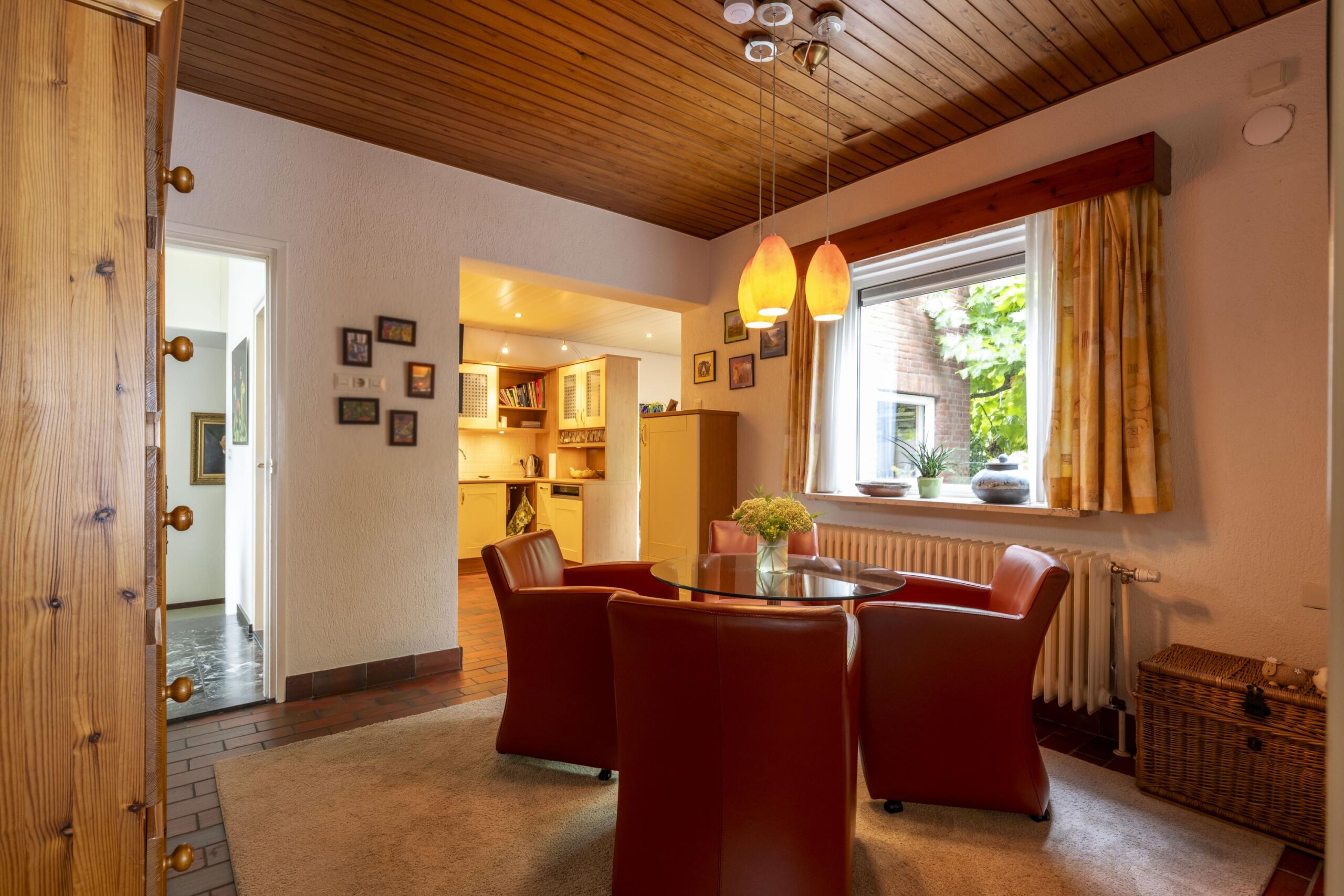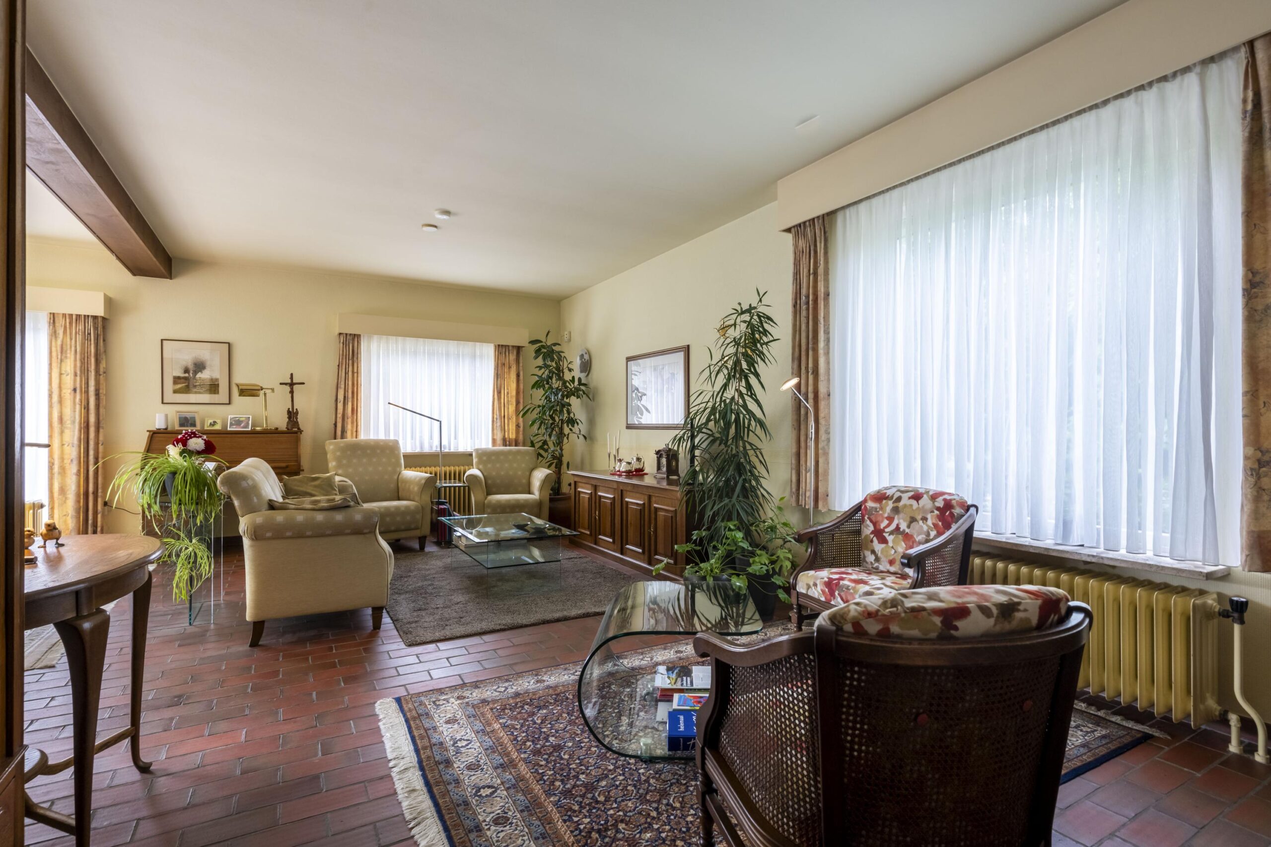 Weelderig en groen aangelegde voor-/zijtuin met pad leidend naar de fraaie overdekte entree via trappartij en bordes met koperen voordeur (ontworpen door Jos Hermans). Ruime ontvangsthal met plavuizen vloer, granolstucwerk, garderobe, trap naar souterrain en toegang tot de woon- en slaapvleugel. Geheel betegelde moderne toiletruimte met hangcloset, fontein en automatisch geschakelde led inbouwspots (vernieuwd in 2014). Ruime en lichte L-vormige woonkamer (ca. 45 m2) voorzien van plavuizen vloer, fraaie houtkachel en schuifpui naar het aan de achterzijde gelegen terras met uitzicht op de tuin. Aangrenzend de ruime woonkeuken (ca. 30 m2) met plavuizen vloer, granolstucwerk en houten schrootjes plafond. Momenteel is de leefkeuken onderverdeeld in een kantoorgedeelte met tuintoegang, het eetgedeelte en een keukengedeelte met U-vormige keukeninstallatie v.v. voldoende opbergruimte, afzuigkap (1999), 4-pits keramische kookplaat (2018), vaatwasser (2022), combioven (2022), koelkast met vriesvak (1999) en werkblad met spoelbak en afdruiprek. Vanuit de hal bereikbare gang richting slaapkamers en badkamer. Slaapkamer 1 (ca. 12 m2) aan voorzijde met vloerbedekking, sierpleister, strak plafond en wastafel. Slaapkamer 2 (ca. 14 m2) in het midden met vergelijkbare afwerking, zonder wastafel maar met inbouwkast. Slaapkamer 3 (ca. 9 m2) aan achterzijde eveneens met vloerbedekking, sierpleister en strak plafond. Tot slot de volledig betegelde moderne badkamer (ca. 4 m2) voorzien van ligbad met douchemogelijkheid en wegklapbaar spatscherm, dubbele wastafel in meubel met spiegelkast en designradiator (vernieuwd in 2014). Aansluitend aan de woonkamer en keuken ligt een gezellig terras (ca. 29 m2) over twee niveaus met verlichting, fraaie plataan en trappartij naar de achtertuin/oprit.