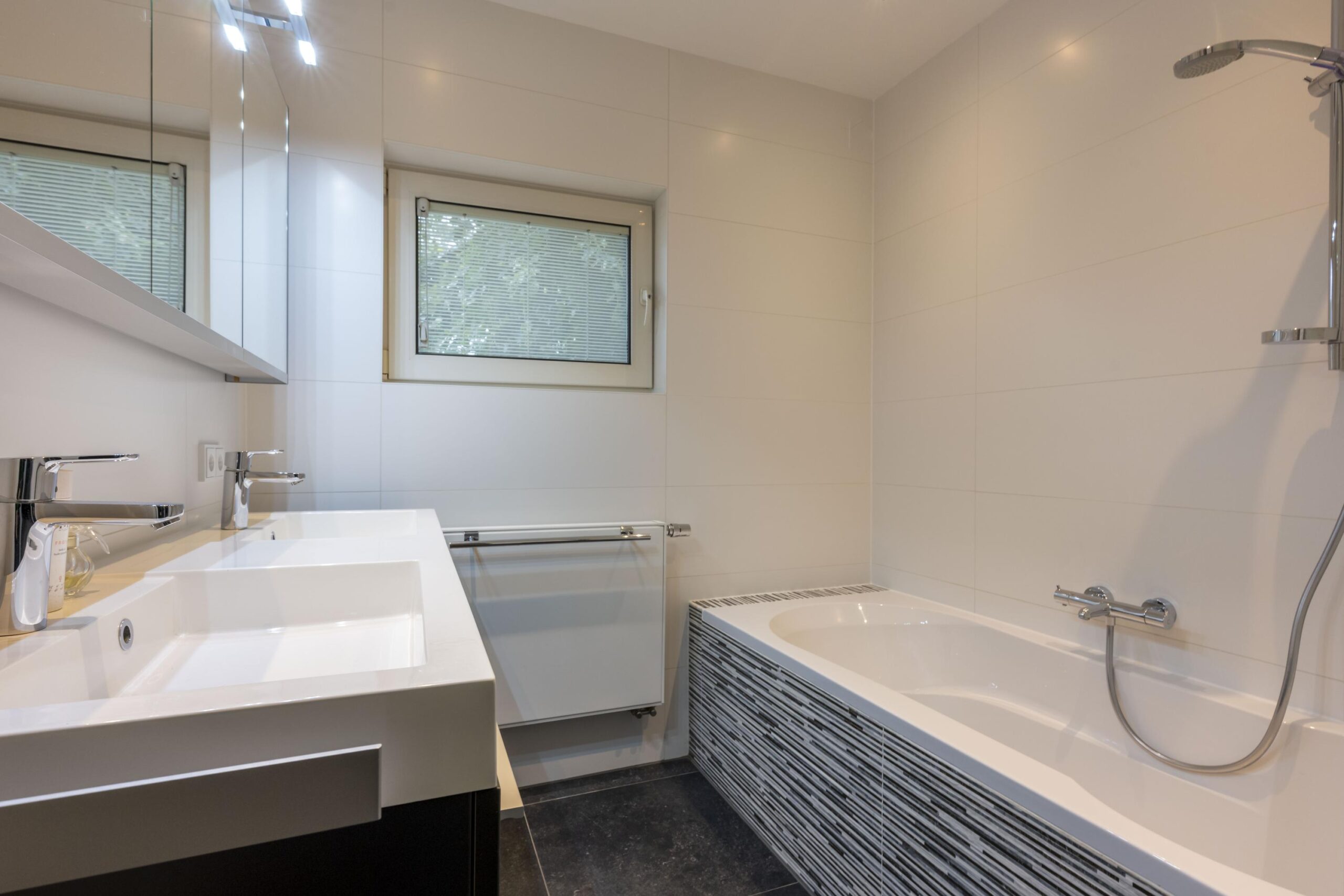 - Badkamervoorzieningen Ligbad, dubbele wastafel, wastafelmeubel