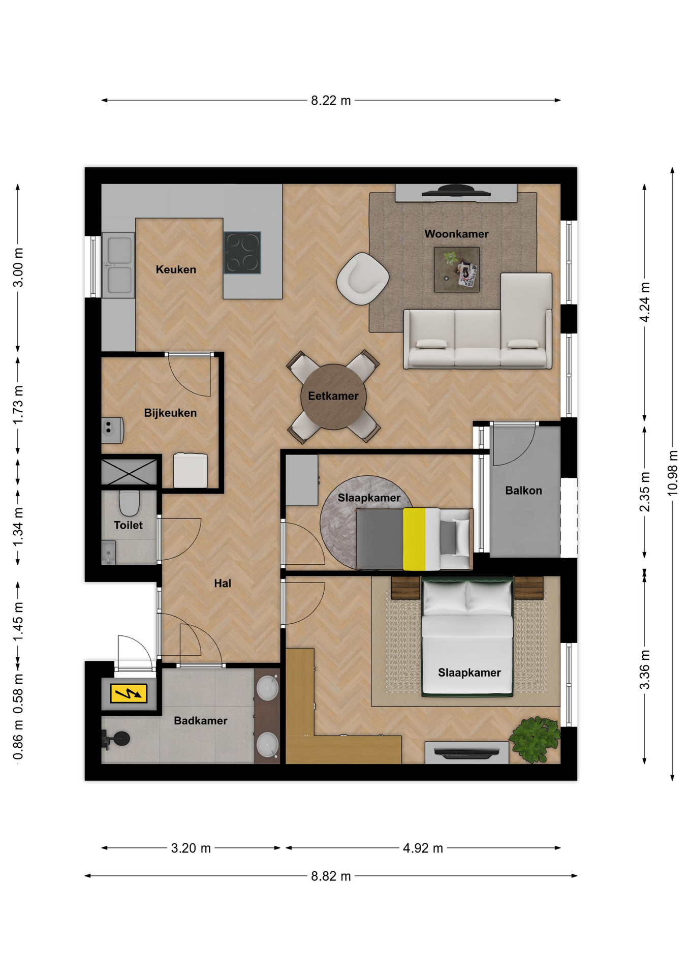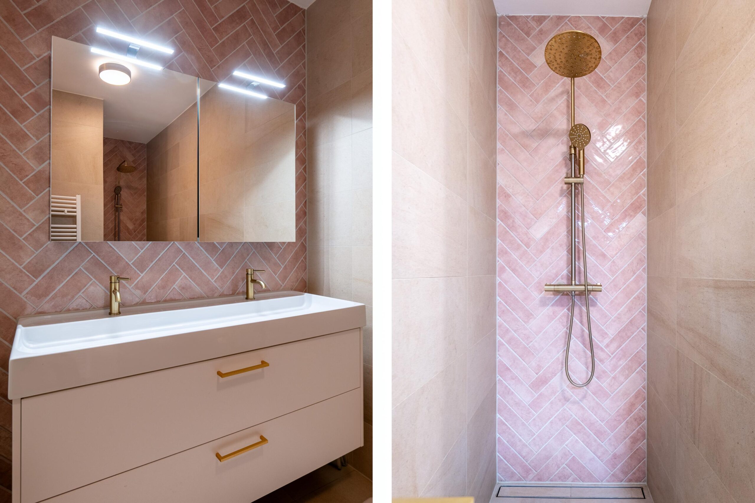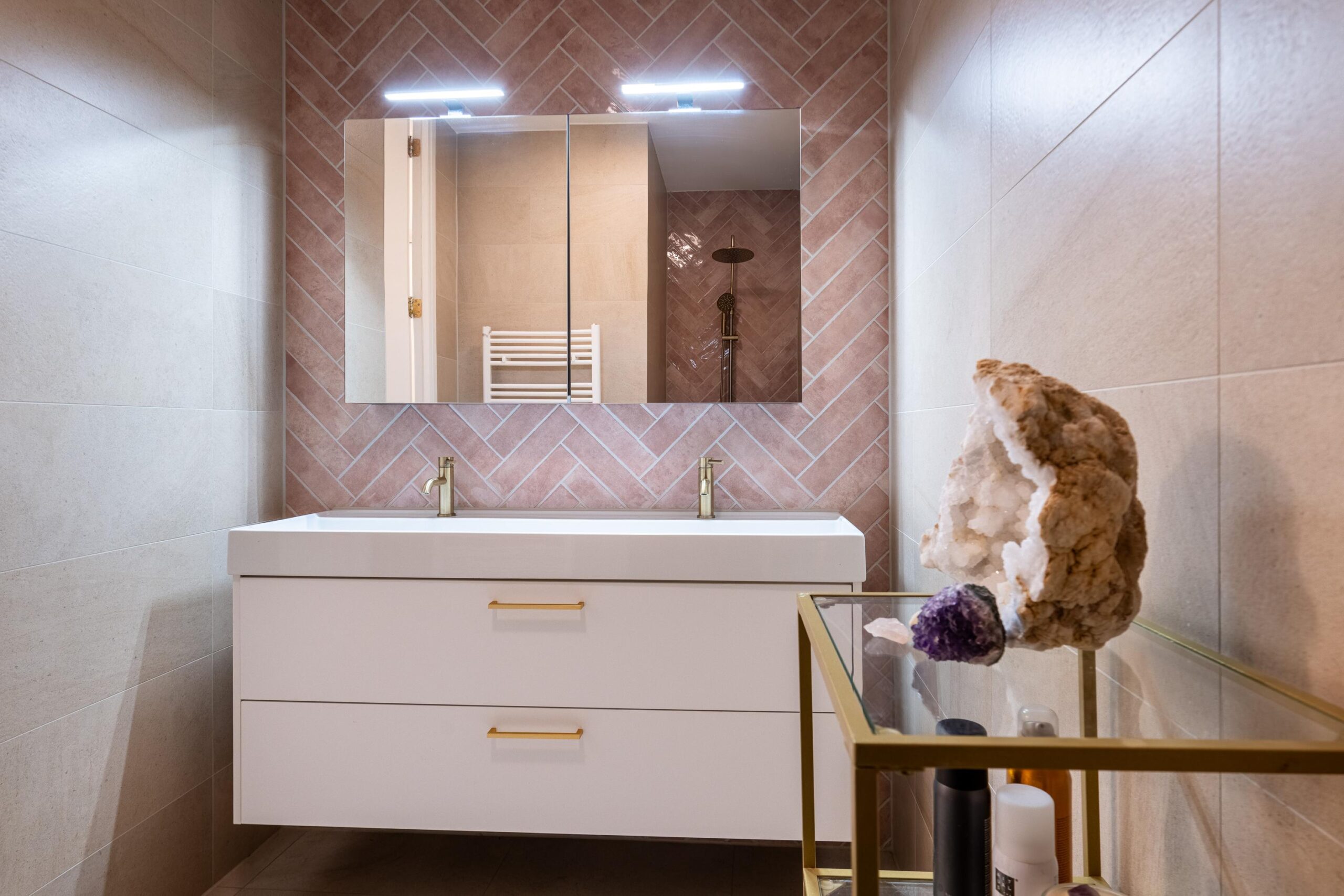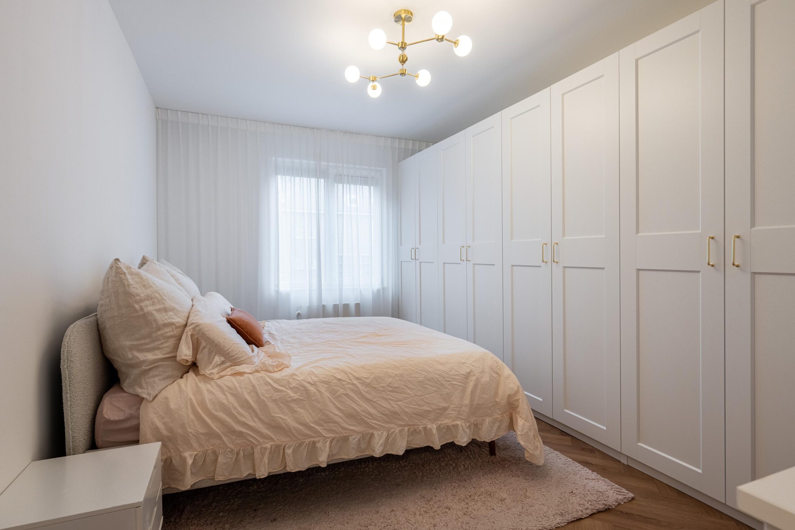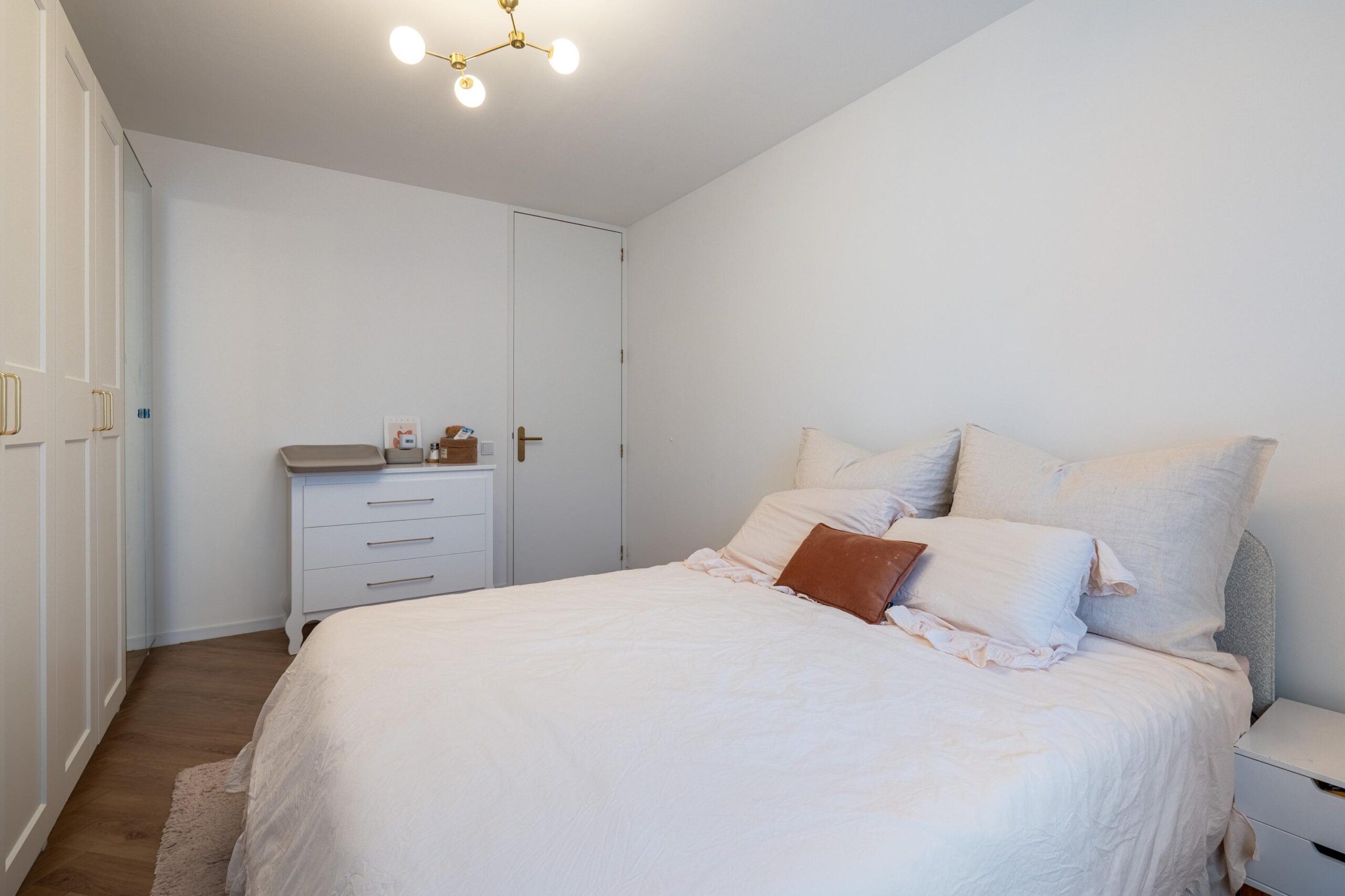 De twee slaapkamers zijn respectievelijk 17m2 en 7m2 groot, eveneens met pvc-visgraatvloer. De luxe badkamer is geheel betegeld en uitgerust met een inloopdouche met regendouchefunctie en dubbele wastafel met meubel en spiegelkast. Tevens is er nog een separate toiletruimte met toilet en fonteintje.
