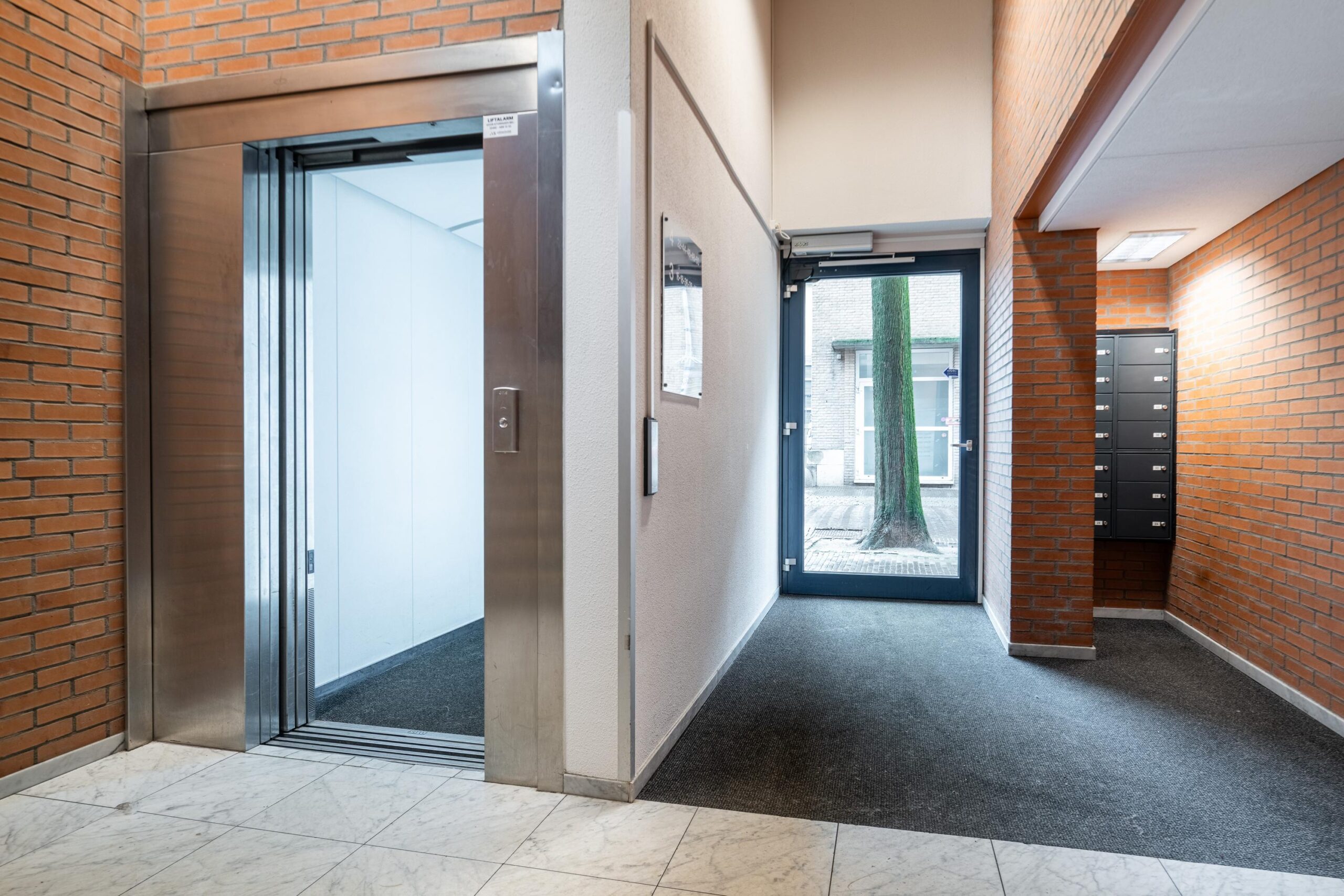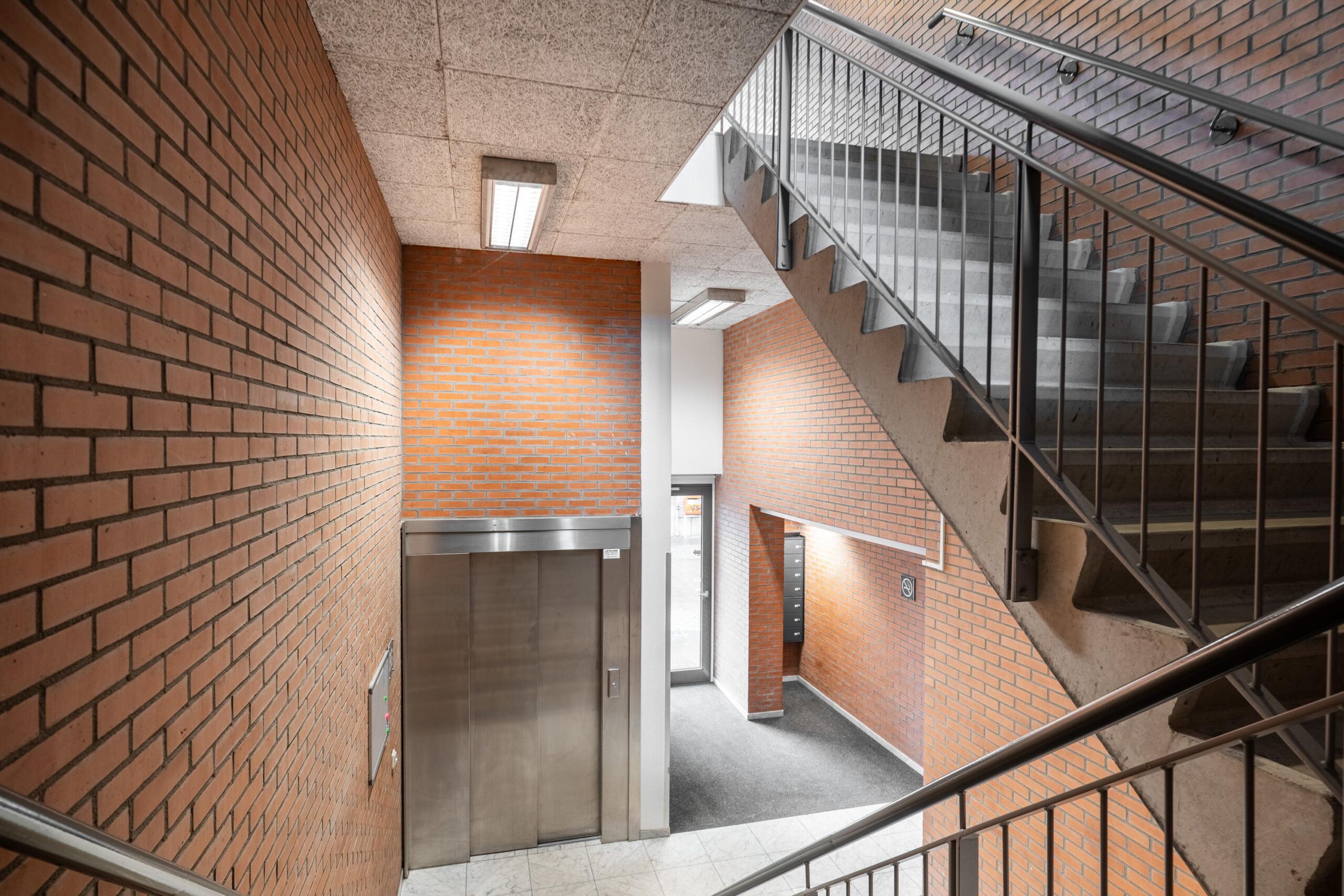 Gezamenlijke entree/hal met brievenbussen, bellentableau, trappenhuis en lift. De gezamenlijke ruimtes zien er netjes en verzorgd uit.