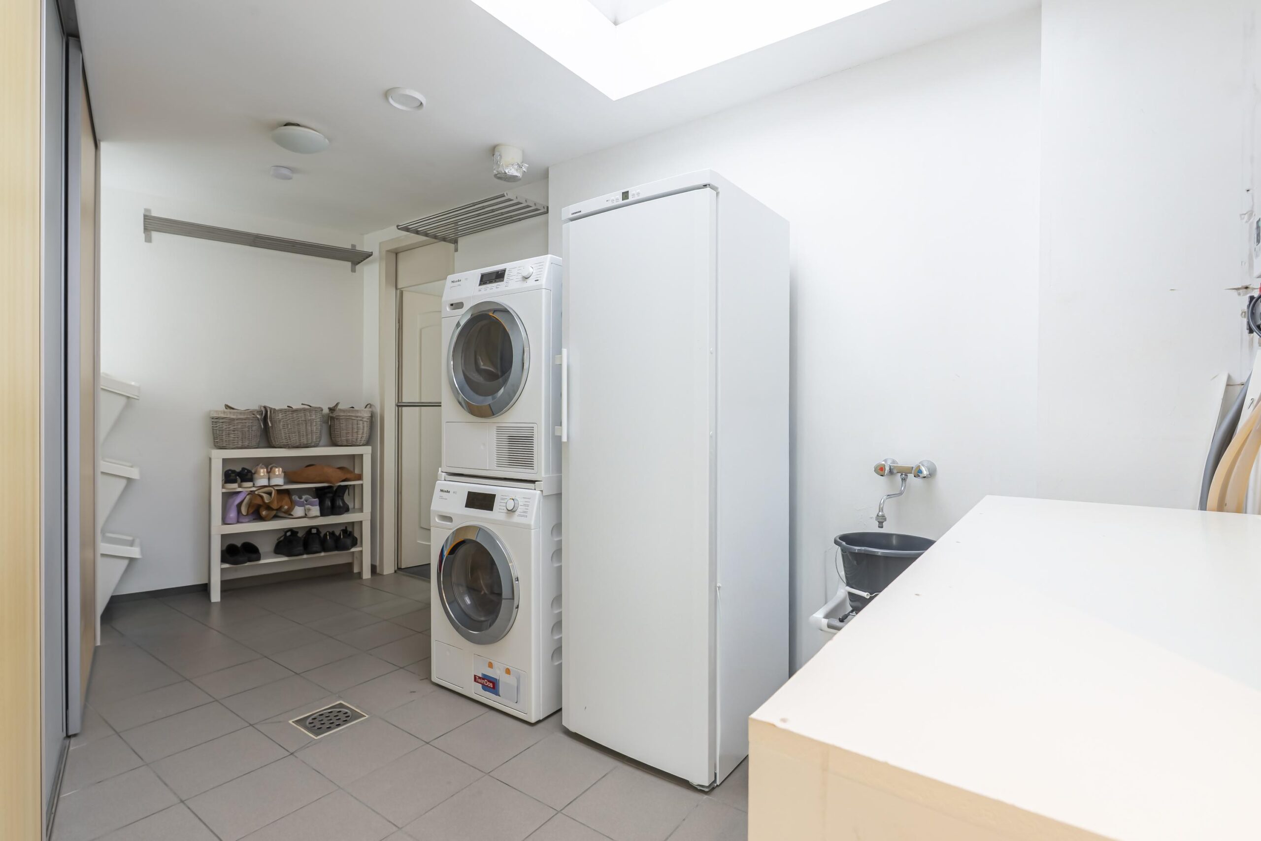 De ruime, betegelde bijkeuken is zowel vanuit de keuken als de hal bereikbaar en vormt een ideaal verlengstuk van de leefruimte. Deze praktische ruimte beschikt over een wasbak, aansluitingen voor witgoed, de verdeler van de vloerverwarming, een vaste kastenwand voor provisie en een lichtkoepel die zorgt voor extra natuurlijke lichtinval.