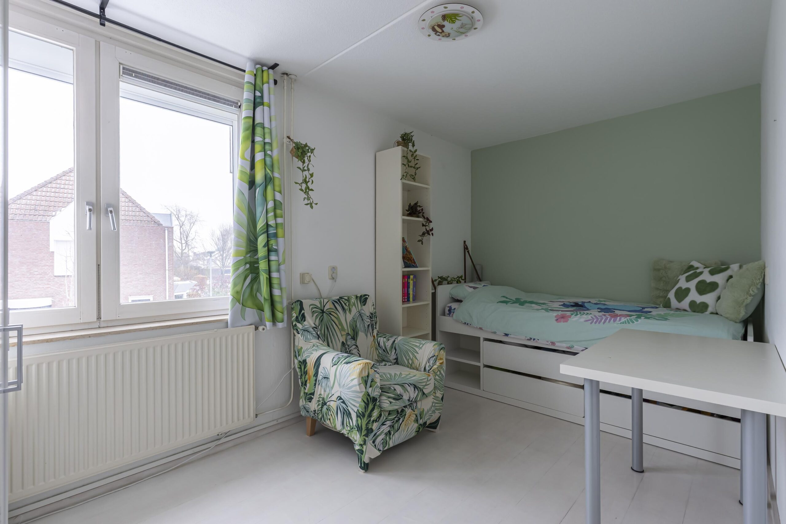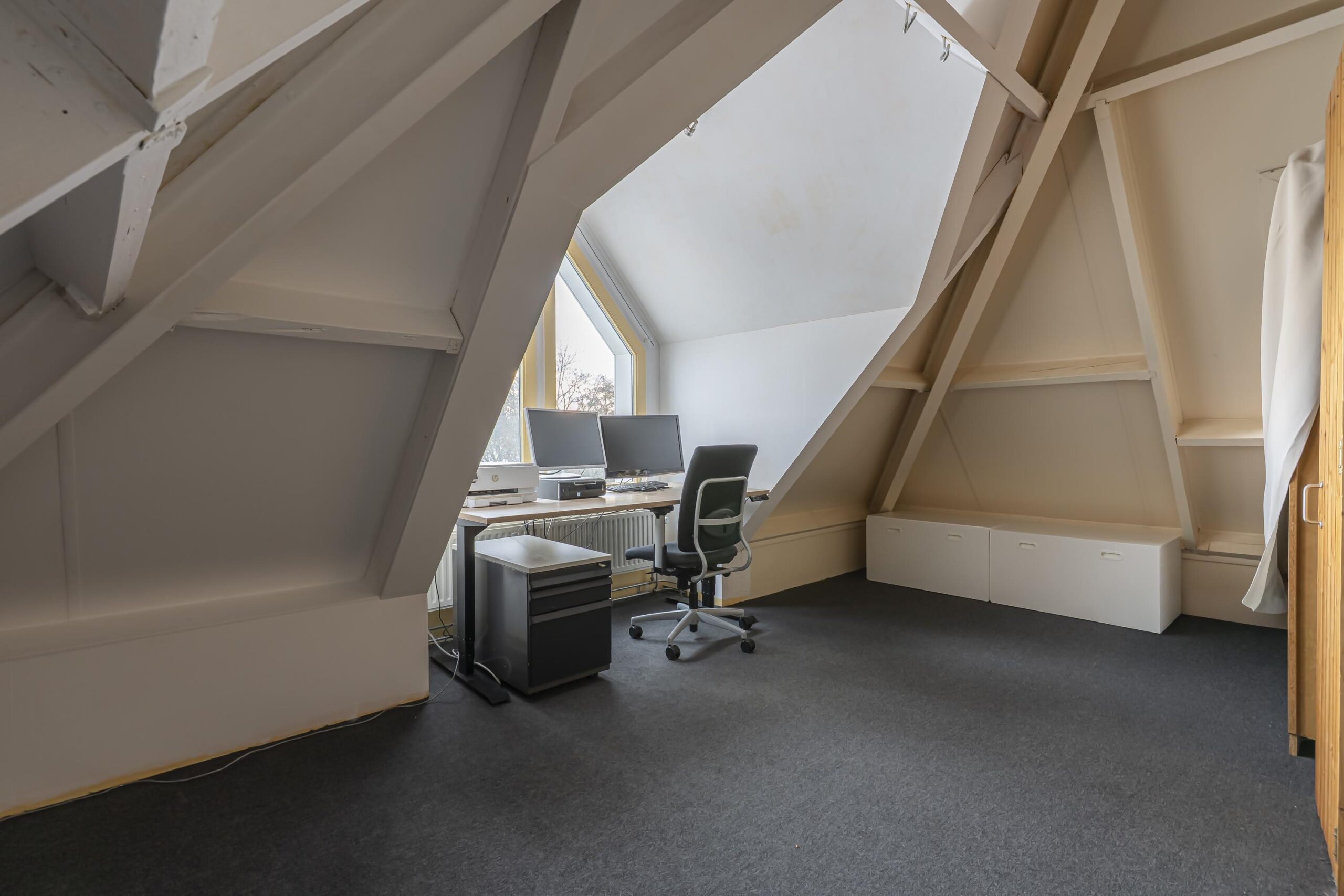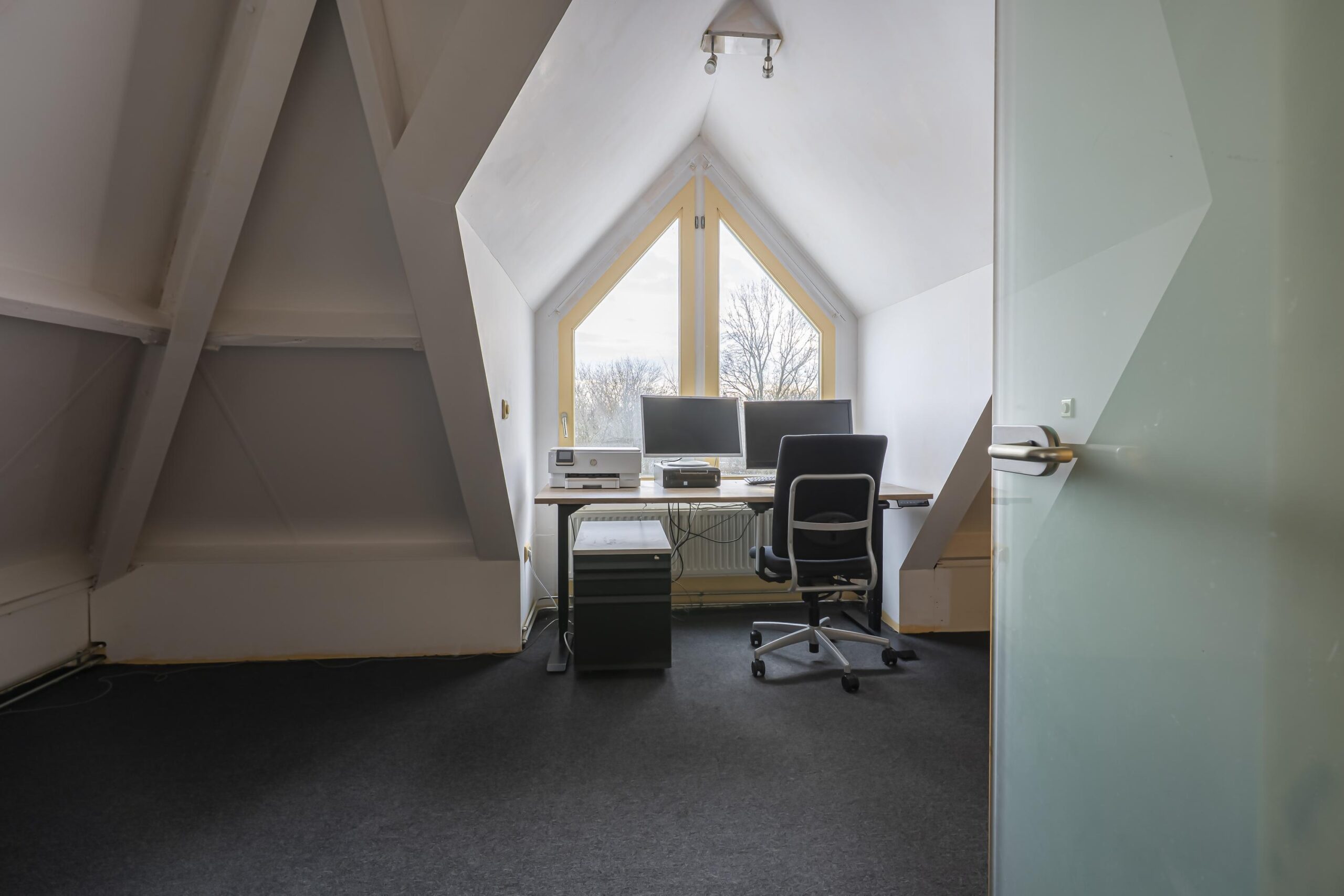 Via een vaste trap bereikt u de royale tweede verdieping, waar zich de vierde slaapkamer bevindt. Deze ruimte is momenteel in gebruik als kantoor/bergruimte en biedt een fraai uitzicht over het parkje aan de voorzijde. Tevens bevinden zich hier de cv-installatie (Remeha, bwj. 2014, huur) en tweede aansluitpunt voor witgoed.