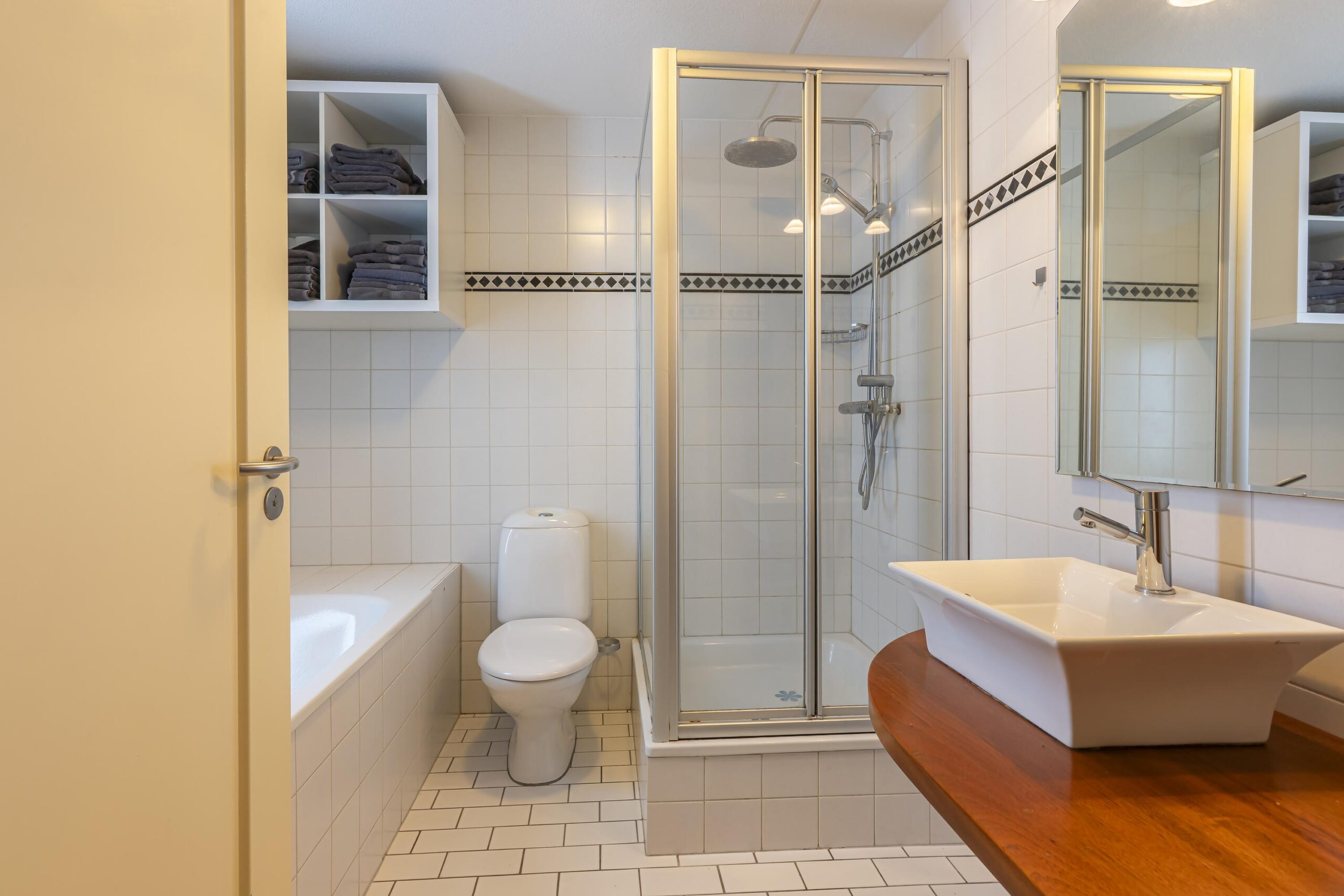 De geheel betegelde badkamer is compleet uitgerust met een douche, ligbad, tweede toilet, wastafel, radiator en mechanische ventilatie.