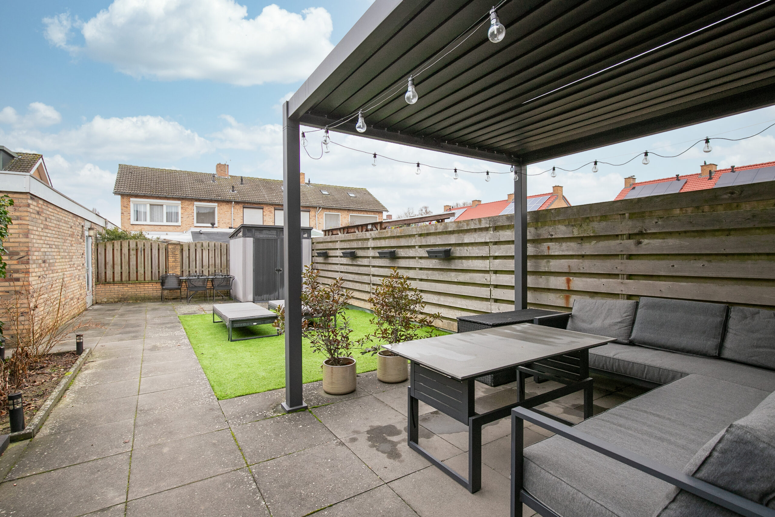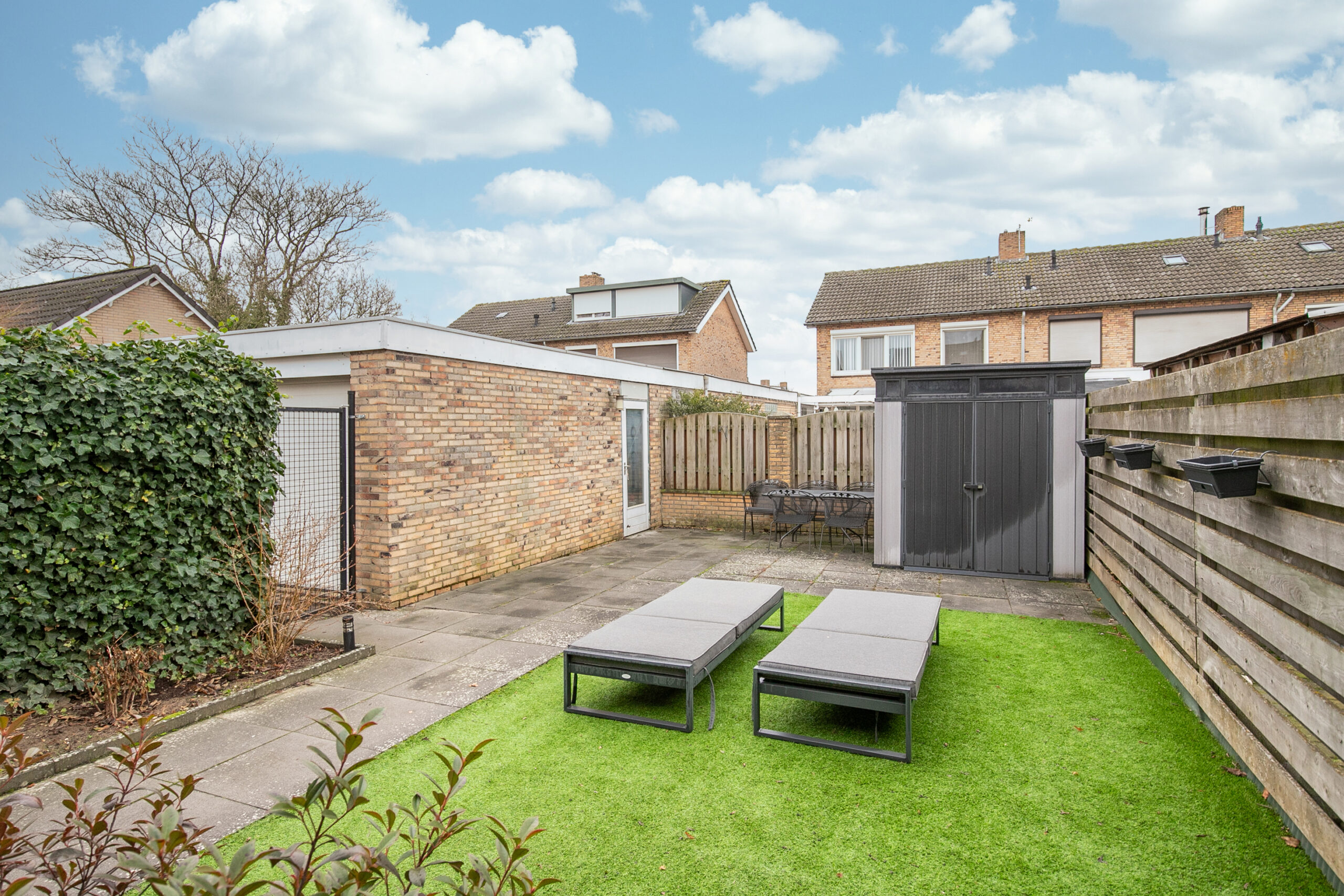 De achtertuin is westelijk georiënteerd, geheel omheind en voorzien van twee terrasoverkappingen, betegeling en border met beplantingen. Er is een praktische kunststoffen tuinberging (circa 4 m2) en een vrijstaande garage (circa 18 m2) voorzien van sectionaal poort en elektra. De voortuin is deels voorzien van beplanting en deels voorzien van betegeling. Er is een lange oprit alwaar plek is voor meerdere auto’s.