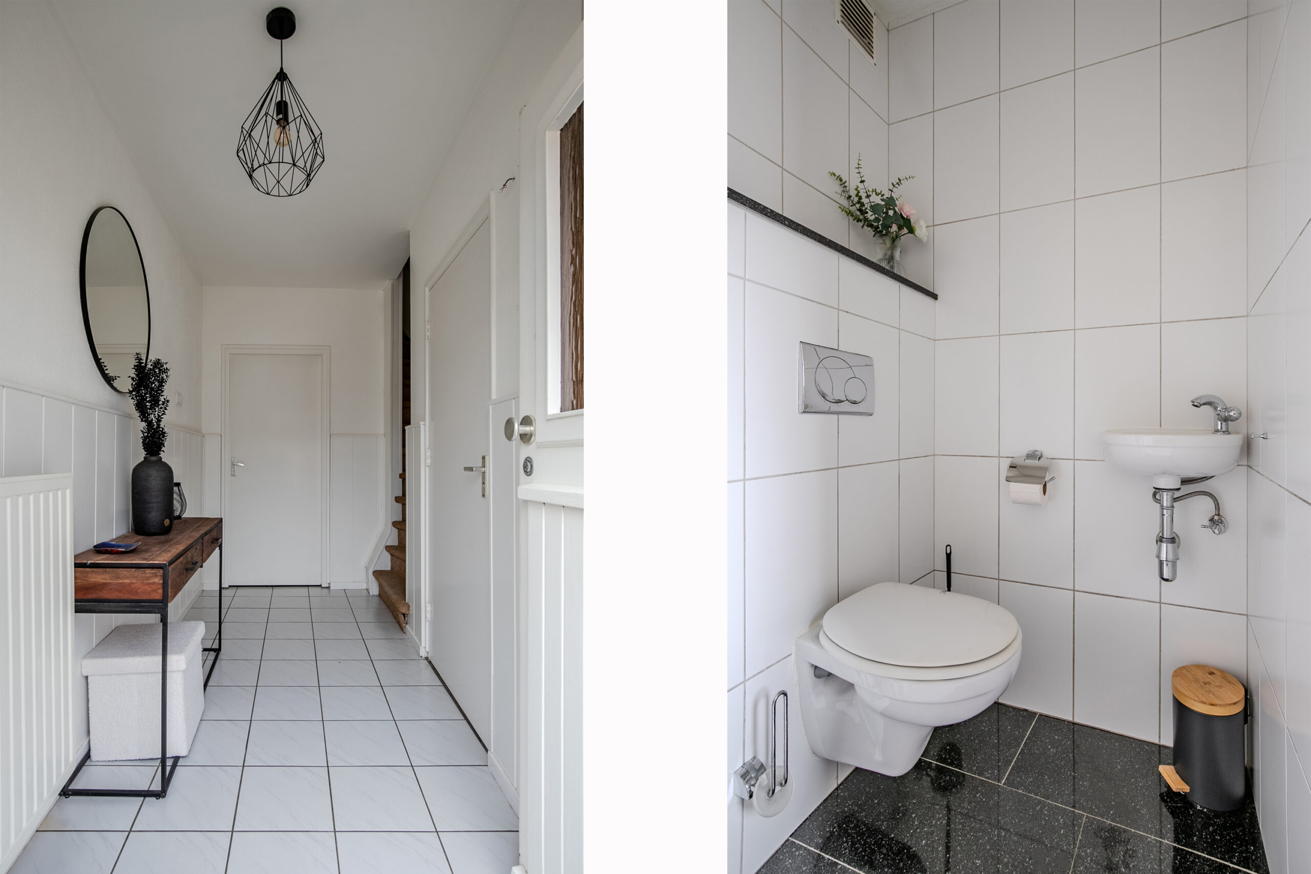 Ontvangsthal voorzien van tegelvloer met meterkast, trapopgang en toegang tot de keuken en toilet. Betegelde toiletruimte met zwevend closet en fonteintje.