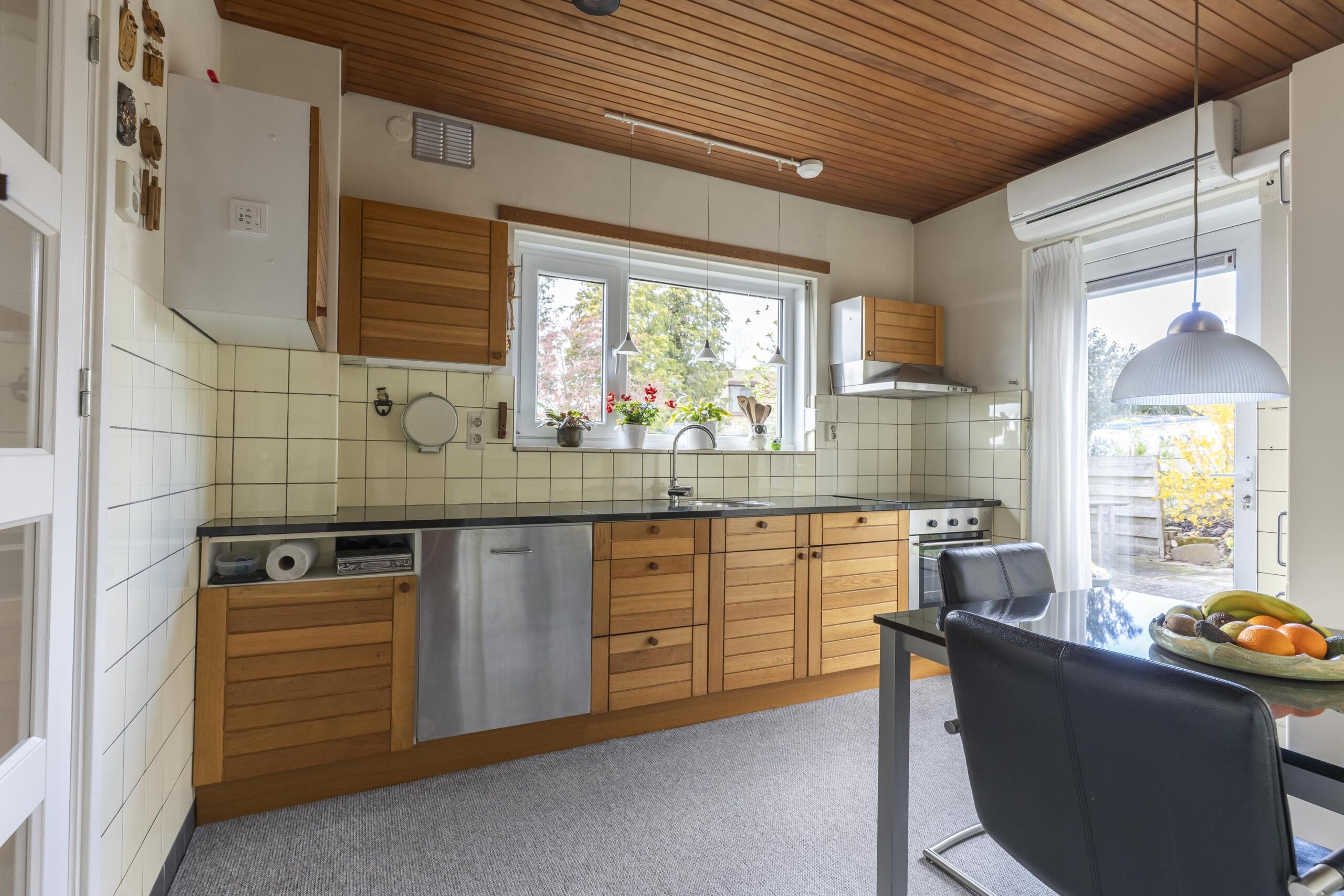 De gesloten keuken is groot ca. 10 m² en is voorzien van vloerbedekking, airco en een rechte keukenopstelling met de navolgende apparatuur: elektrische kookplaat, oven en koelkast. De keuken biedt toegang tot de achtertuin.