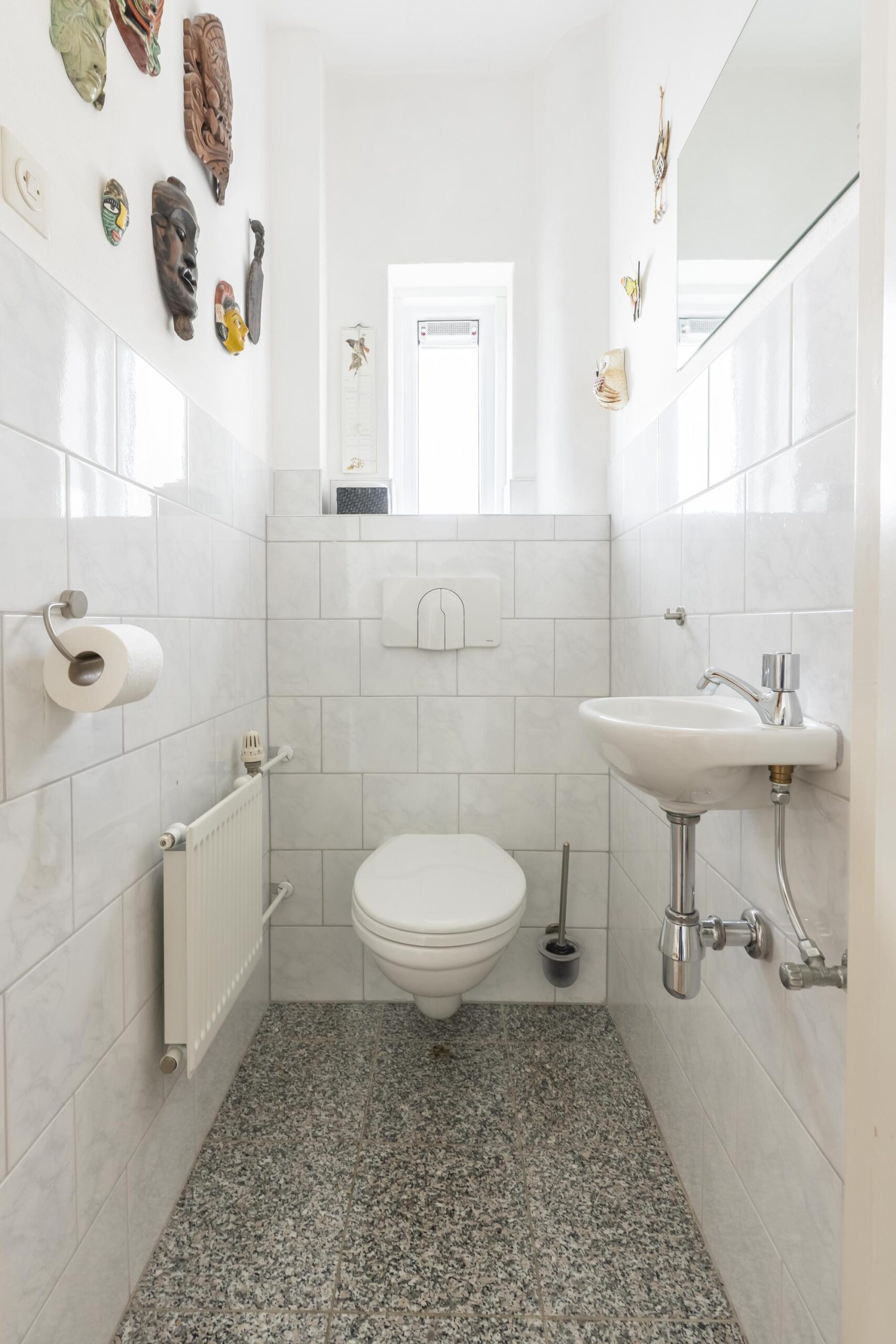 Hal met meterkast, trapopgang en gastentoilet met zwevend toilet en fonteintje, biedt tevens toegang tot de gesloten keuken.