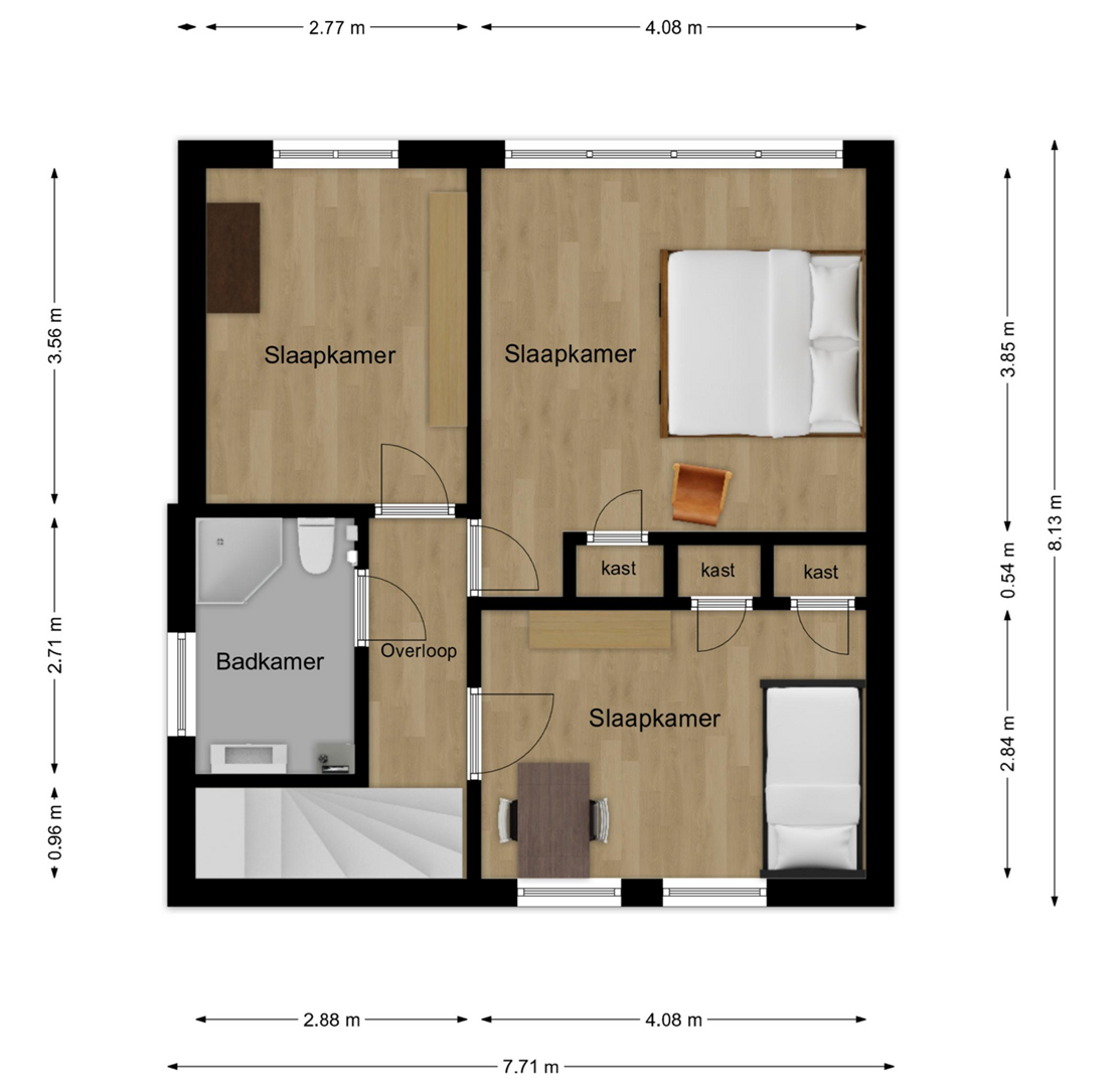 De slaapkamers zijn respectievelijk groot ca. 19m², 12 m² en 10 m² en zijn voorzien van een laminaatvloer en muurkasten.