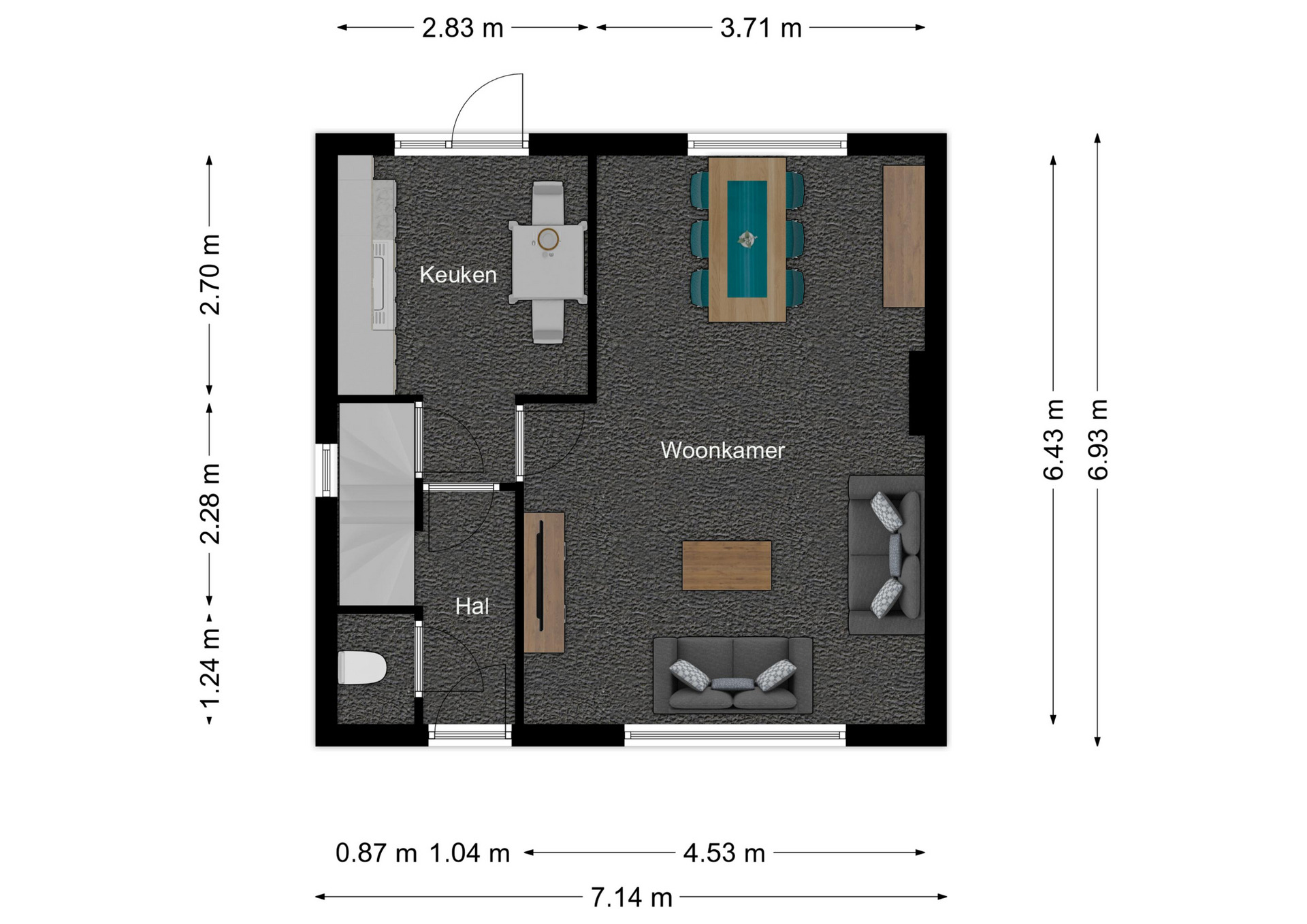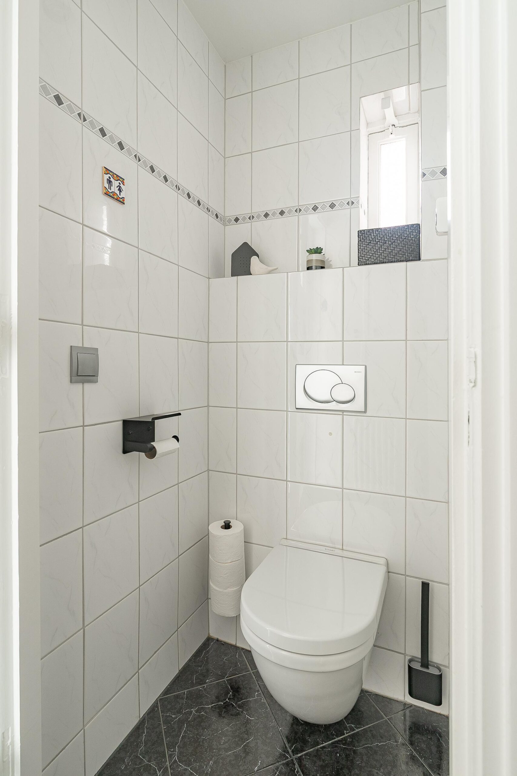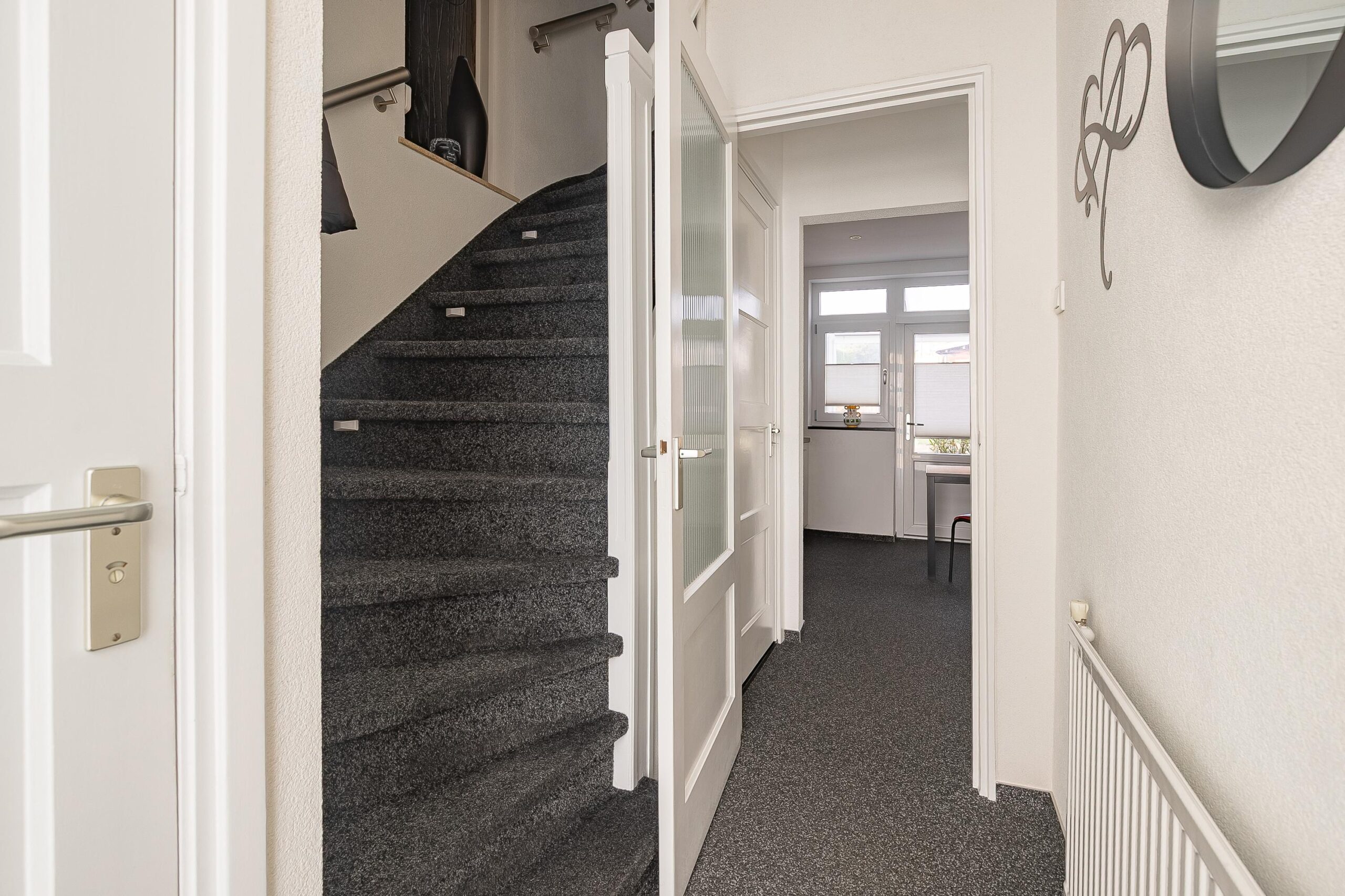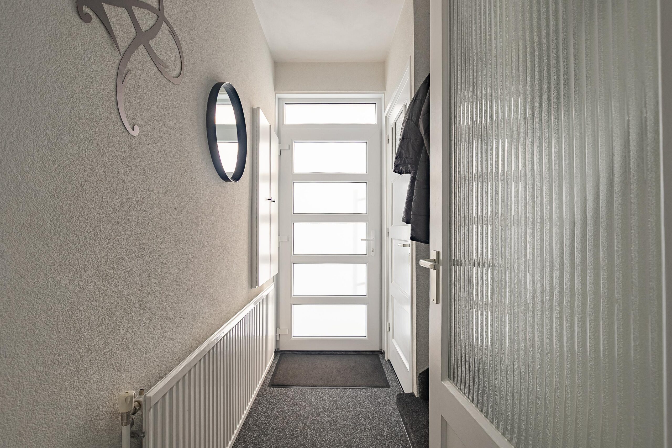 Onderhoudsvriendelijke voortuin met ruime oprit voor het plaatsen van diverse auto’s. Ontvangsthal met trap naar de eerste verdieping, meterkast en betegelde toiletruimte.