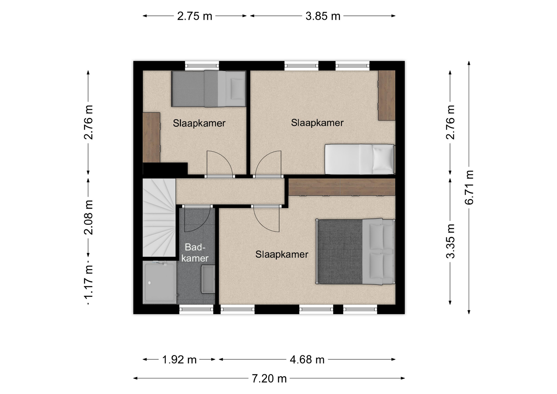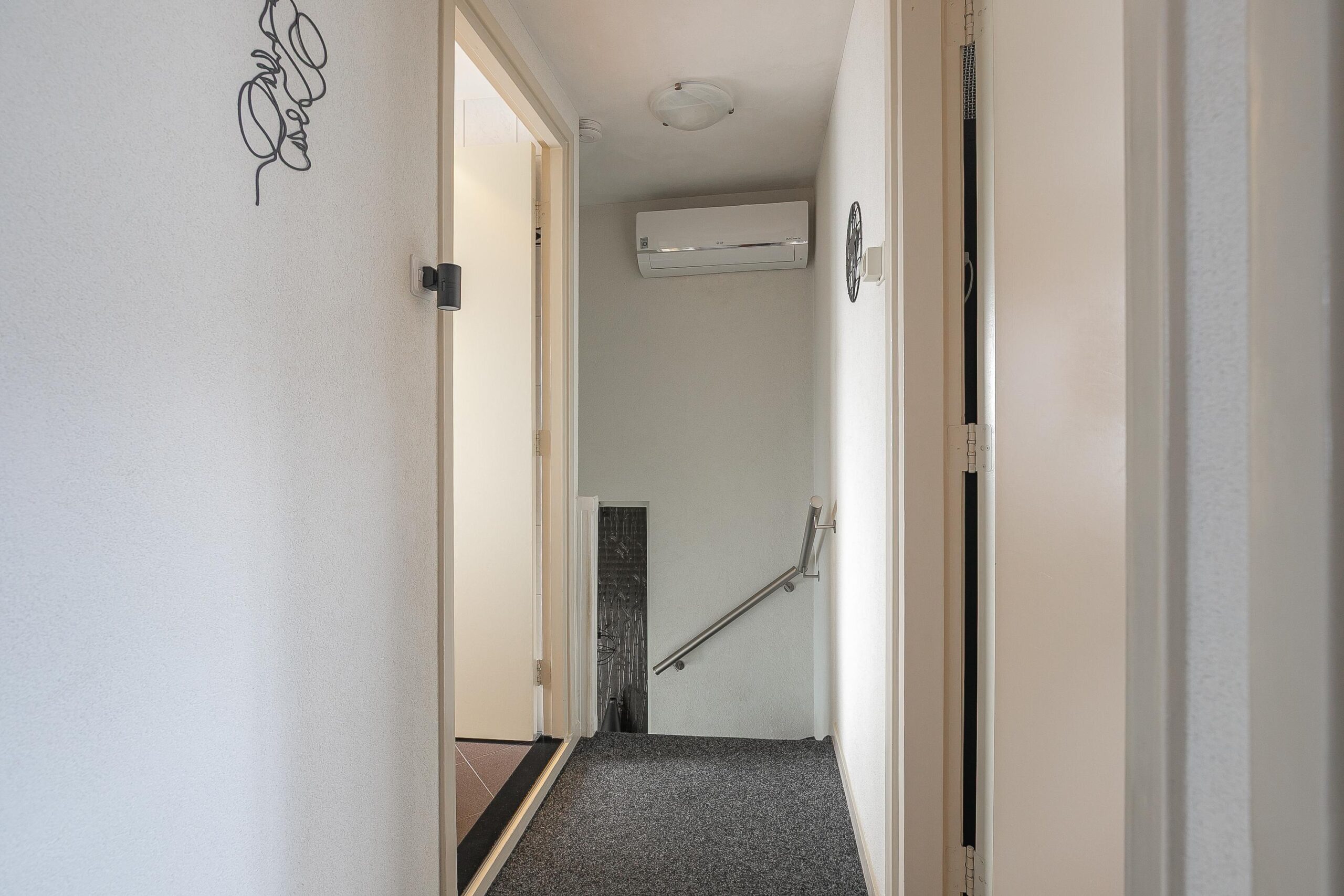 Overloop met toegang naar drie slaapkamers respectievelijk 14m2, 10m2 en 7m2 groot. Op de overloop is een airconditioning aanwezig die de gehele bovenverdieping kan koelen of verwarmen.