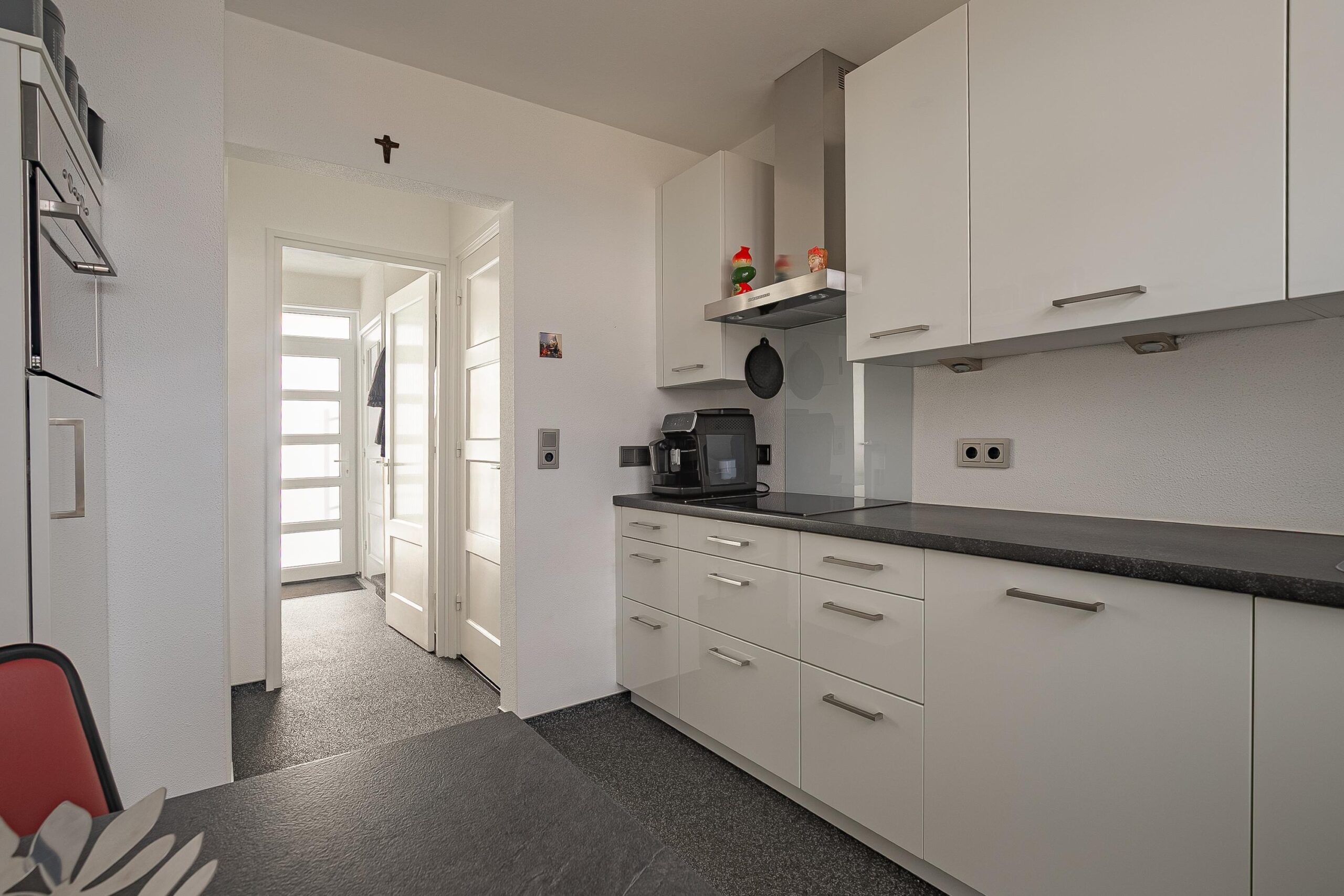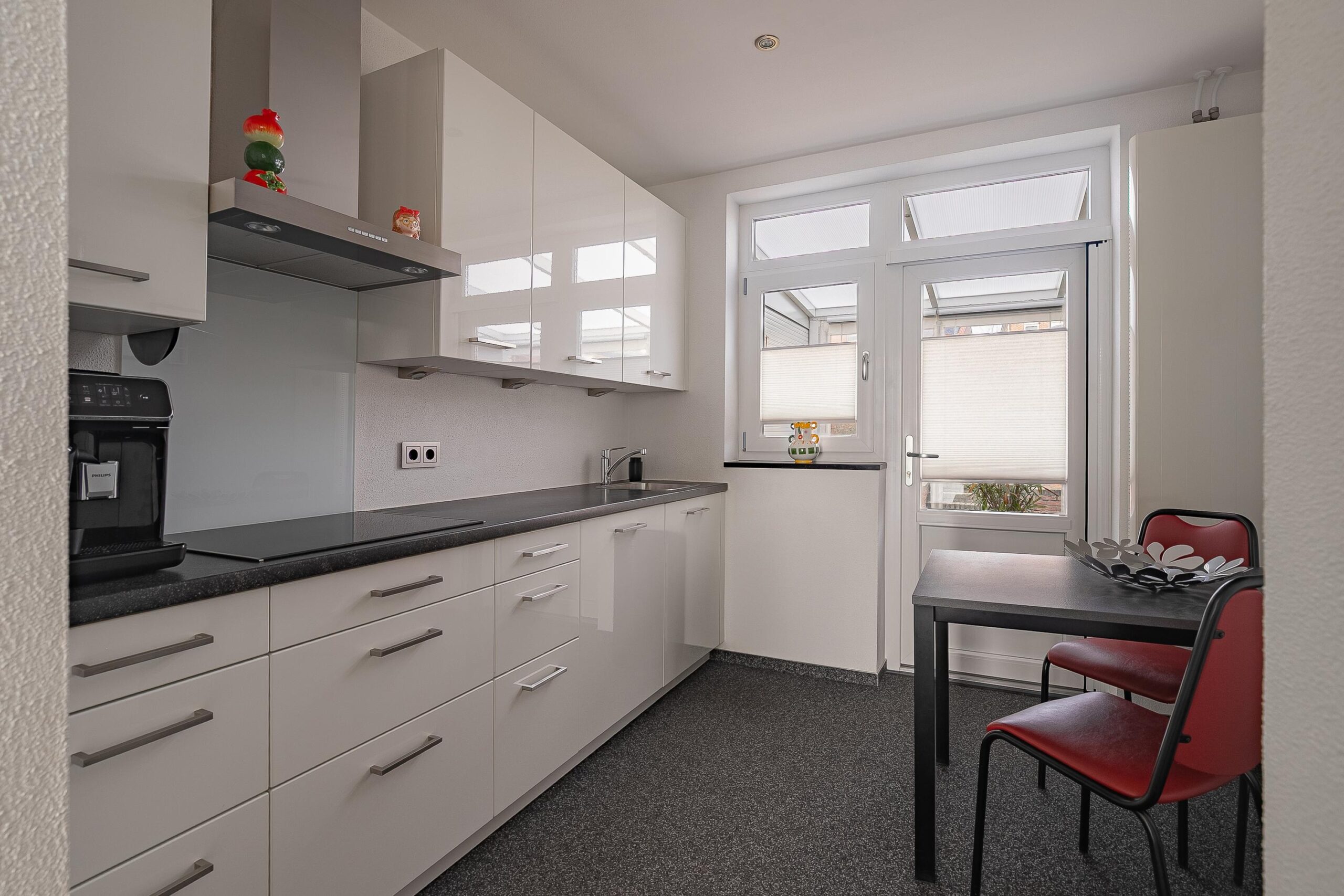 De keuken is voorzien van een hoogglans keuken in wandopstelling met de volgende apparatuur: inductiekookplaat, afzuigkap, vaatwasser, oven en koelkast.