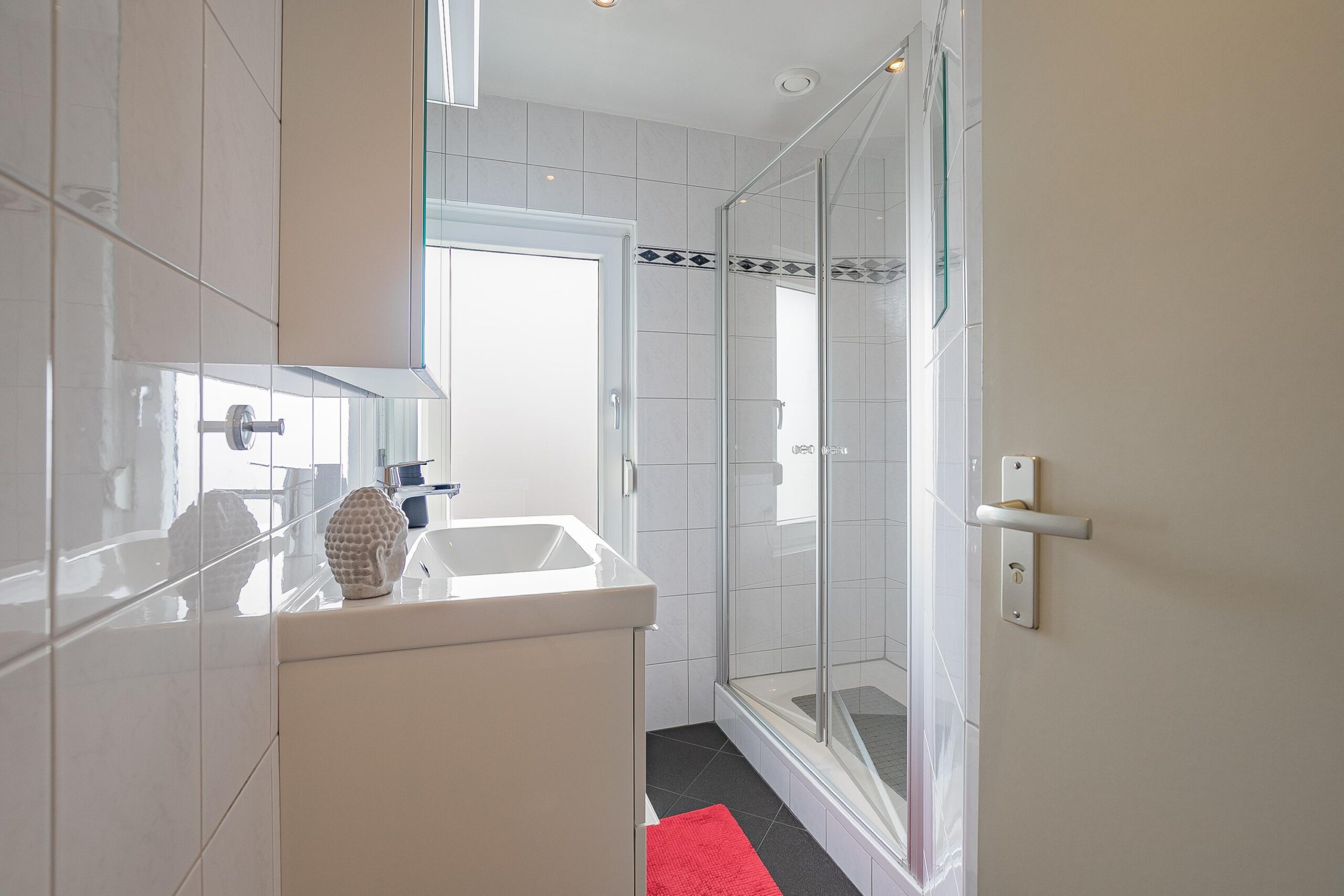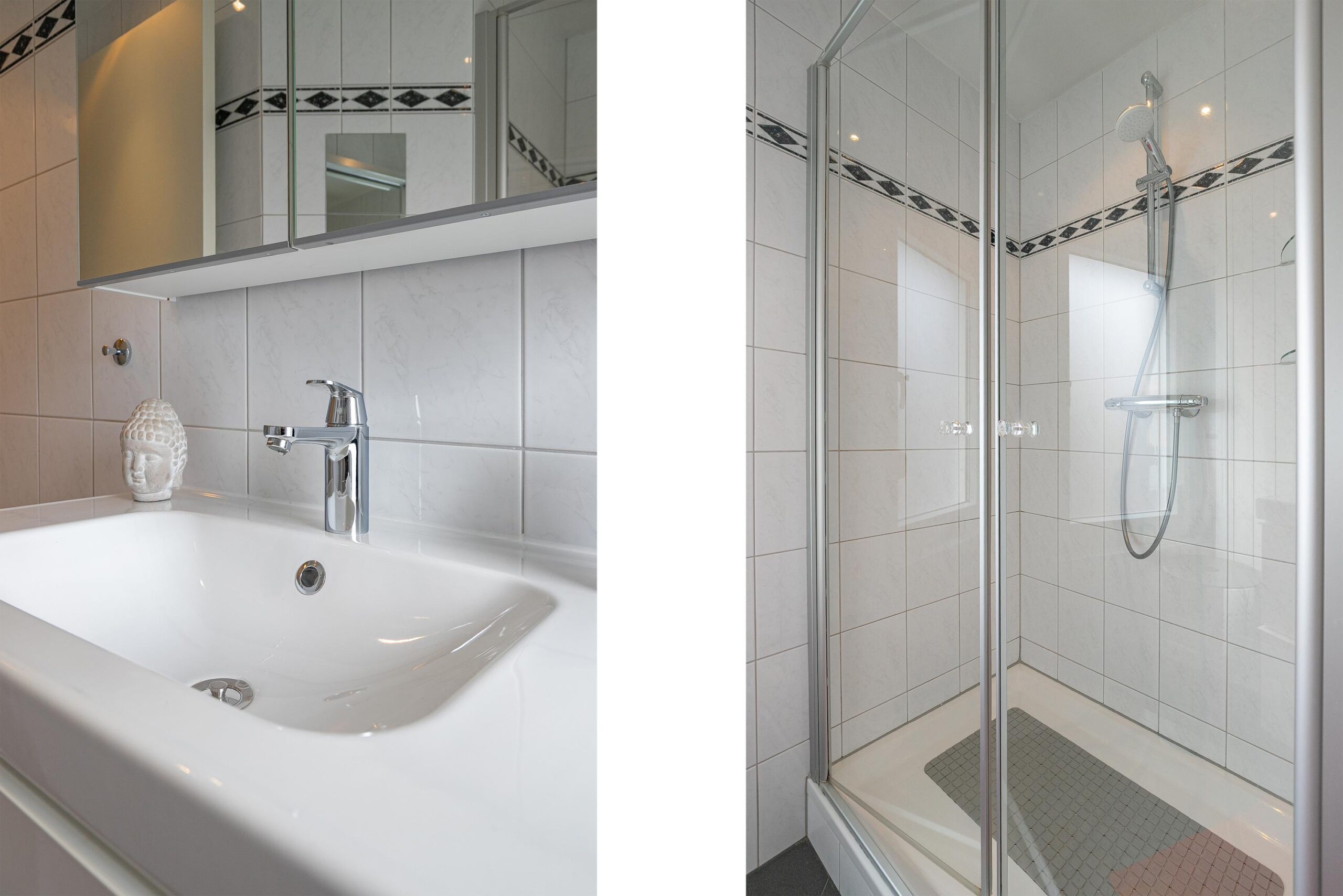 De geheel betegelde badkamer is uitgerust met een doucheruimte met glazen deuren en en wastafel met meubel en spiegelkast.